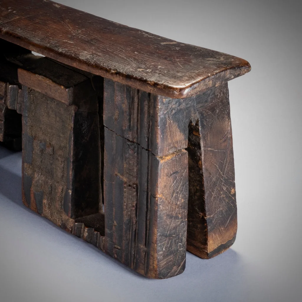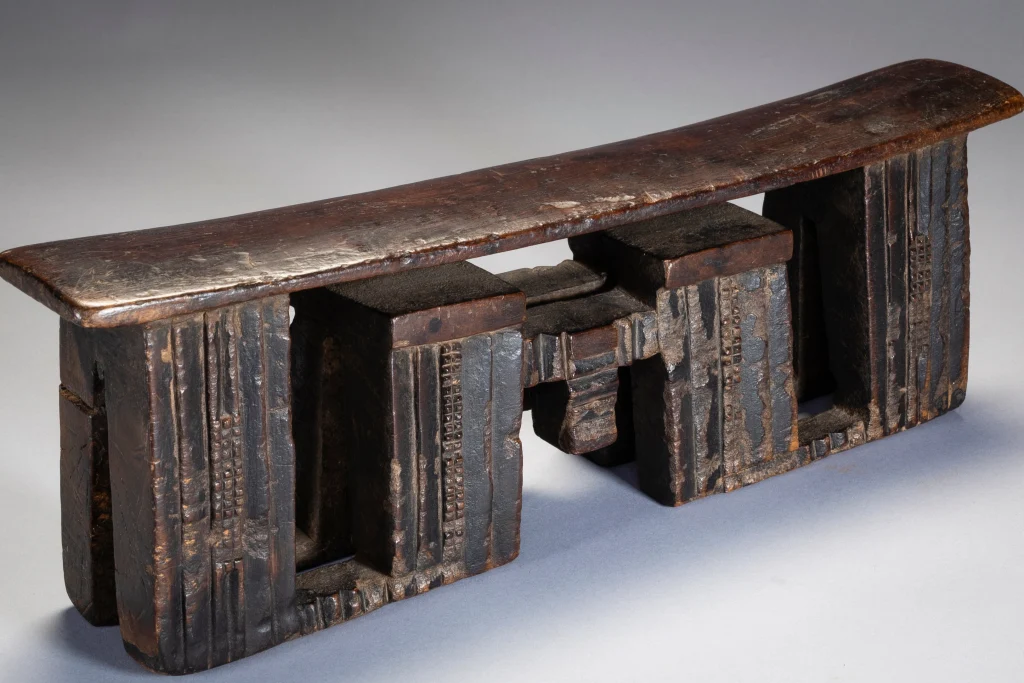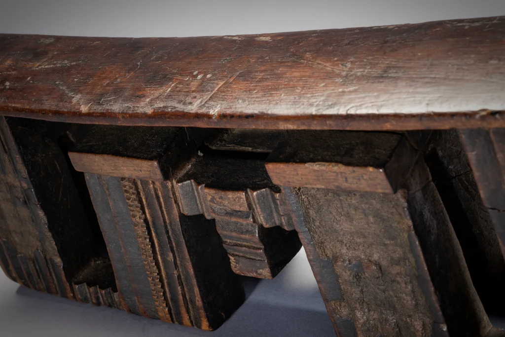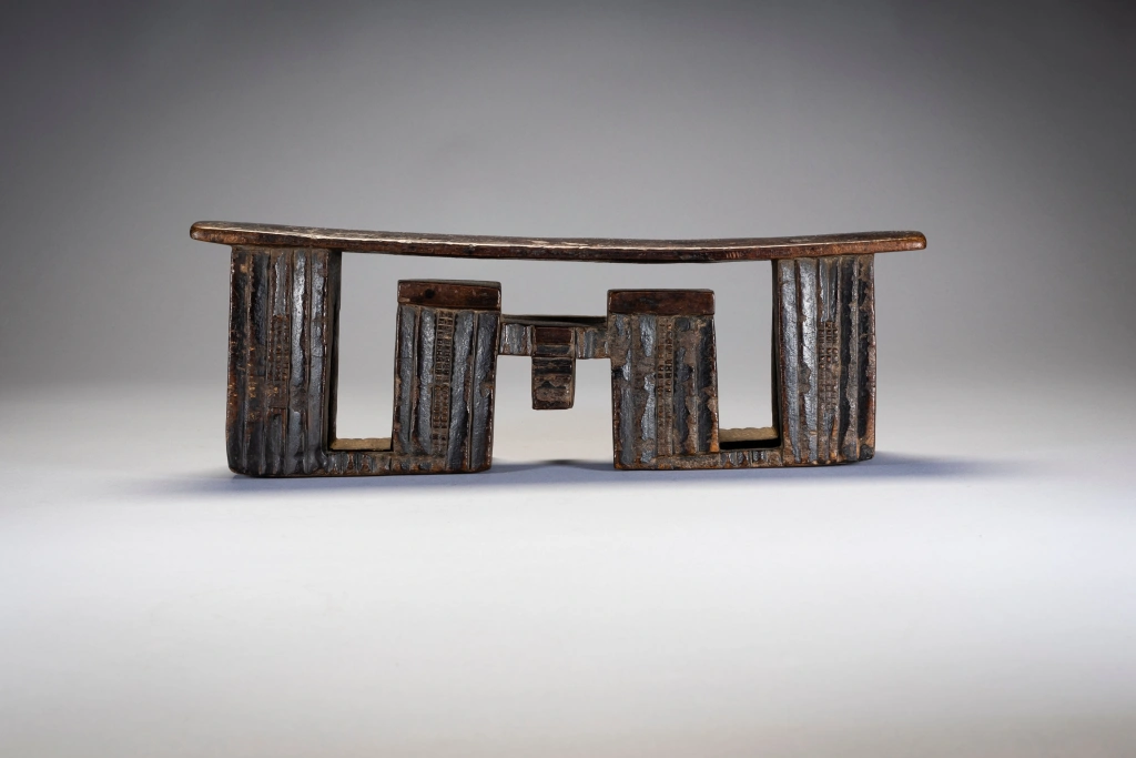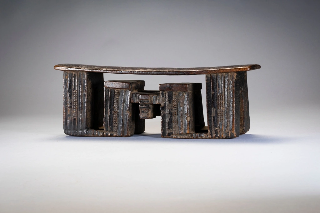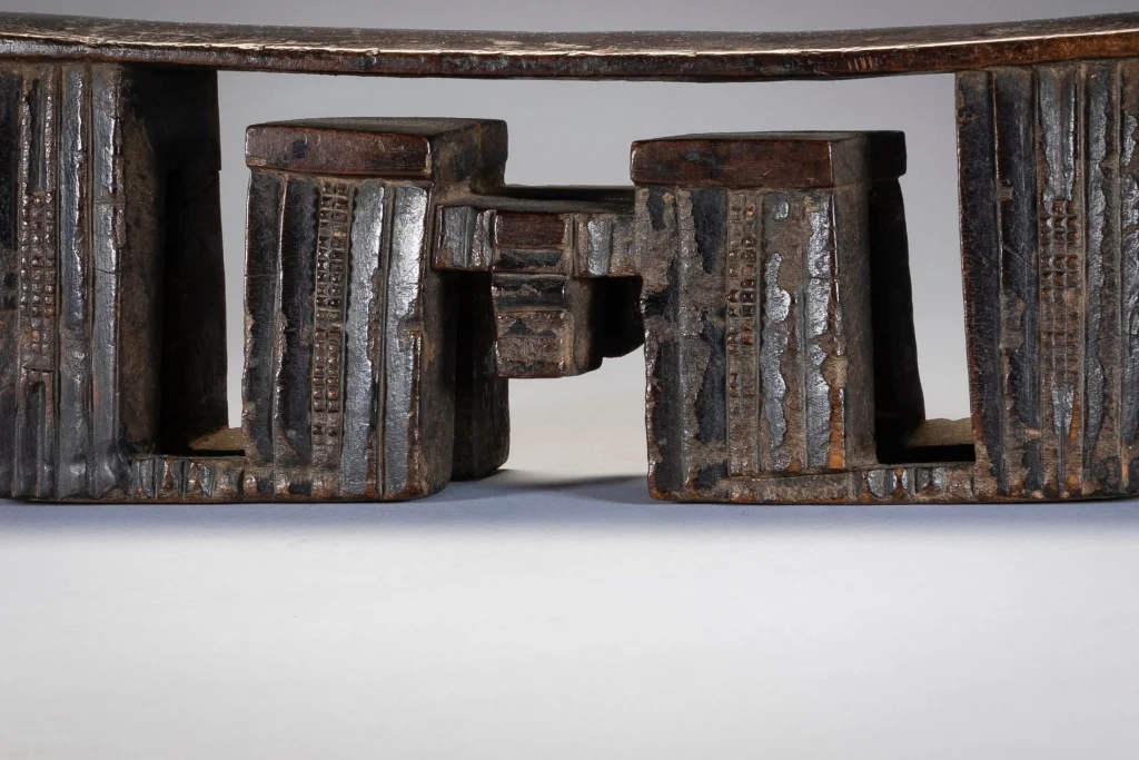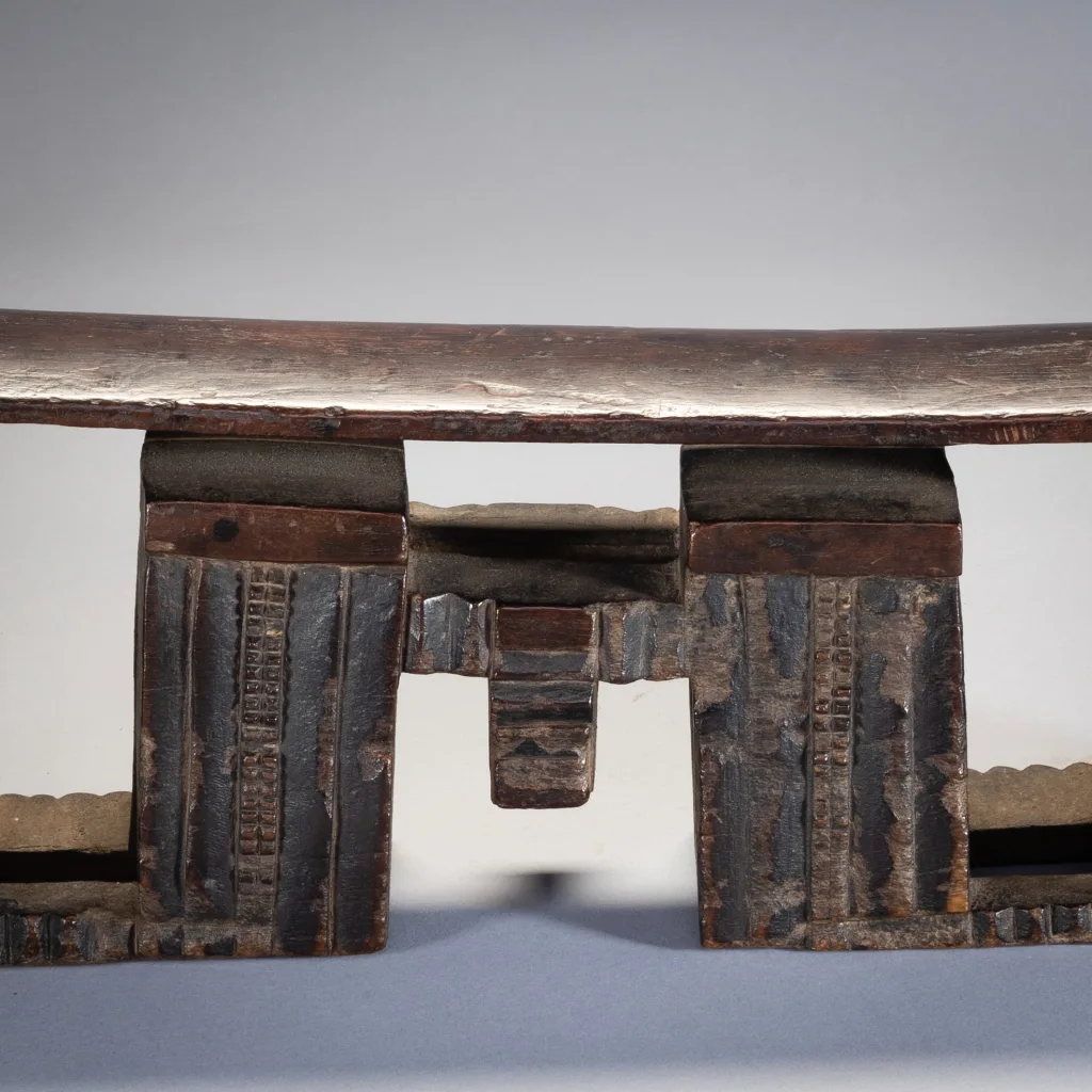 Un vieil appui-tête très usé fabriqué par Mashayidamu Dladla. Il s’agit d’un prototype. Sur les photos, nous pouvons clairement voir que le sculpteur a divisé la partie supérieure et la partie inférieure de l’appui-tête sur toute sa longueur à l’aide de mini-plateforme non noircies.Mashayidamu Dladla était un sculpteur originaire d’Entanyane à Muden, un canton en Afrique du Sud. Il est considéré par beaucoup comme le meilleur sculpteur de bois de sa génération. Il est mort octogénaire en 1997. Il a pu de son vivant fabriquer une multitude d’appui-têtes allant du simple au plus complexe la plupart de ses œuvres étant embellies grâce à des cannelures verticales séparées par une double rangée « d’amasumpa » et d’arêtes. Son style de sculpture à 6 jambes est très populaire, avec une multitude de ses œuvres trouvables dans de multiples musées et collections à travers le monde.