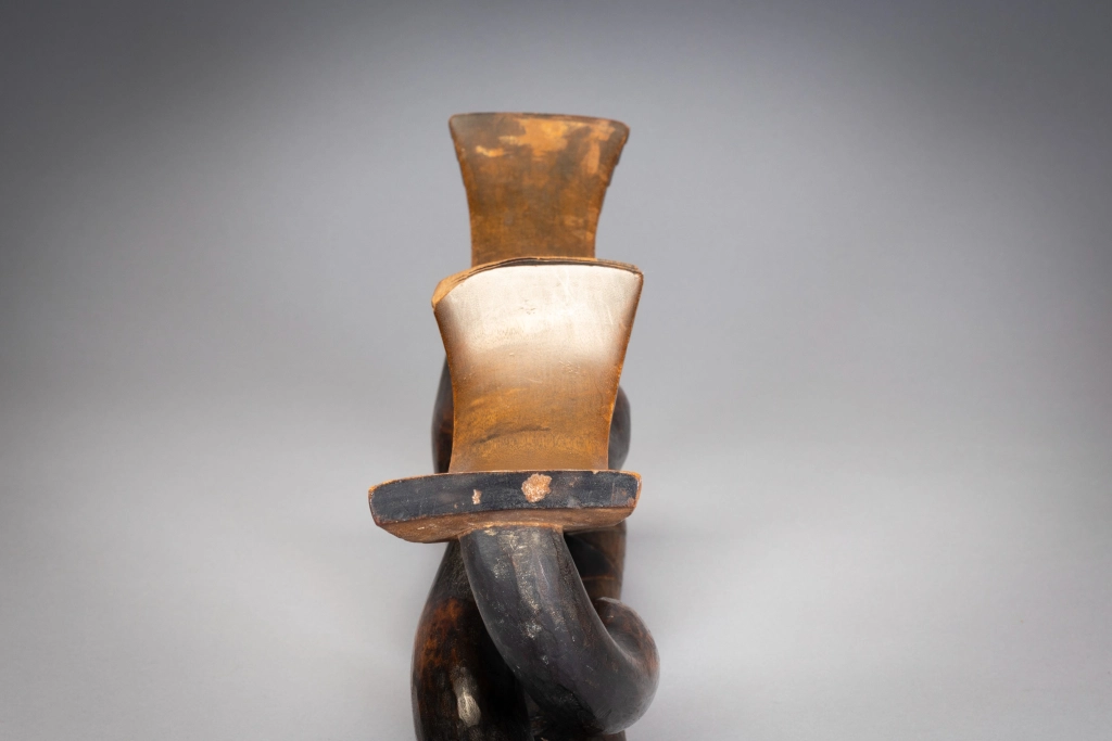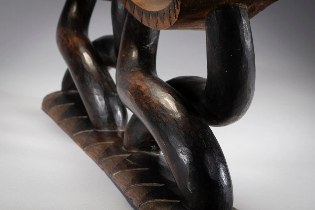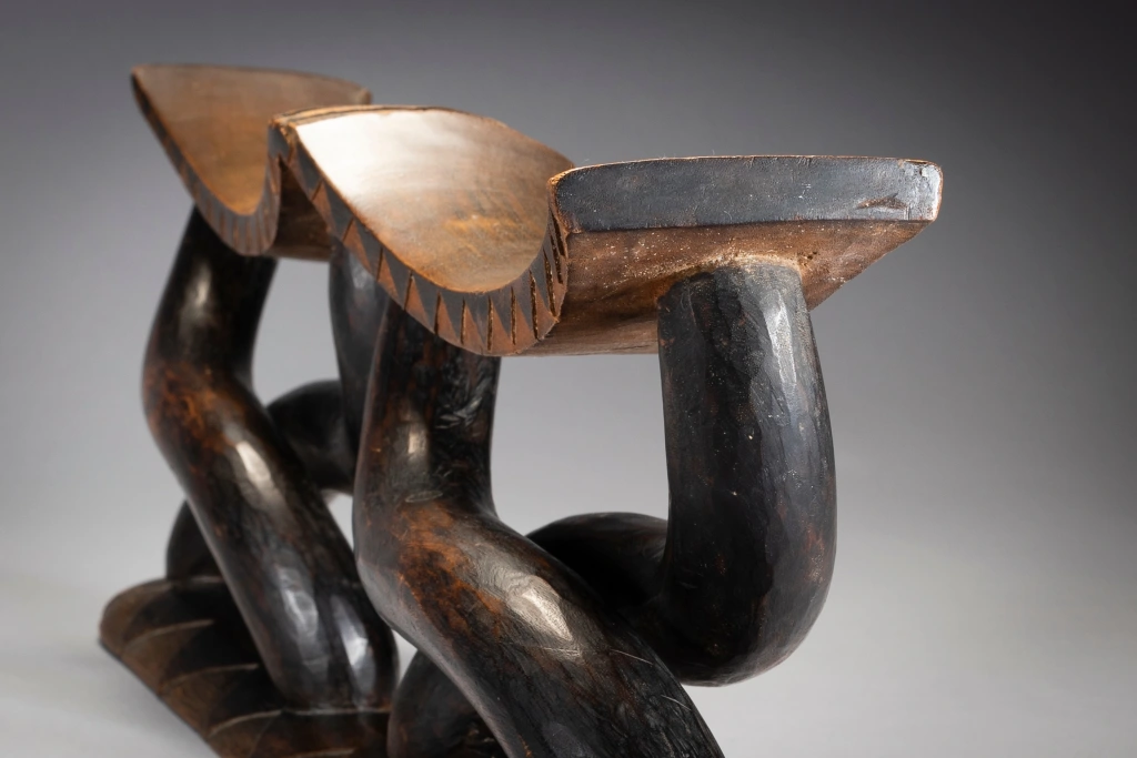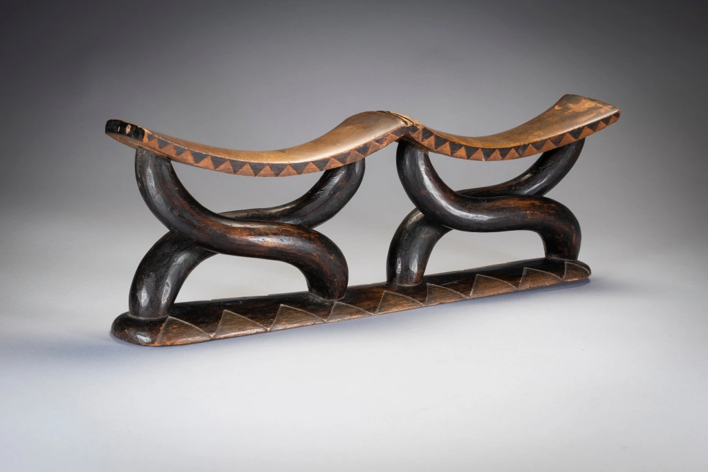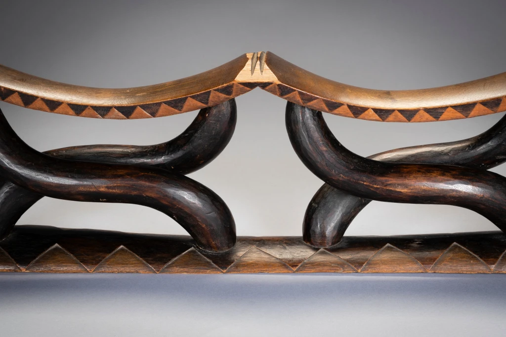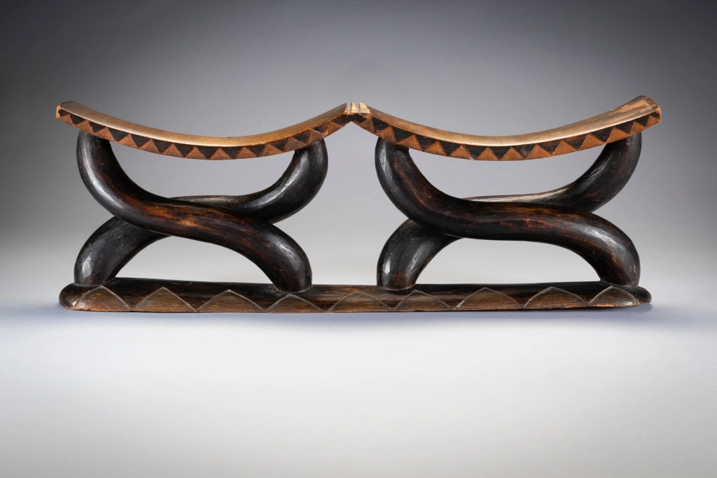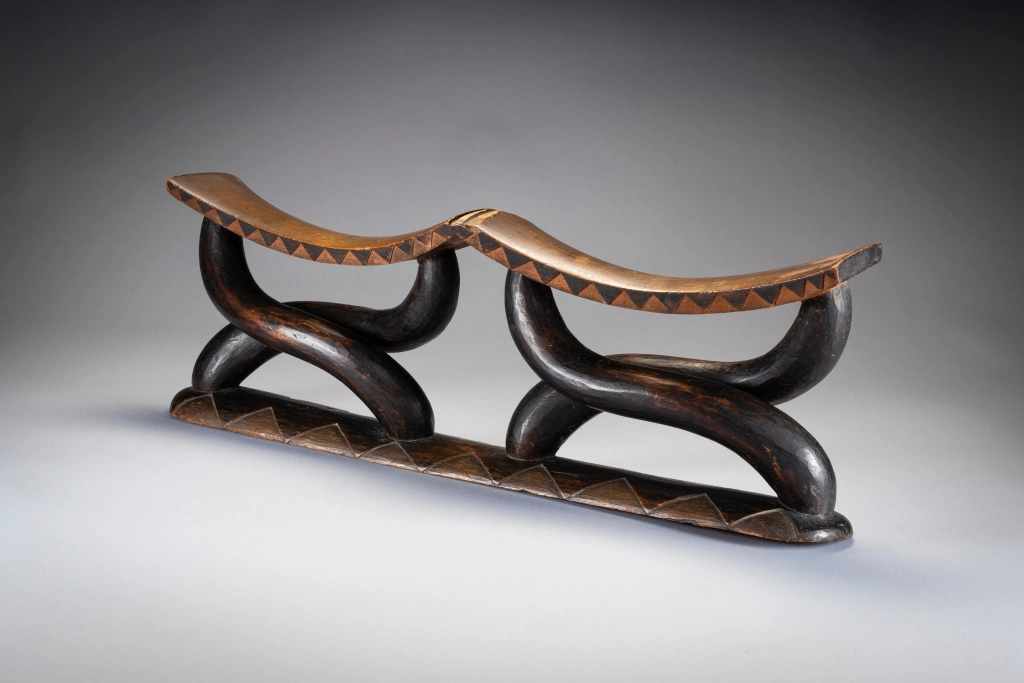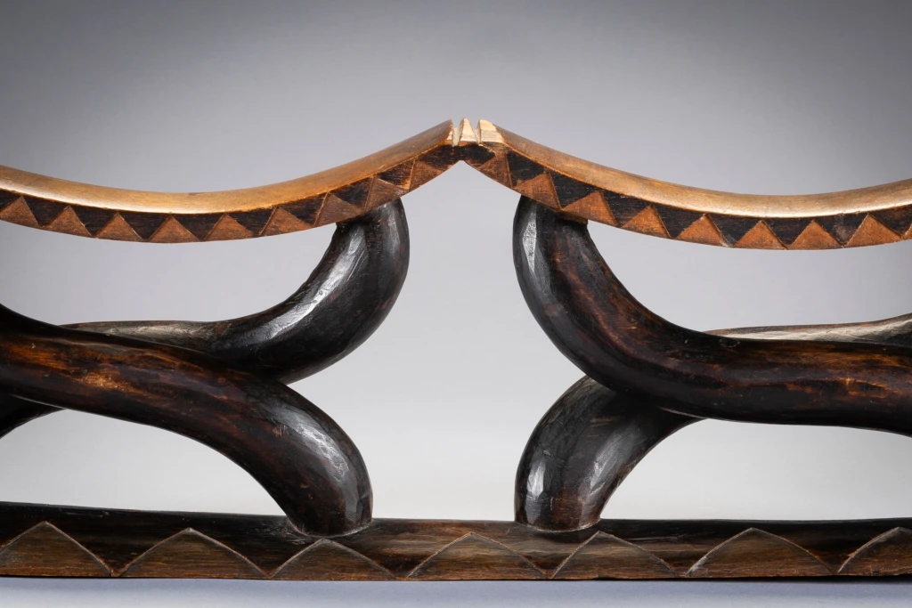 Il s’agit d’un magnifique appui-tête à 2 parties habilement sculpté avec des piliers et des plateformes lisses. Comme des danseurs, les pieds de l’appui-tête soutiennent les 2 parties supérieures et élevant sans effort les deux plateformes. Son esthétique et son originalité en font une star très souvent représentée dans les ouvrages sur les appuis-tête . la pièce similaire représentée dans l’ouvrage Austausch a été acquise en 1896 , et aurait pu être sculptée au milieu du 19eme siècle.