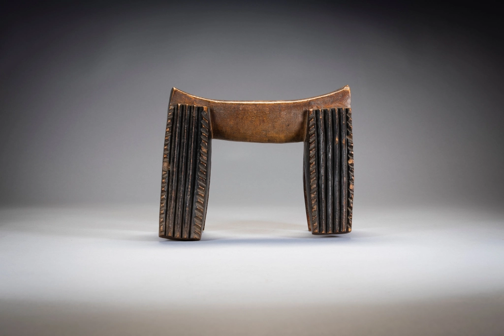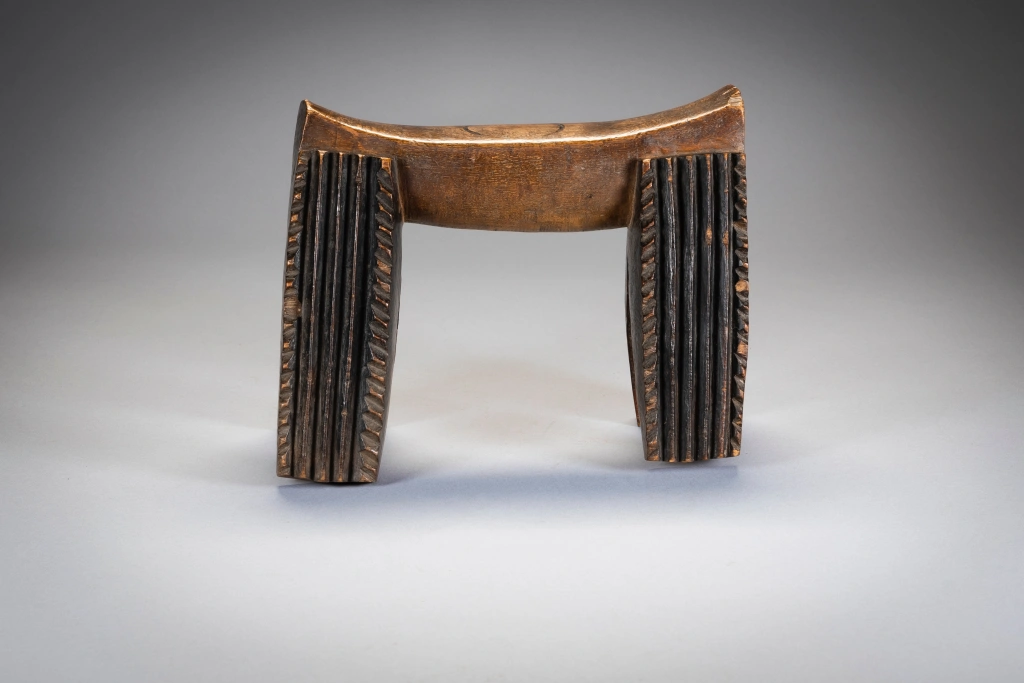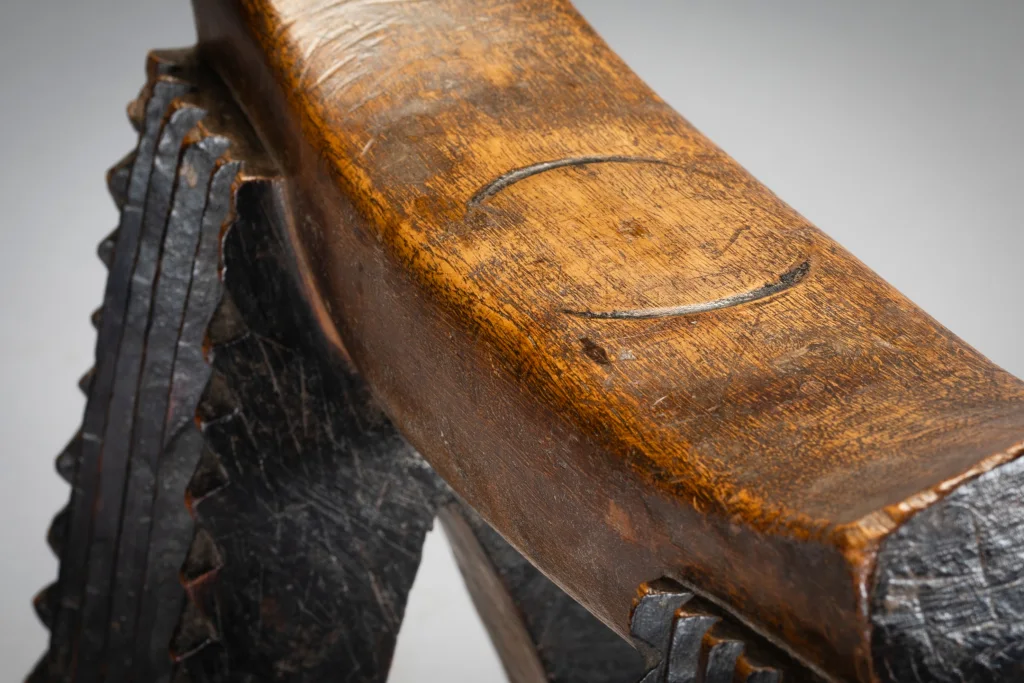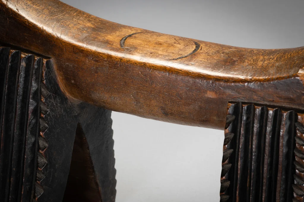 Un petit appui-tête avec un style inhabituel avec une petite partie supérieure courbée. Ses pieds sont décorés avec des combinaisons de cannelures et de lignes d' »amasumpa ». L’appui-tête renvoie un peu à un style « Swazi ». Ces originalités expliquent probablement l’enthousiasme qu’il a suscité lors d’enchères à Amsterdam chez Christies.
