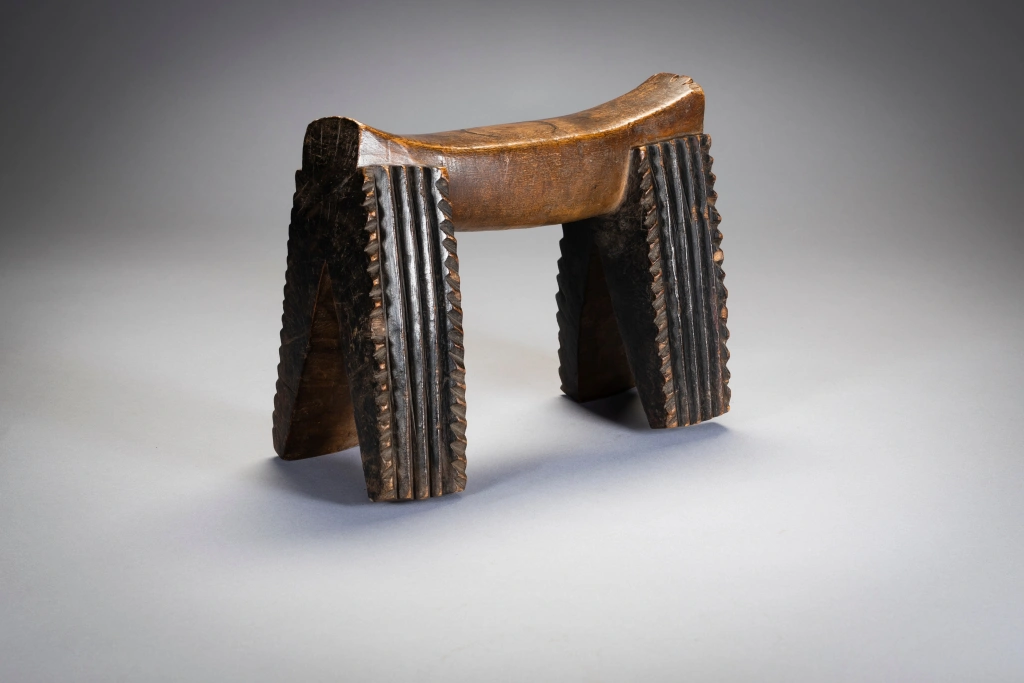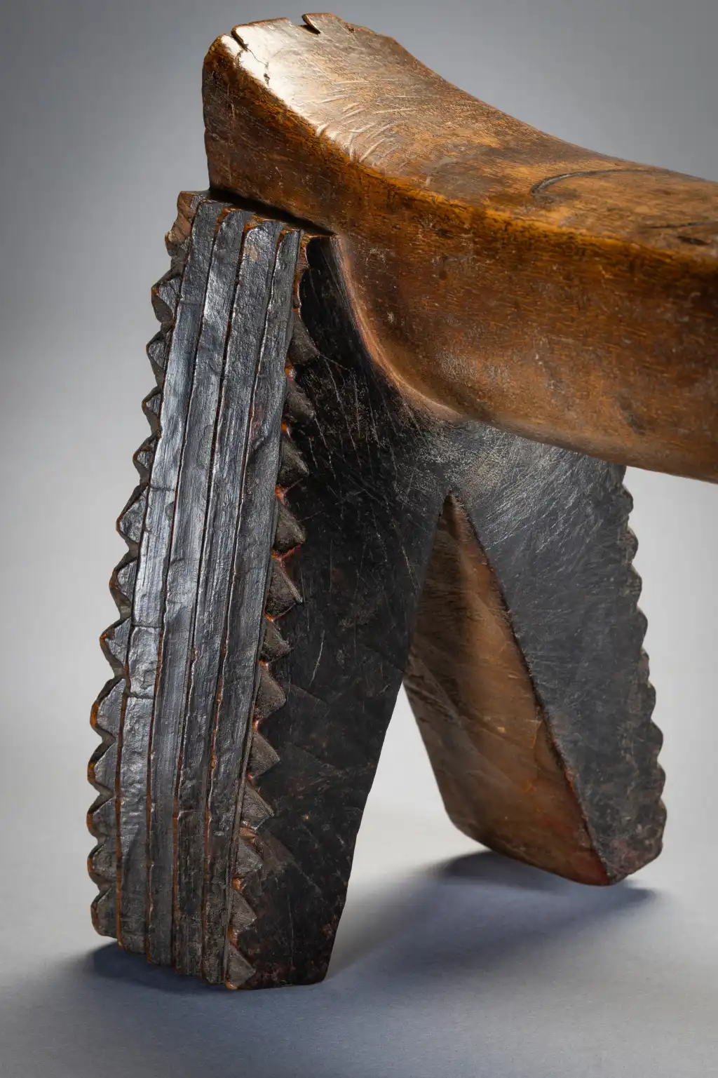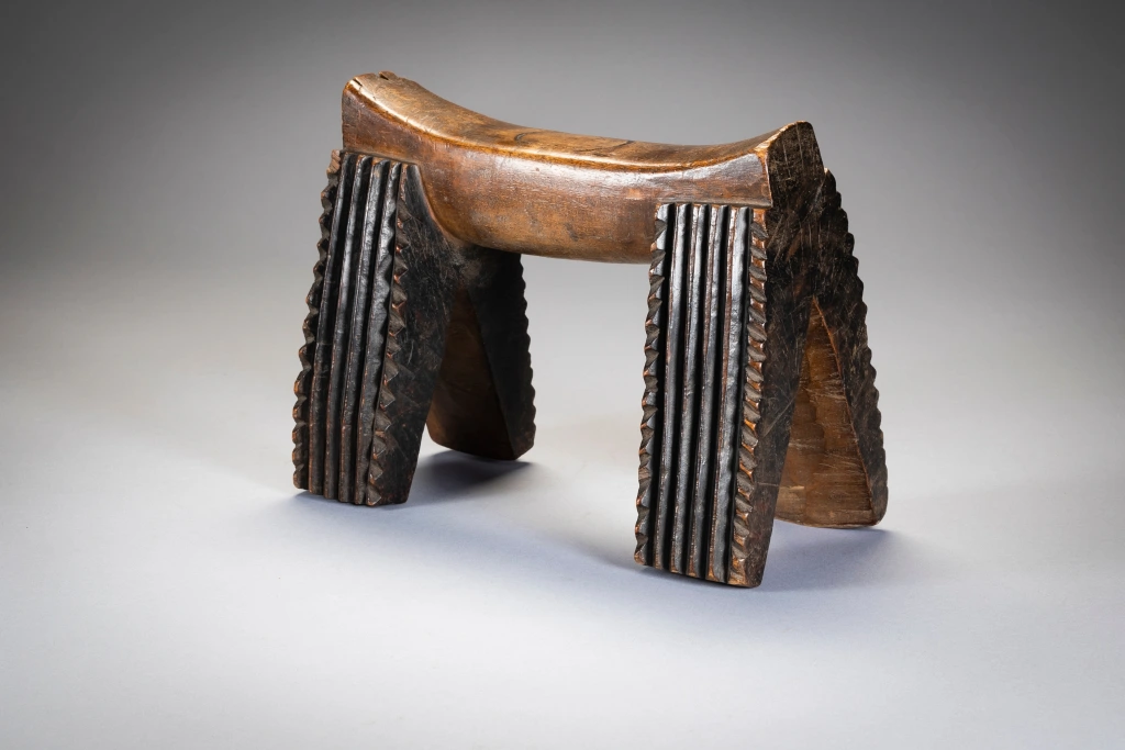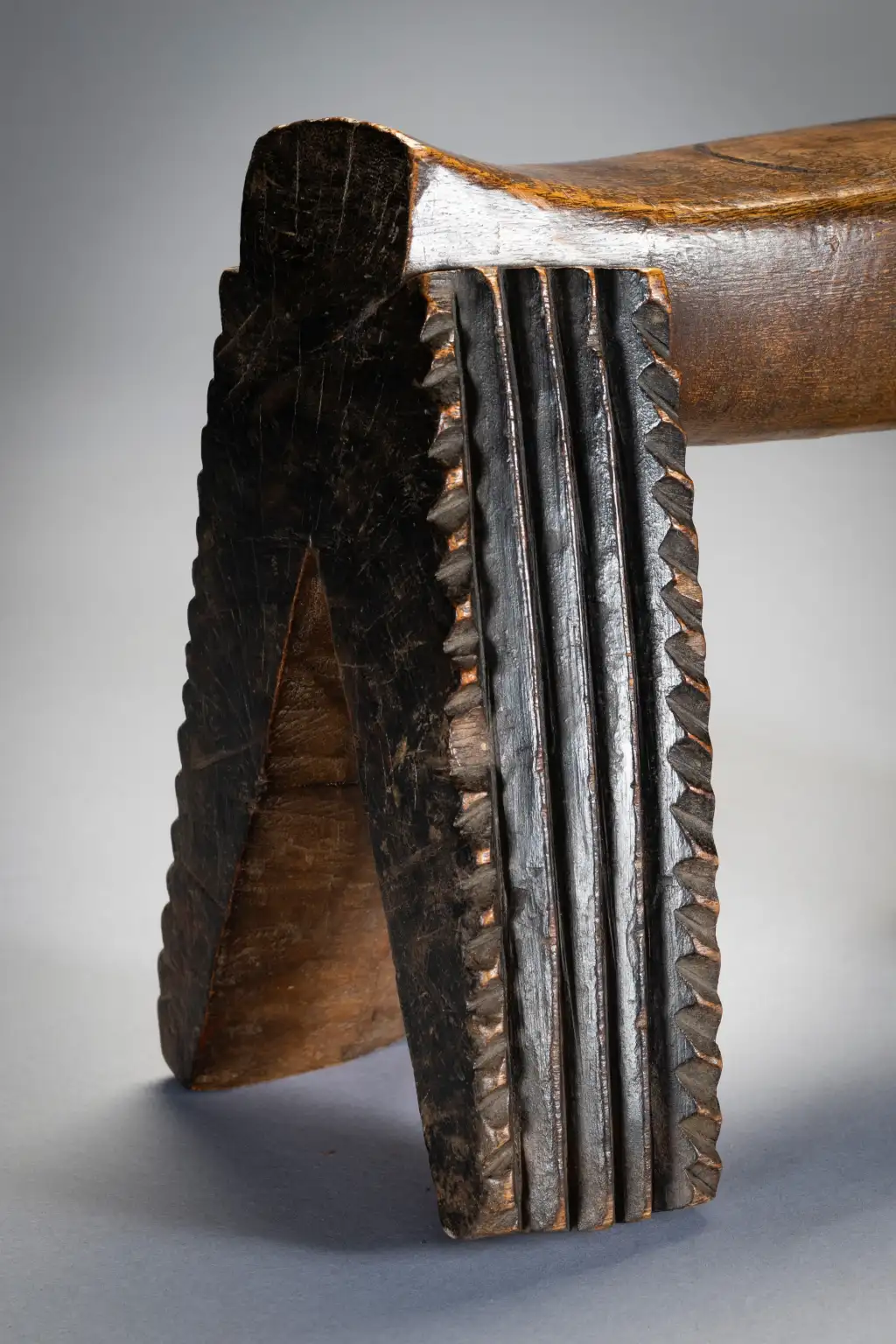 Un petit appui-tête avec un style inhabituel avec une petite partie supérieure courbée. Ses pieds sont décorés avec des combinaisons de cannelures et de lignes d' »amasumpa ». L’appui-tête renvoie un peu à un style « Swazi ». Ces originalités expliquent probablement l’enthousiasme qu’il a suscité lors d’enchères à Amsterdam chez Christies.
