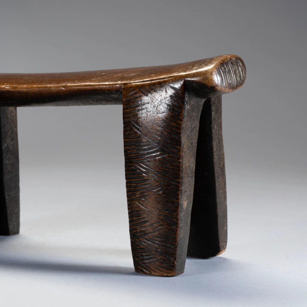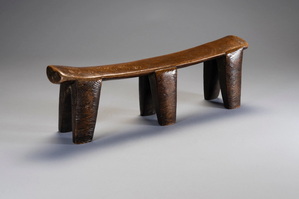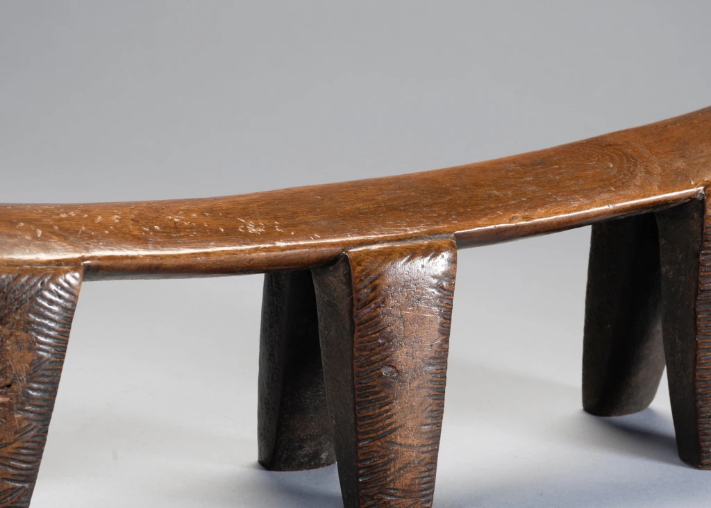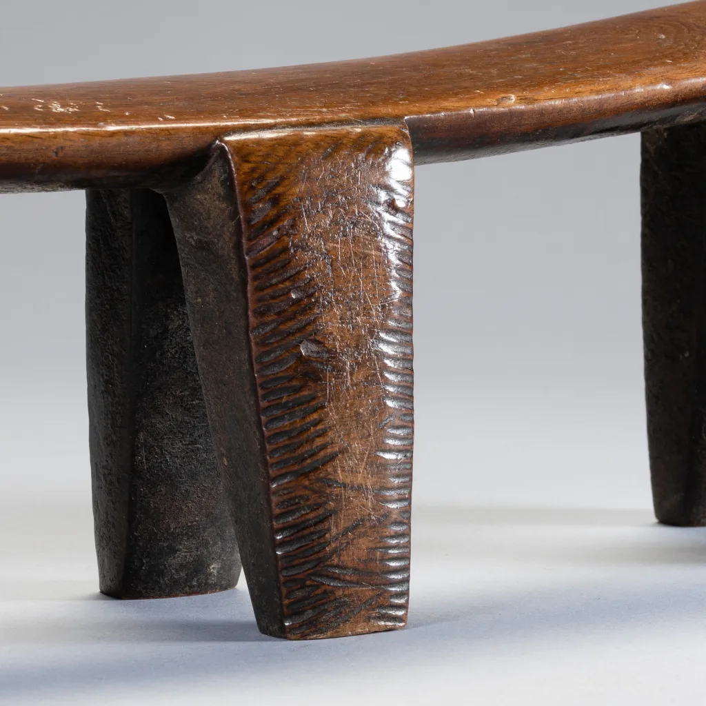 Il s’agit d’un appui-tête à 6 jambes du XIXe siècle. Il a été sculpté à partir d’un bois dur légèrement rouge peut-être du Kiaat. Les pieds de l’appui-tête sont légèrement carrés. Comme d’autres appui-têtes de style « Amasondo » ou « pieds de vaches », cet appui-tête est couvert de hachures que les Zoulous appellent « Ndlela yizegoli »: (Les chemins vers Johanensburg)