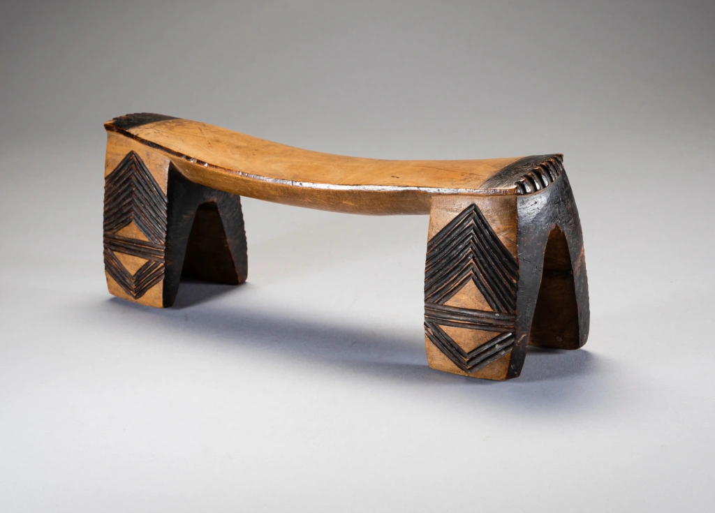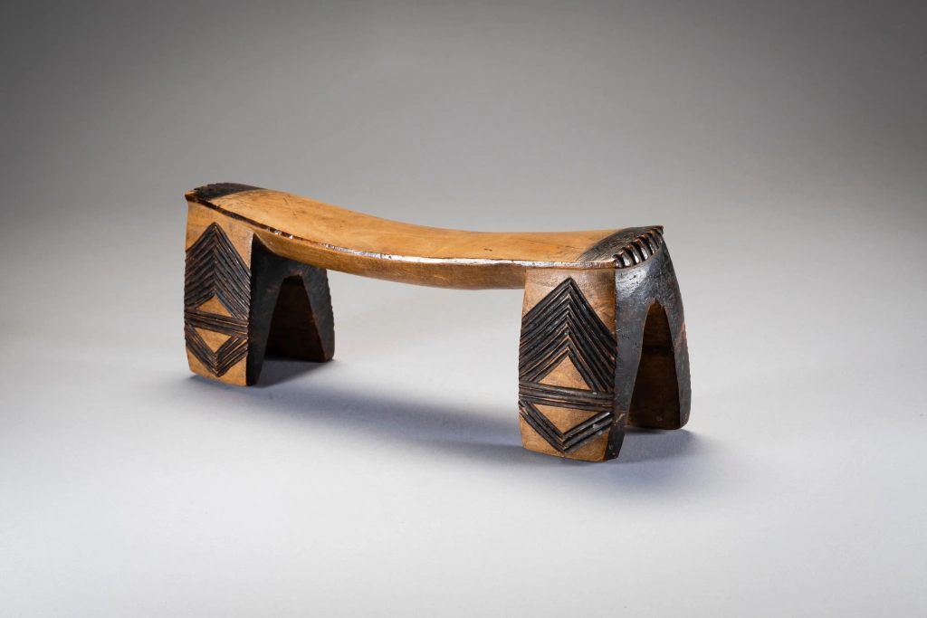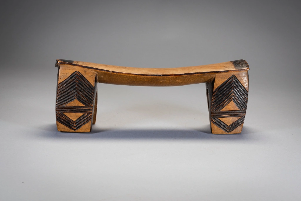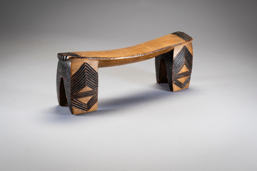 Une pièce de collection ancienne. Cet appui-tête a une belle forme, d’intéressantes décorations et une patine nette obtenue après des années de polissage dans les foyers européens. Comme  beaucoup d’appui-tete passés par Londres il a atterri sur le marché aux puces de Portobello avant d’être repéré par un propriétaire Anglais de galerie d’art tribal Chris Sheffield.