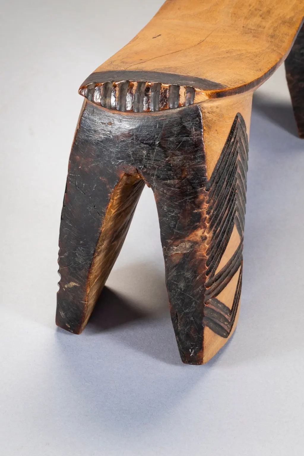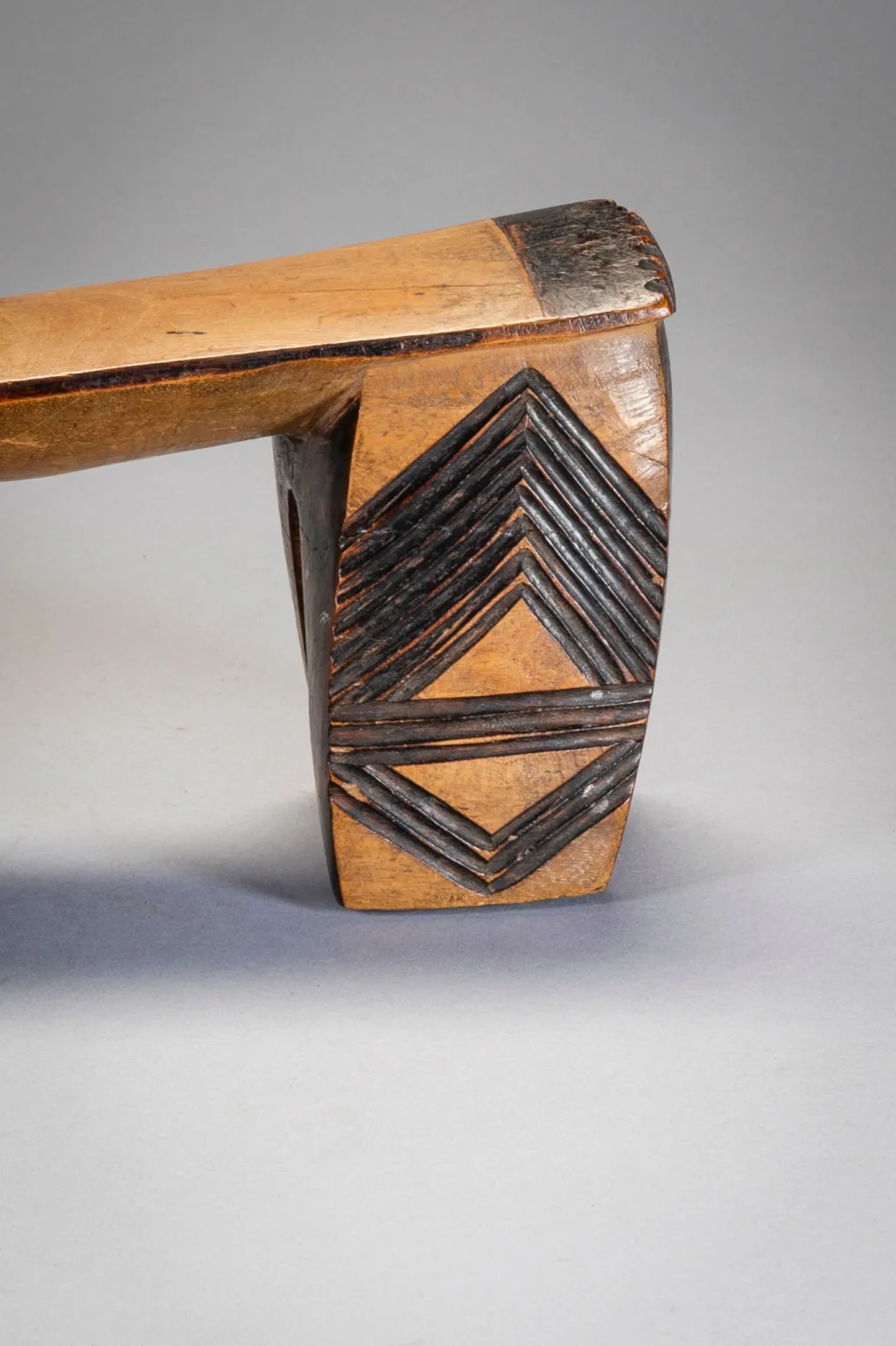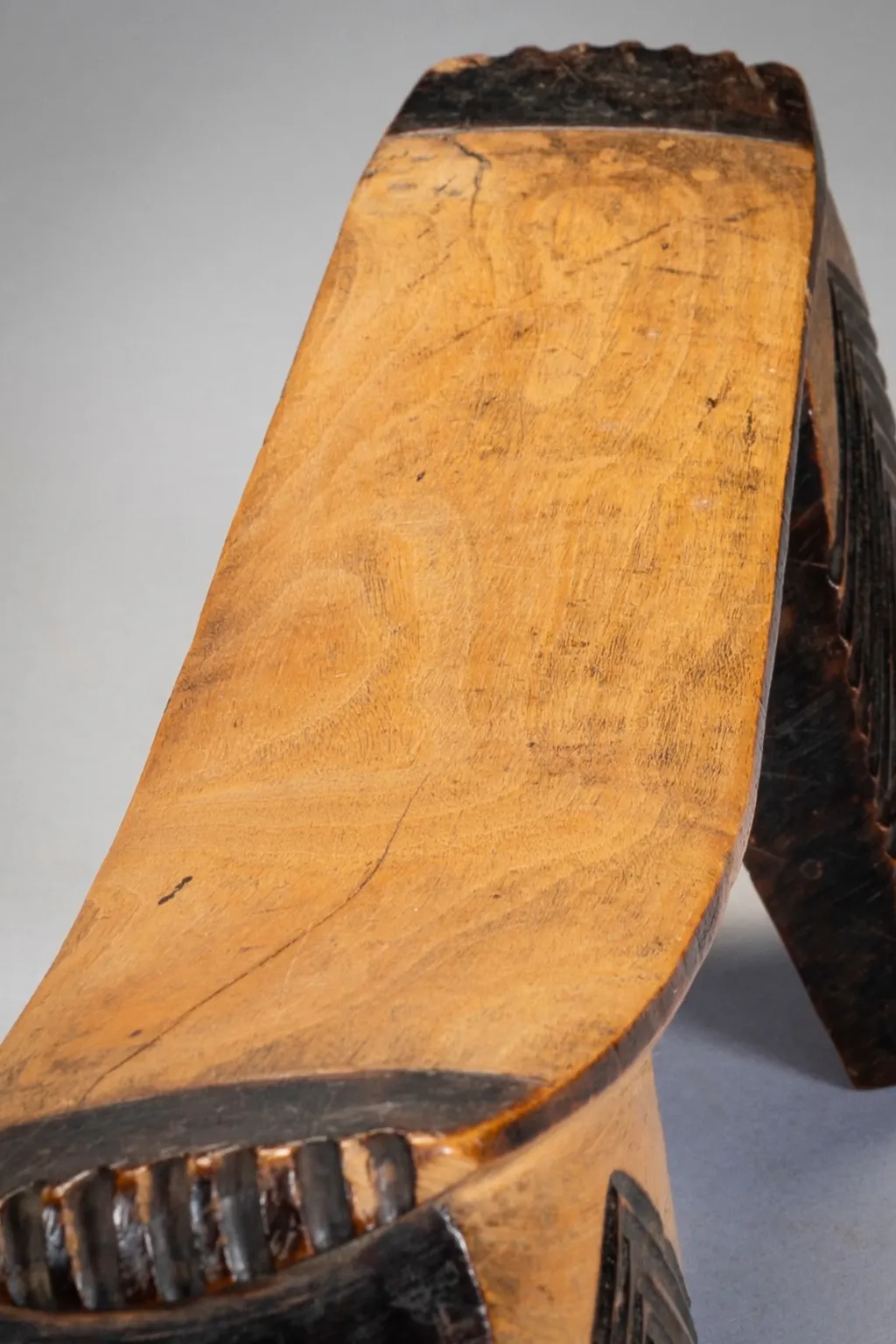 Une pièce de collection ancienne. Cet appui-tête a une belle forme, d’intéressantes décorations et une patine nette obtenue après des années de polissage dans les foyers européens. Comme  beaucoup d’appui-tete passés par Londres il a atterri sur le marché aux puces de Portobello avant d’être repéré par un propriétaire Anglais de galerie d’art tribal Chris Sheffield.