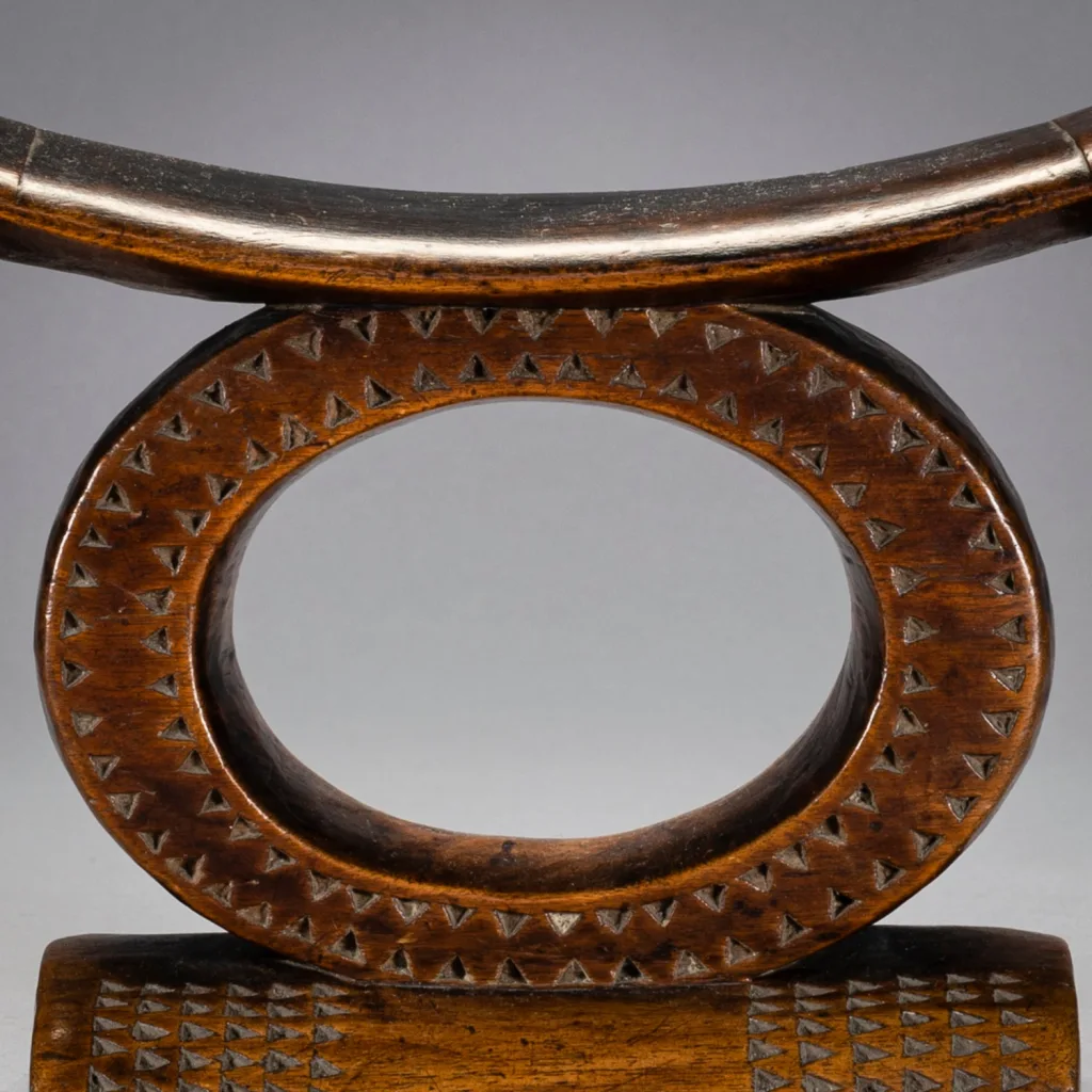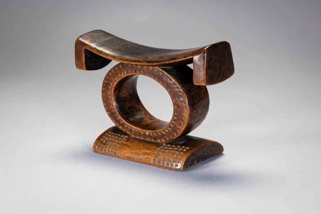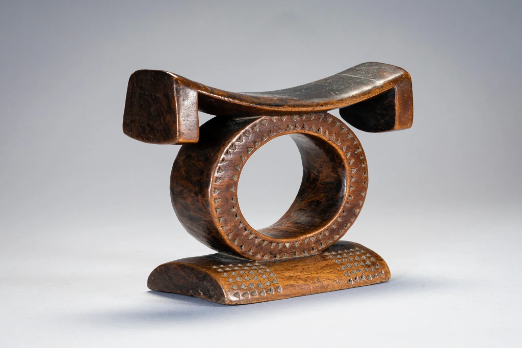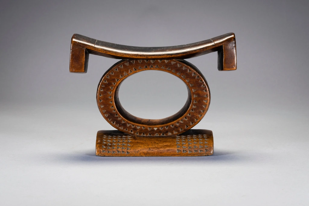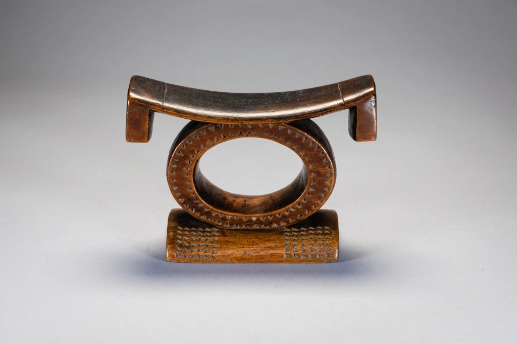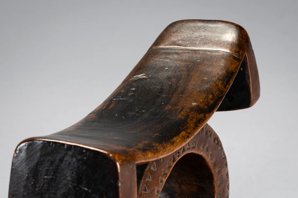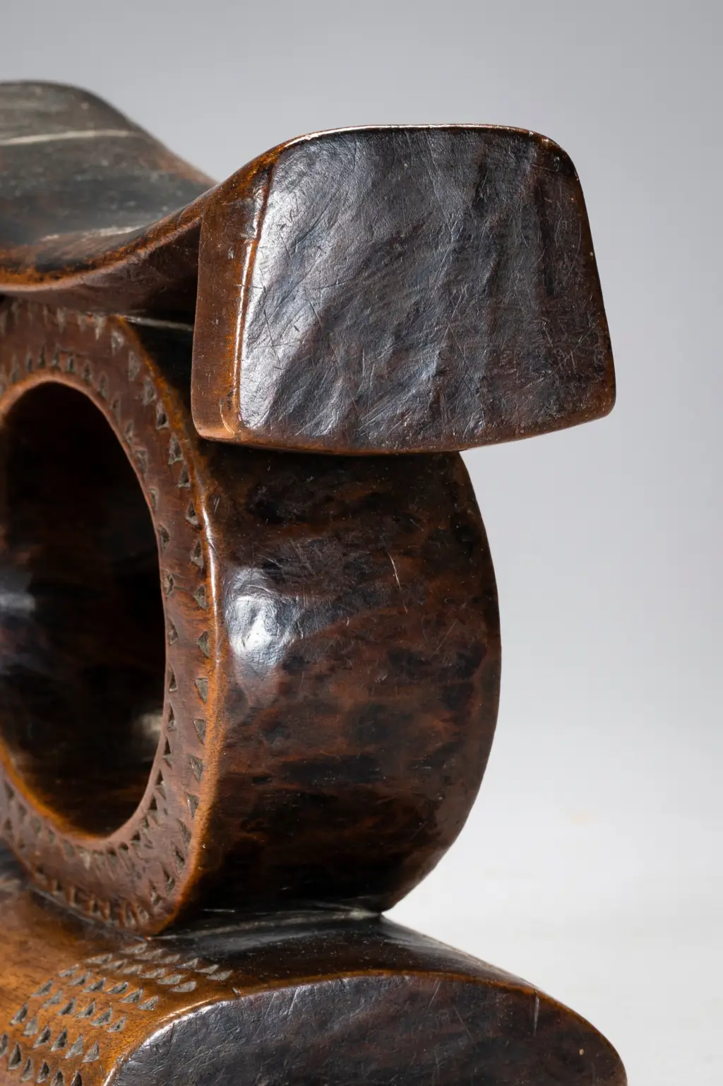 Doté d’une symétrie parfaite, cet appui-tête possède également une partie supérieure courbée, sombre et usée. Cette dernière semble légèrement compressée, le cercle permettant d’assembler la pièce tout en rendant l’objet plus imposant. Certaines parties de la base de l’appui-tête et du cercle sont gravées par des motifs triangulaires. Sa parfaite symétrie et la finesse de sa décoration en font une pièce star représentée quasiment dans tous les ouvrages traitant des appuis-tête. Cité dans l’ouvrage « Appui nuque repose tête et oreiller page 131 »