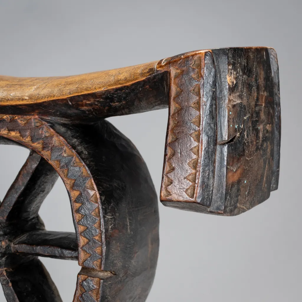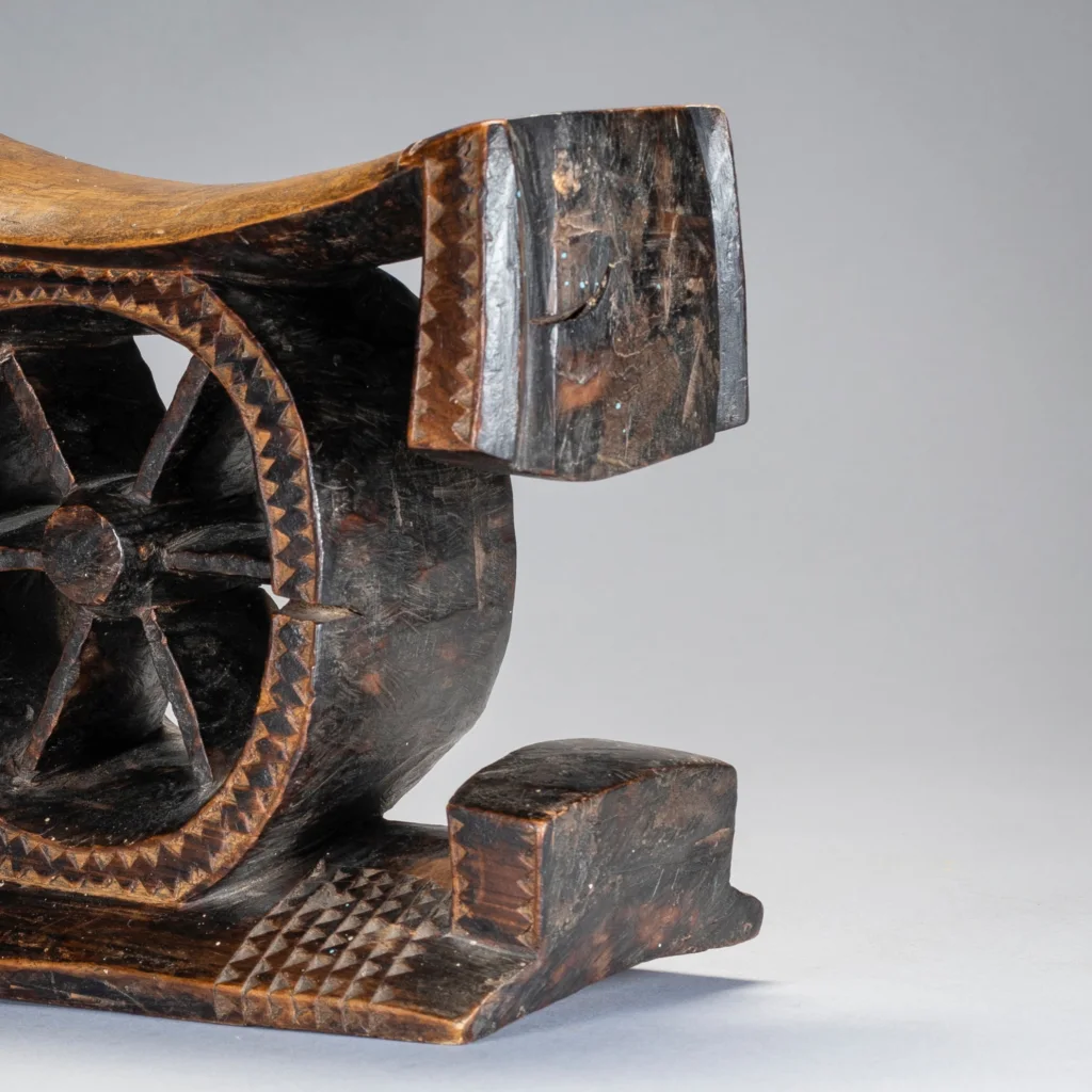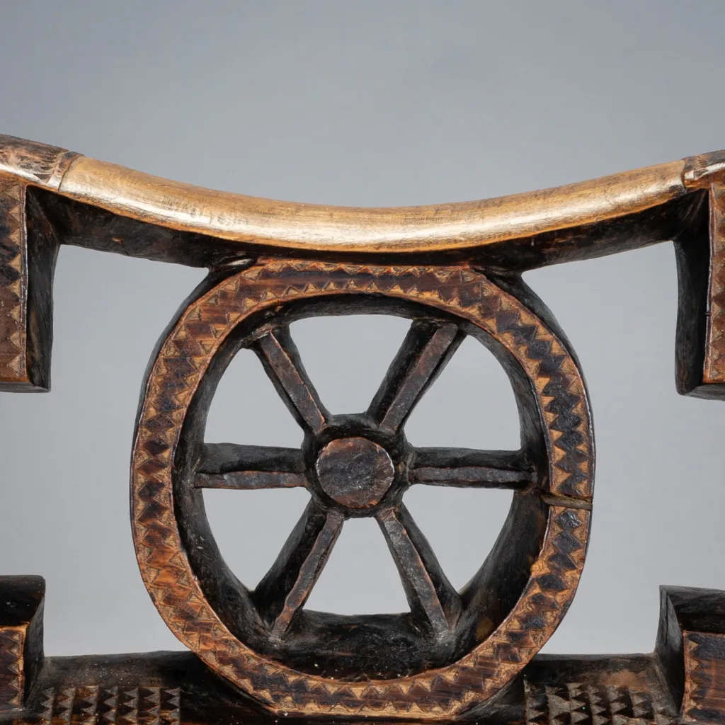 Sur ce petit appui-tête se situe une roue de wagon. Elle est posée au-dessus d’un socle sur lequel a été gravé des bandes de damiers et de petites pattes rectangulaires d’autres pattes lourdes situées sur la partie supérieure essayent de les atteindre. Ces petits appuis-tête composés d’un rond central ( évoquant souvent une roue de train ) ont presque toujours un style d’influence Tsonga , se situant donc plutôt dans le Nord Est du KwaZulu Natal.