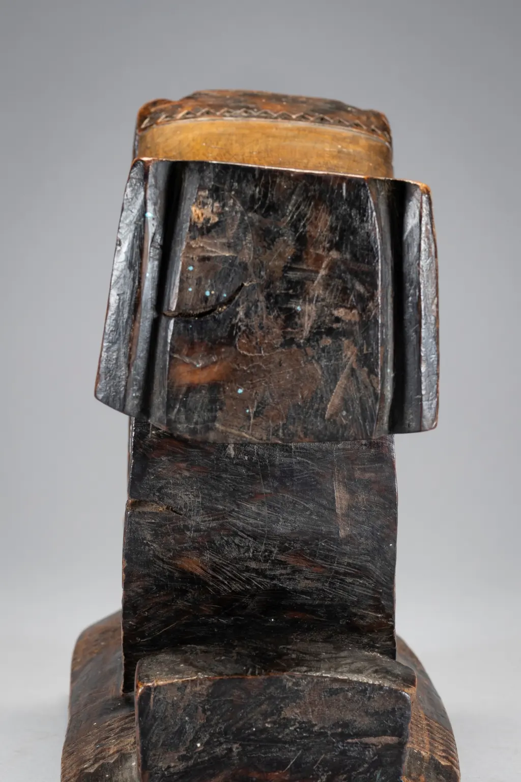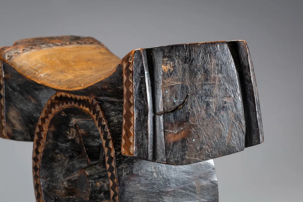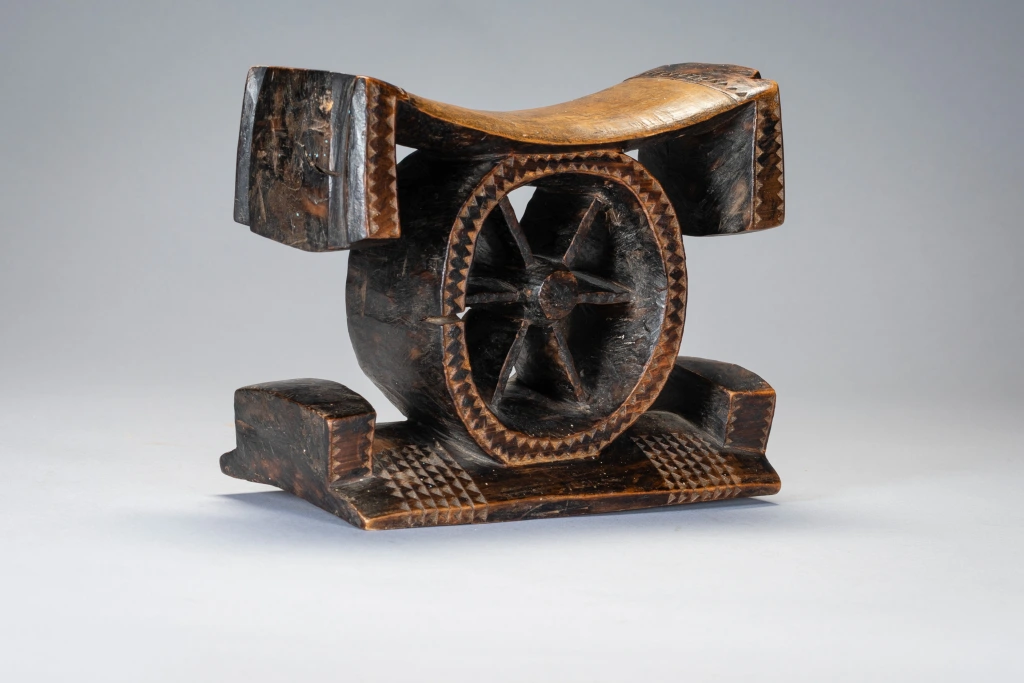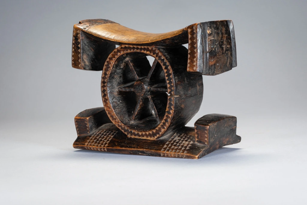 Sur ce petit appui-tête se situe une roue de wagon. Elle est posée au-dessus d’un socle sur lequel a été gravé des bandes de damiers et de petites pattes rectangulaires d’autres pattes lourdes situées sur la partie supérieure essayent de les atteindre. Ces petits appuis-tête composés d’un rond central ( évoquant souvent une roue de train ) ont presque toujours un style d’influence Tsonga , se situant donc plutôt dans le Nord Est du KwaZulu Natal.