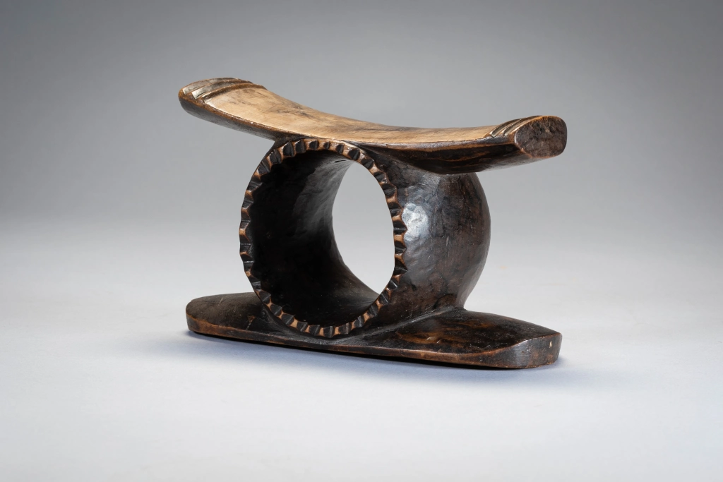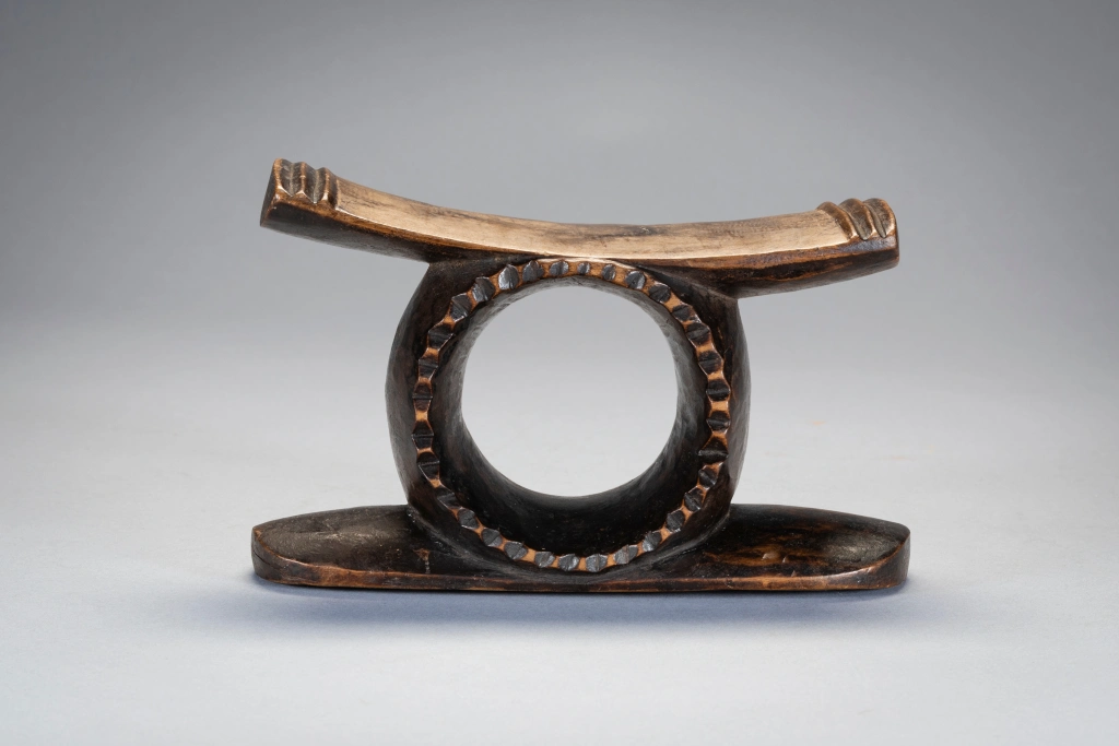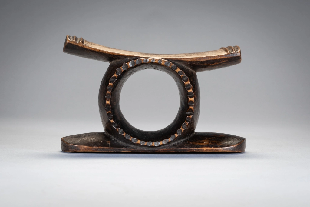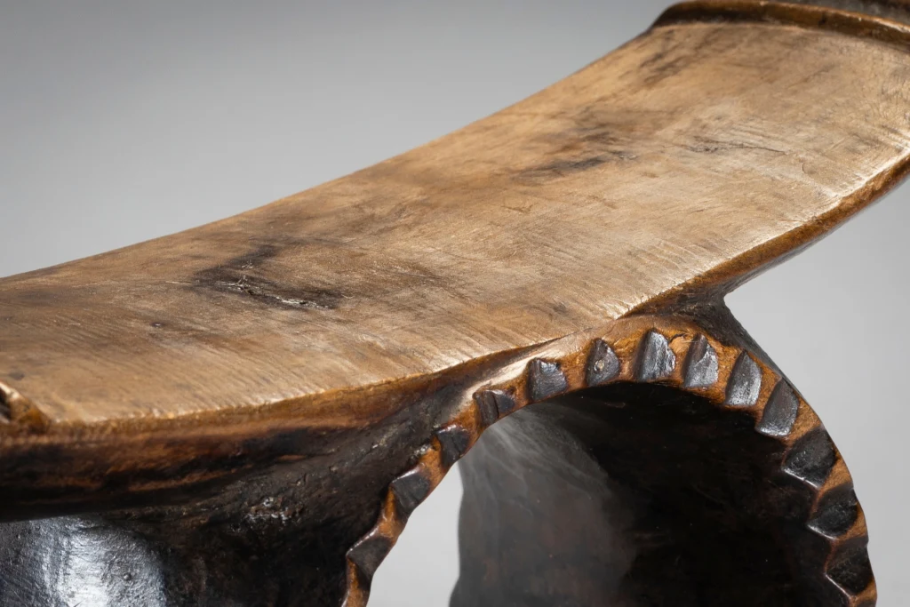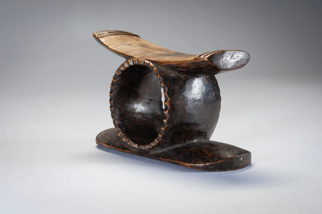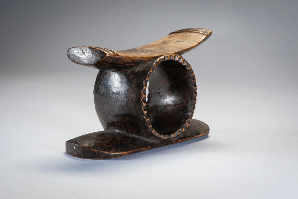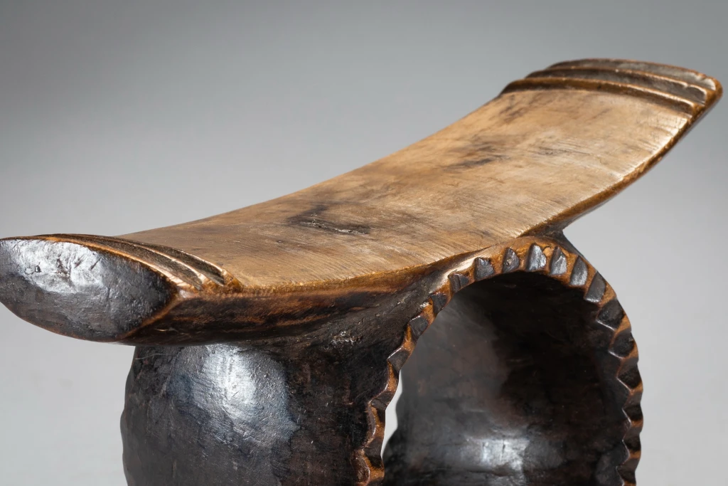 Un petit appui-tête spécial avec en son centre un cercle profond comme un gros «. rond de serviette » et un rebord dentelé extrêmement rare . Le cercle fusionne avec la partie supérieure et le socle de l’appui-tête. La plateforme légèrement inclinée pouvait permettre au dormeur de faire varier de quelque cm/mp la hauteur de son oreiller et d’optimiser ainsi son confort. Cet appui-tête a un style zoulou très appuyé, il possède des crêtes à l’extrémité de sa partie supérieure, mais pas d’ergots de style Tsonga ce qui en fait son originalité et sa rareté.
