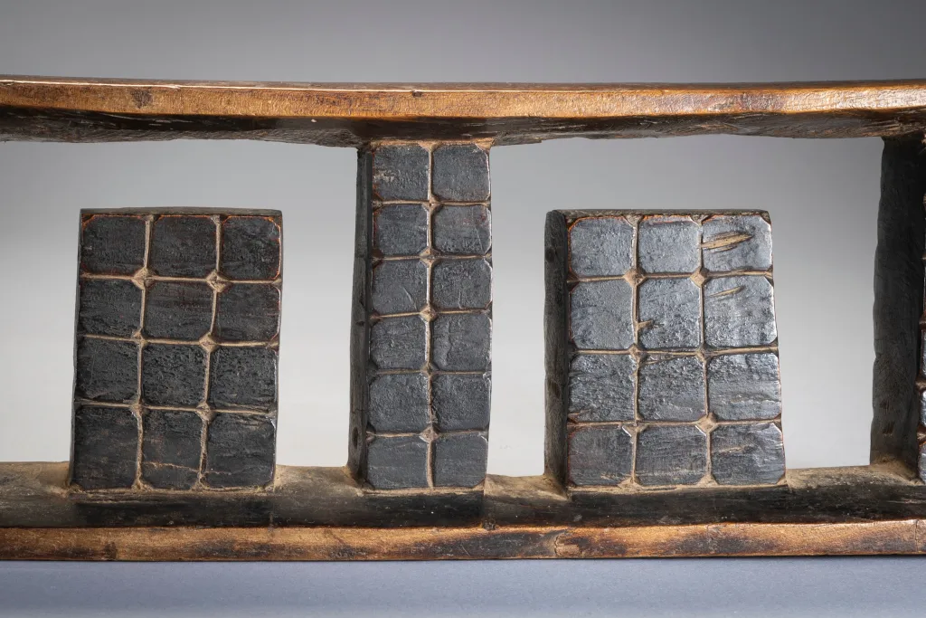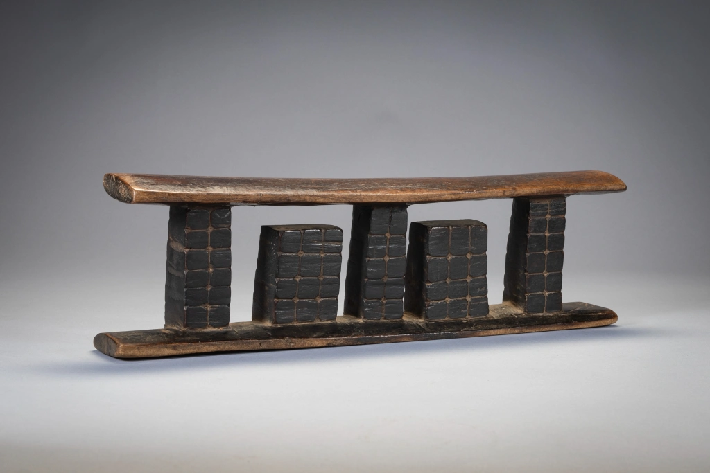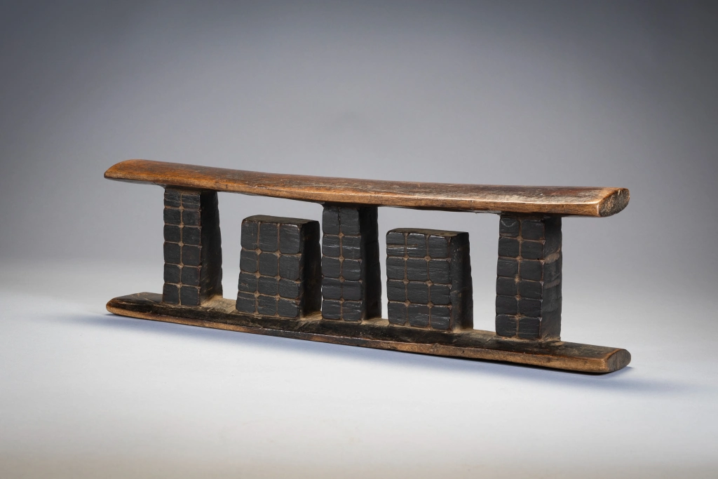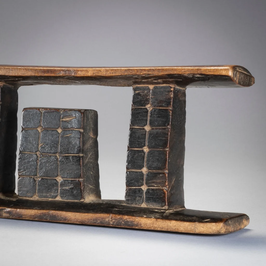 Les trois colonnes de cet appui-tête sont séparées par deux ergots rectangulaires qui sont attachés au socle plutôt qu’à la partie supérieure. Toutes les colonnes sont décorées avec un quadrillage et des points. Original et esthétique cette pièce accrochera immanquablement l’œil des collectionneurs avertis .