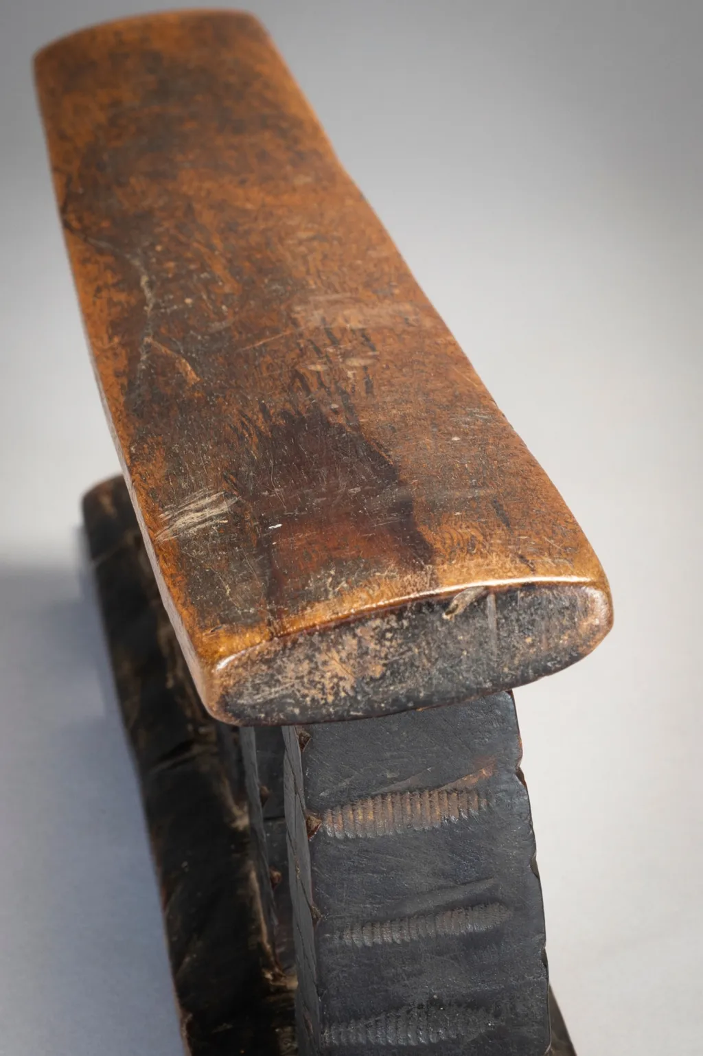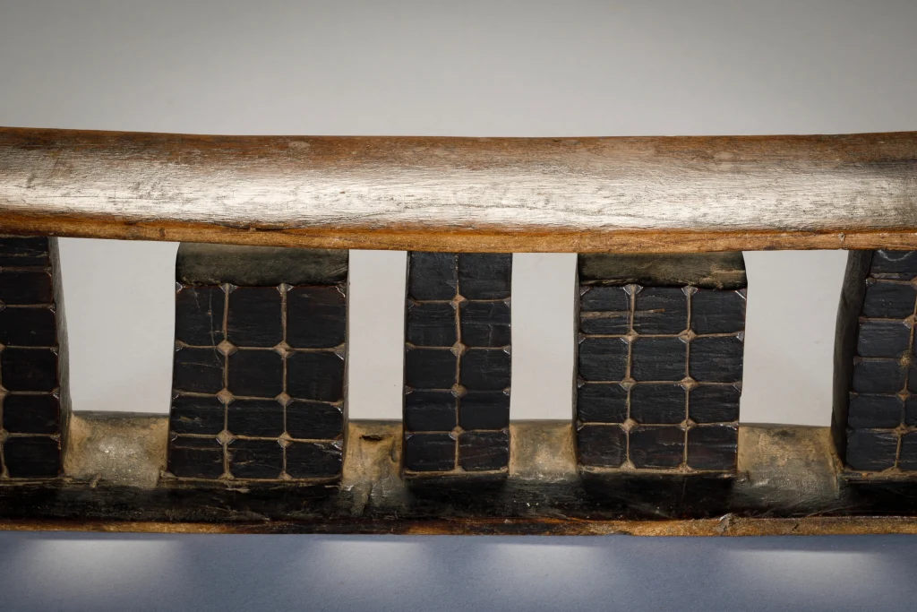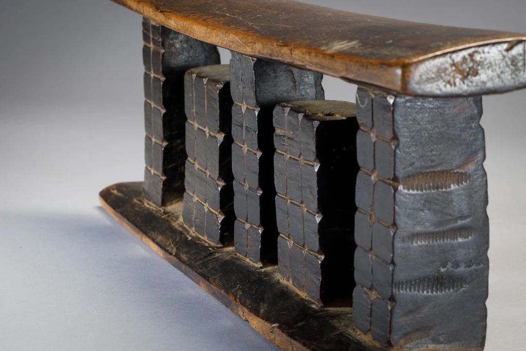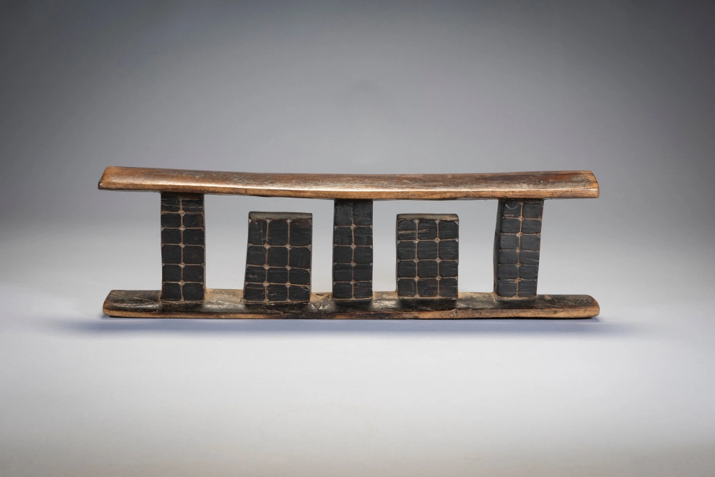 Les trois colonnes de cet appui-tête sont séparées par deux ergots rectangulaires qui sont attachés au socle plutôt qu’à la partie supérieure. Toutes les colonnes sont décorées avec un quadrillage et des points. Original et esthétique cette pièce accrochera immanquablement l’œil des collectionneurs avertis .