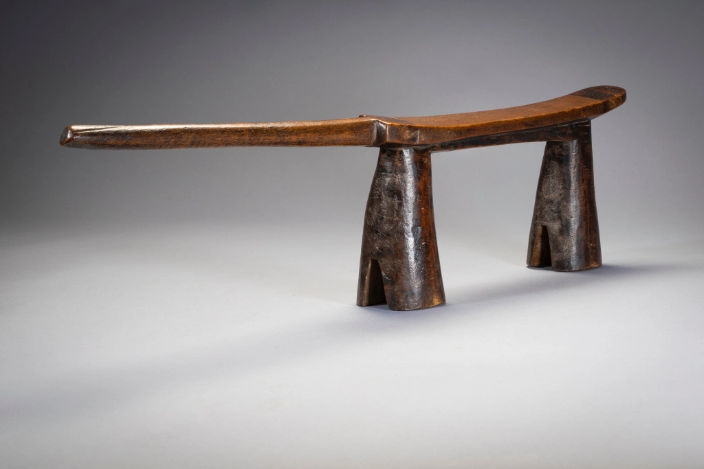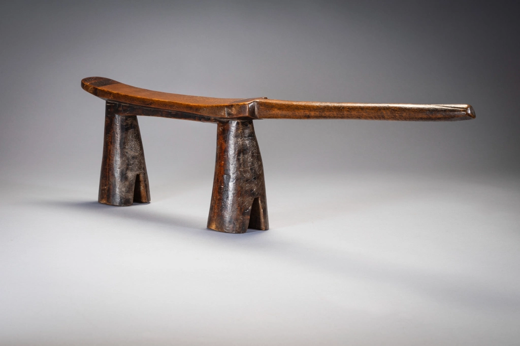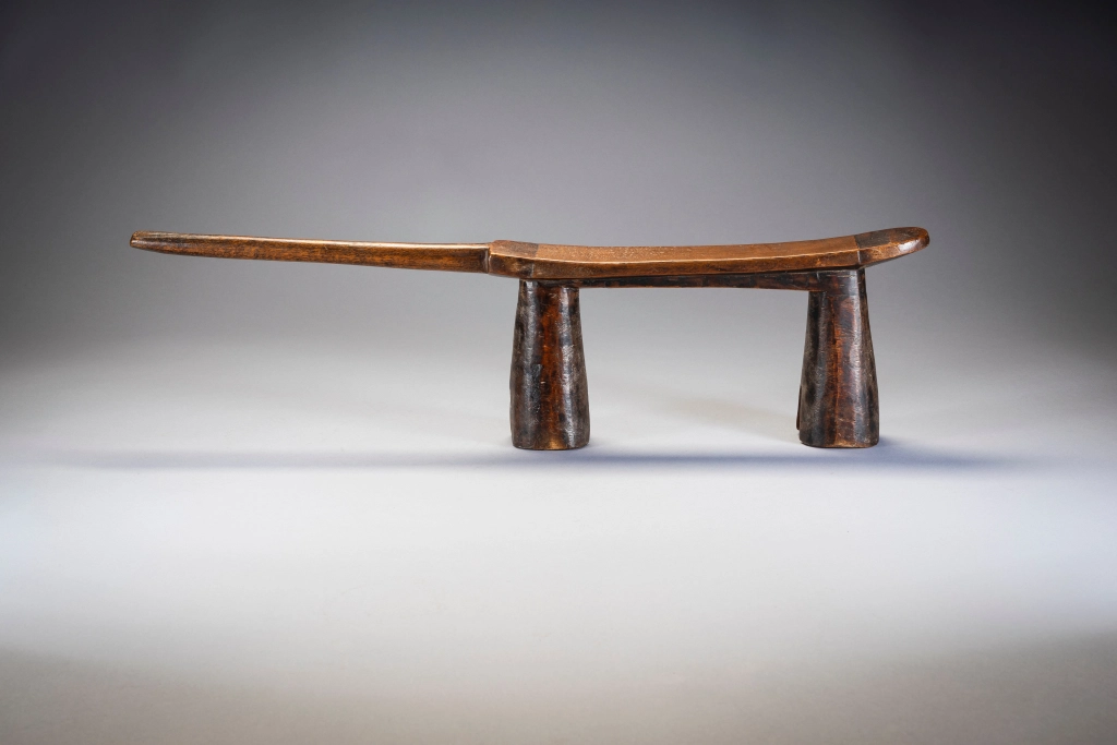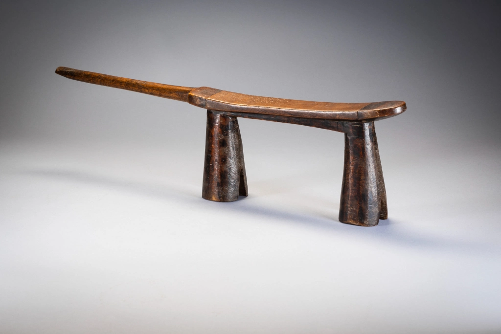 Droit et fier, cet appui-tête zoulou est maintenu par des pieds arrondis biseautés à sa base, comme des sabots. La décoration est minimale avec de simples bandes sombres de bois délimitées en haut. Le manche est court et pointe vers l’extérieur donnant à la pièce un certain équilibre dans sa forme.
