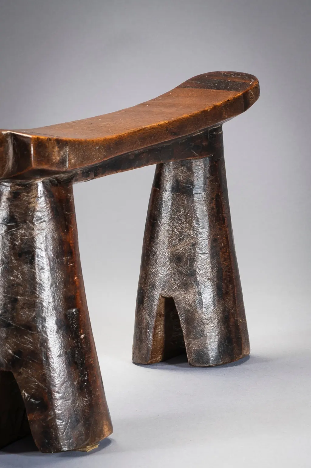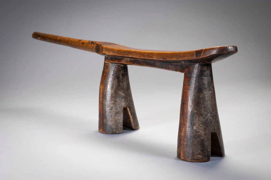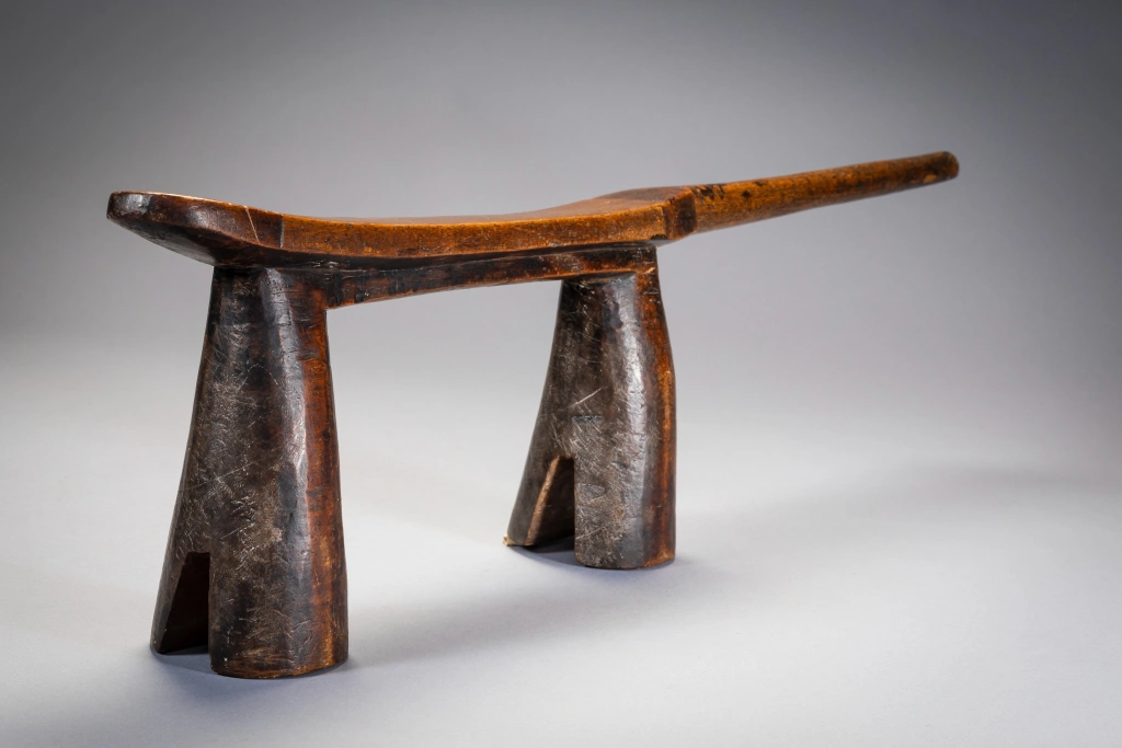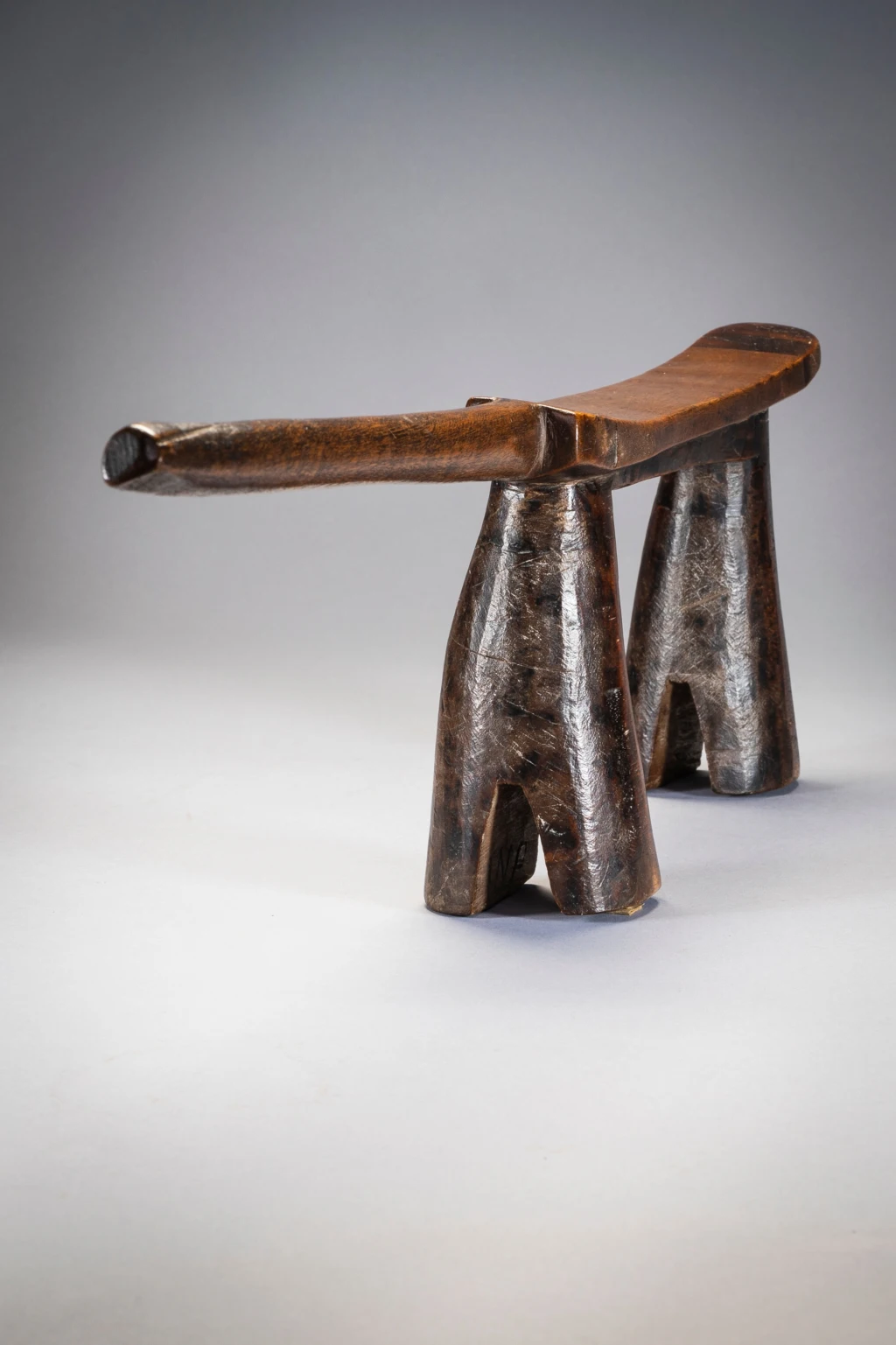 Droit et fier, cet appui-tête zoulou est maintenu par des pieds arrondis biseautés à sa base, comme des sabots. La décoration est minimale avec de simples bandes sombres de bois délimitées en haut. Le manche est court et pointe vers l’extérieur donnant à la pièce un certain équilibre dans sa forme.