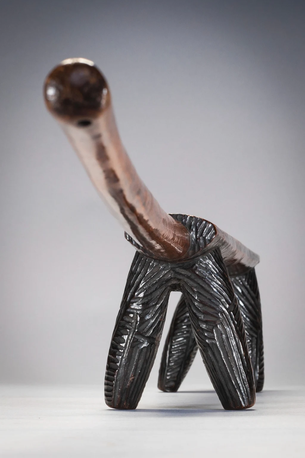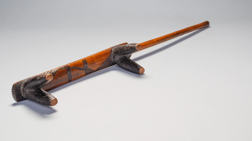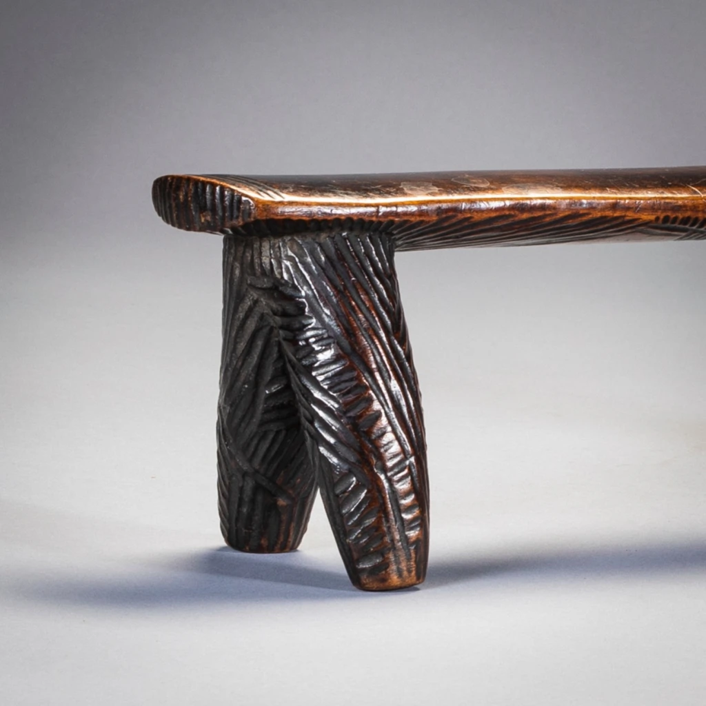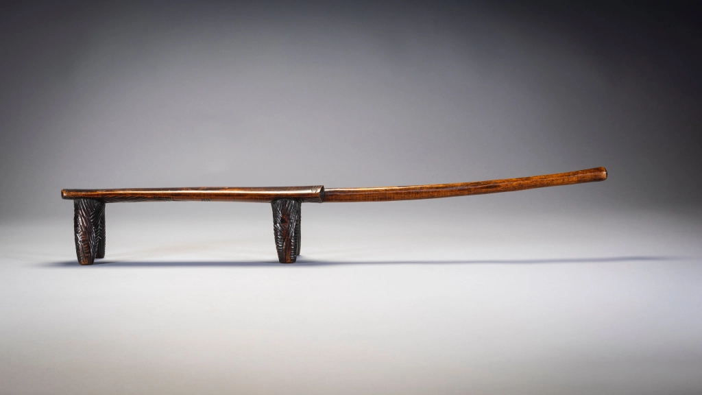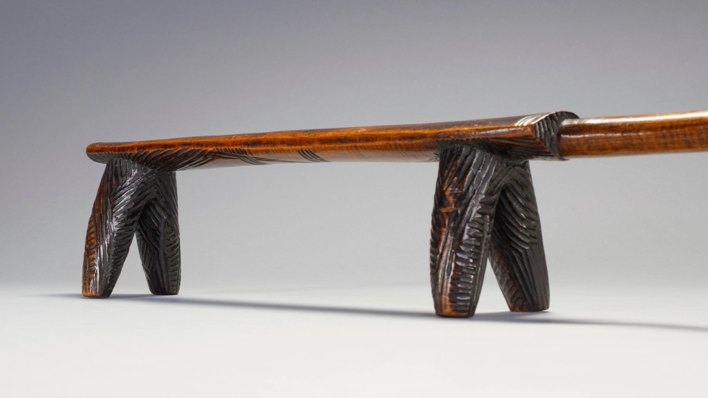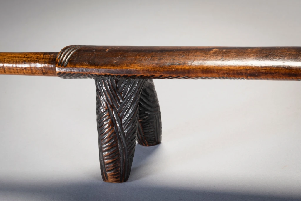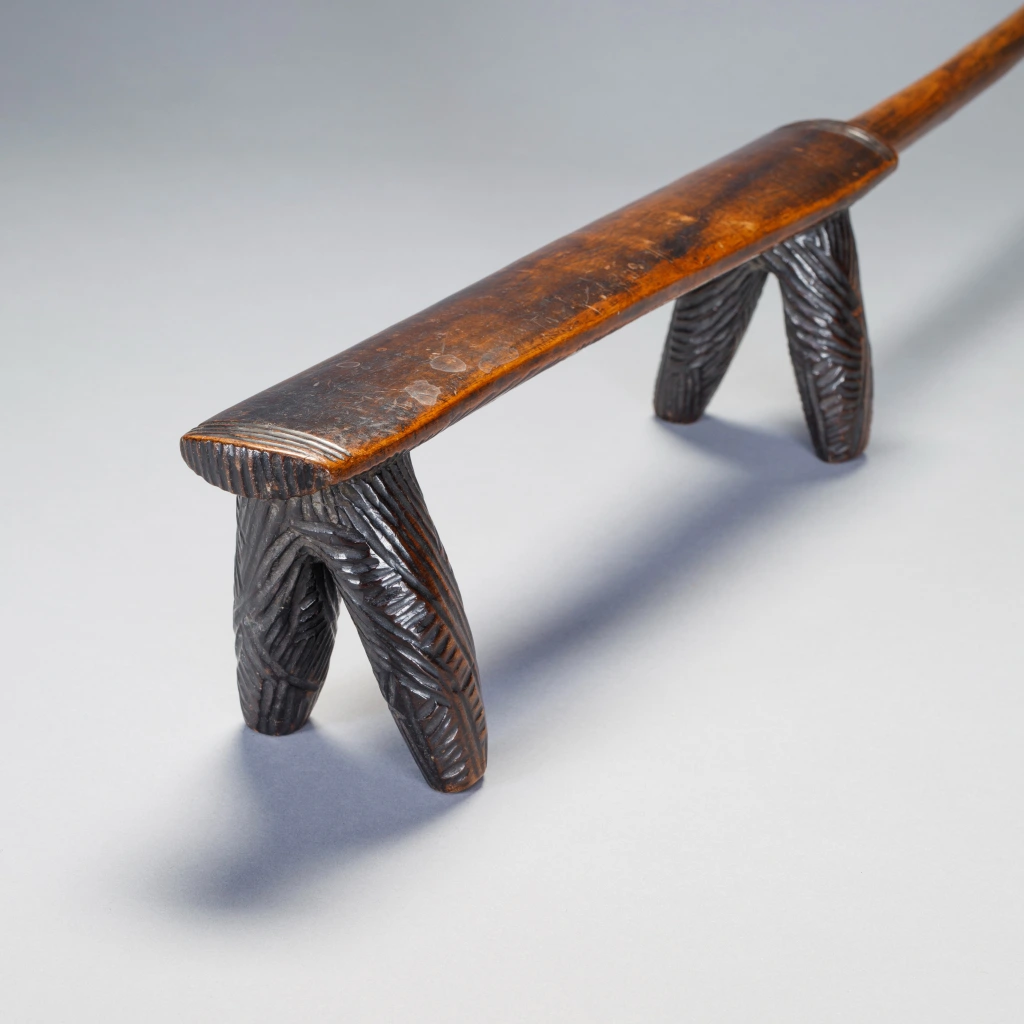Cet appui-tête a des jambes « Amasondo » couvertes de hachures présentes aussi en bas de la plateforme supérieure. Sa poignée est longue et s’élargit un peu à son extrémité. Les poignées sont généralement trouvées dans de plus petits et plus légers appuis-tête « Tsonga » mais quelques exemples d’appuis-tête zoulous de ce style sont trouvables dans les musées ou des collections privées.