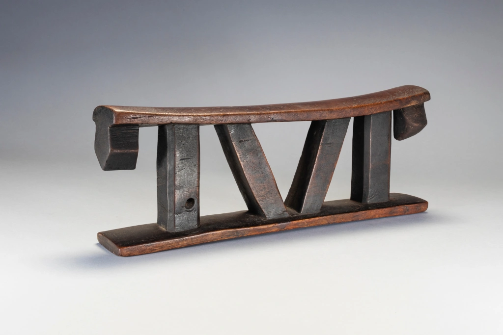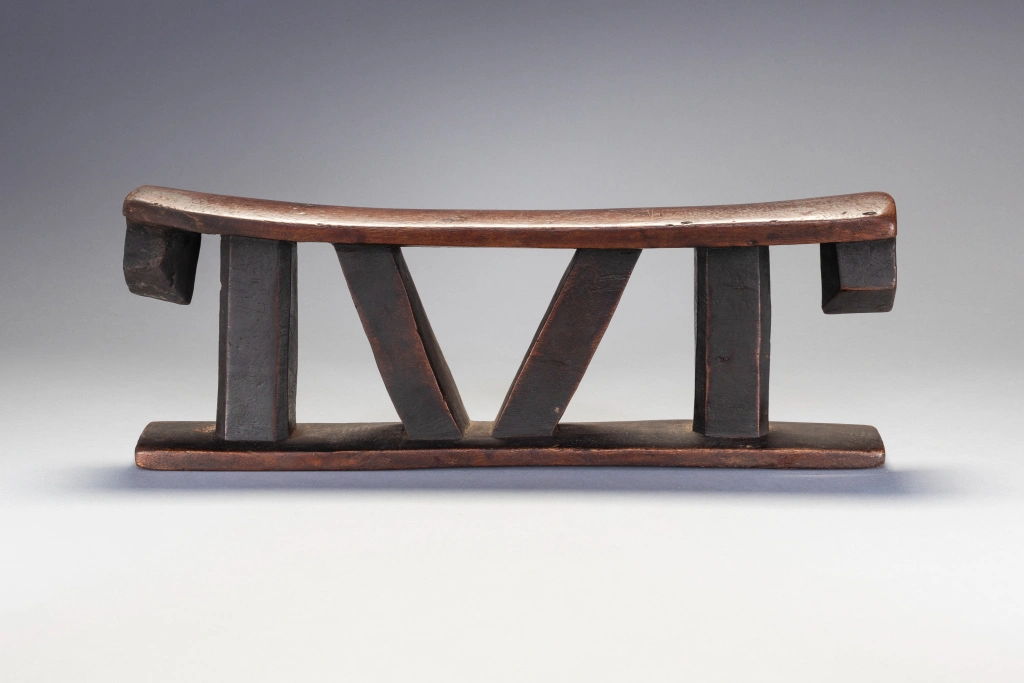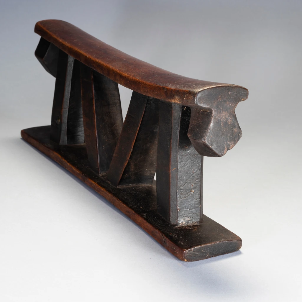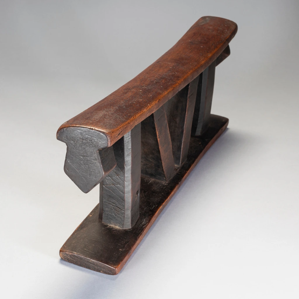 Un appui-tête non décoré, mais remarquable avec de grandes pattes à facettes et un ensemble de colonnes intérieures angulaires et de colonnes extérieures droites. La simplifie ses formes et la puissance qu’il dégage en font sa beauté.