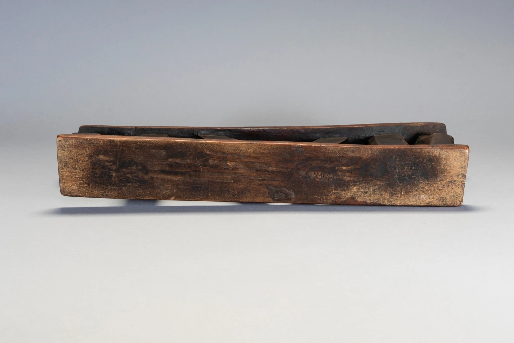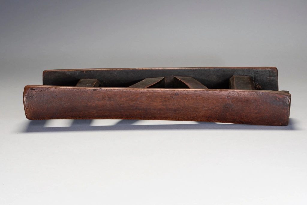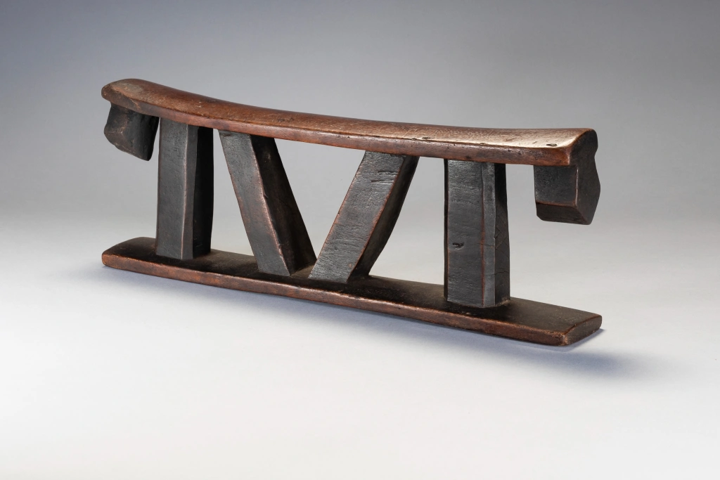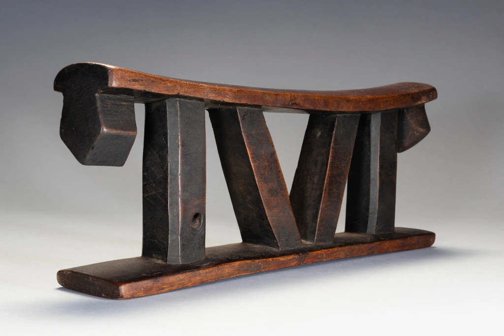Un appui-tête non décoré, mais remarquable avec de grandes pattes à facettes et un ensemble de colonnes intérieures angulaires et de colonnes extérieures droites. La simplifie ses formes et la puissance qu’il dégage en font sa beauté.