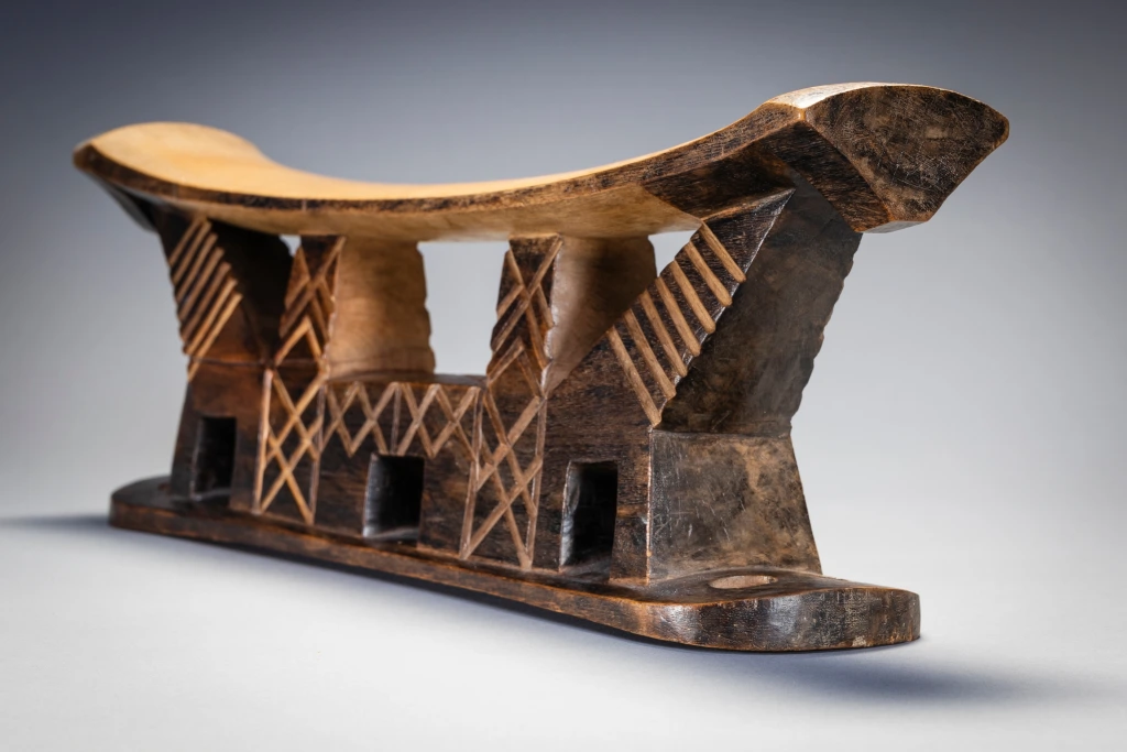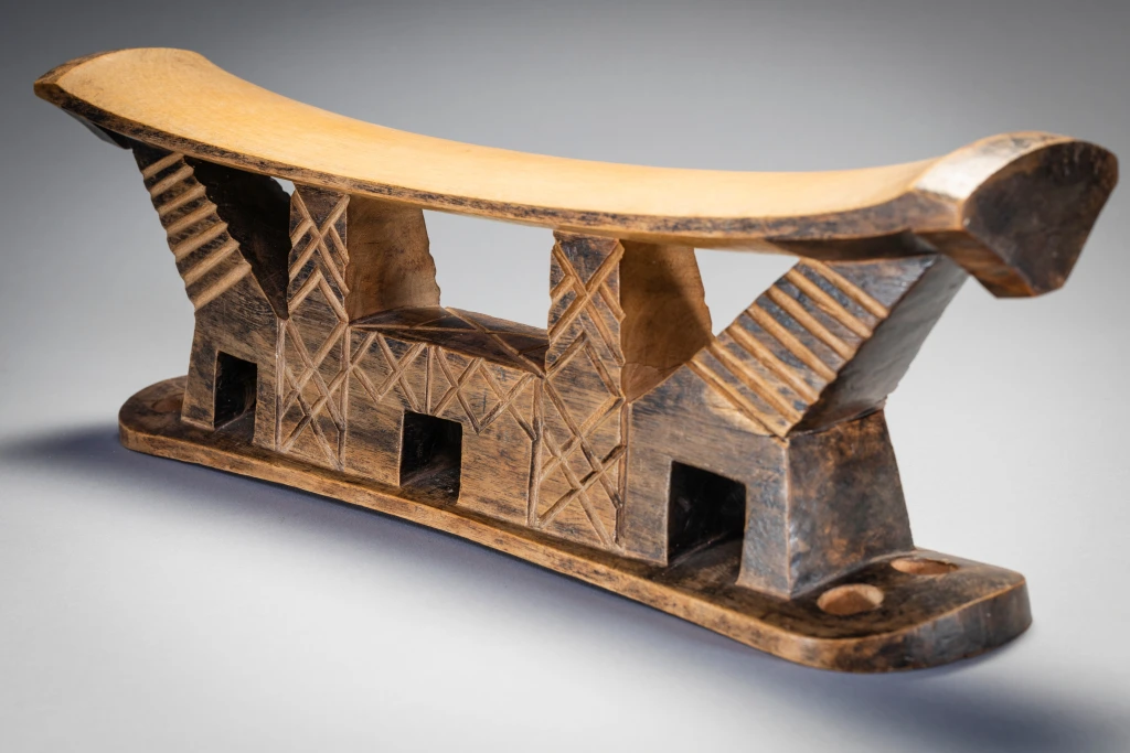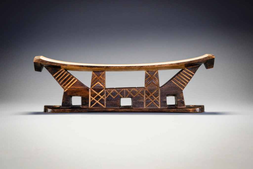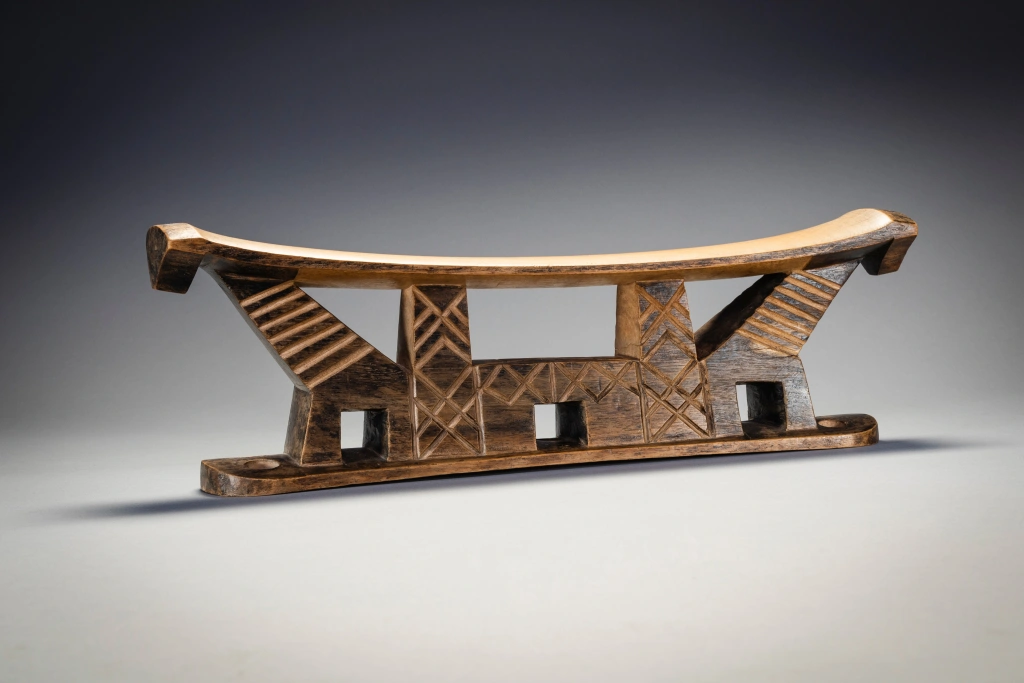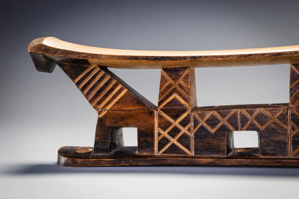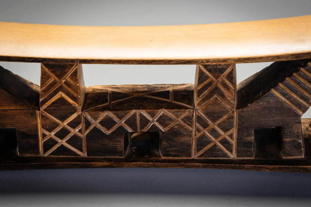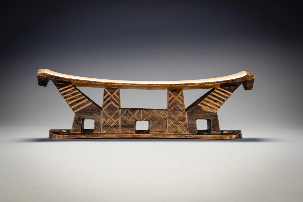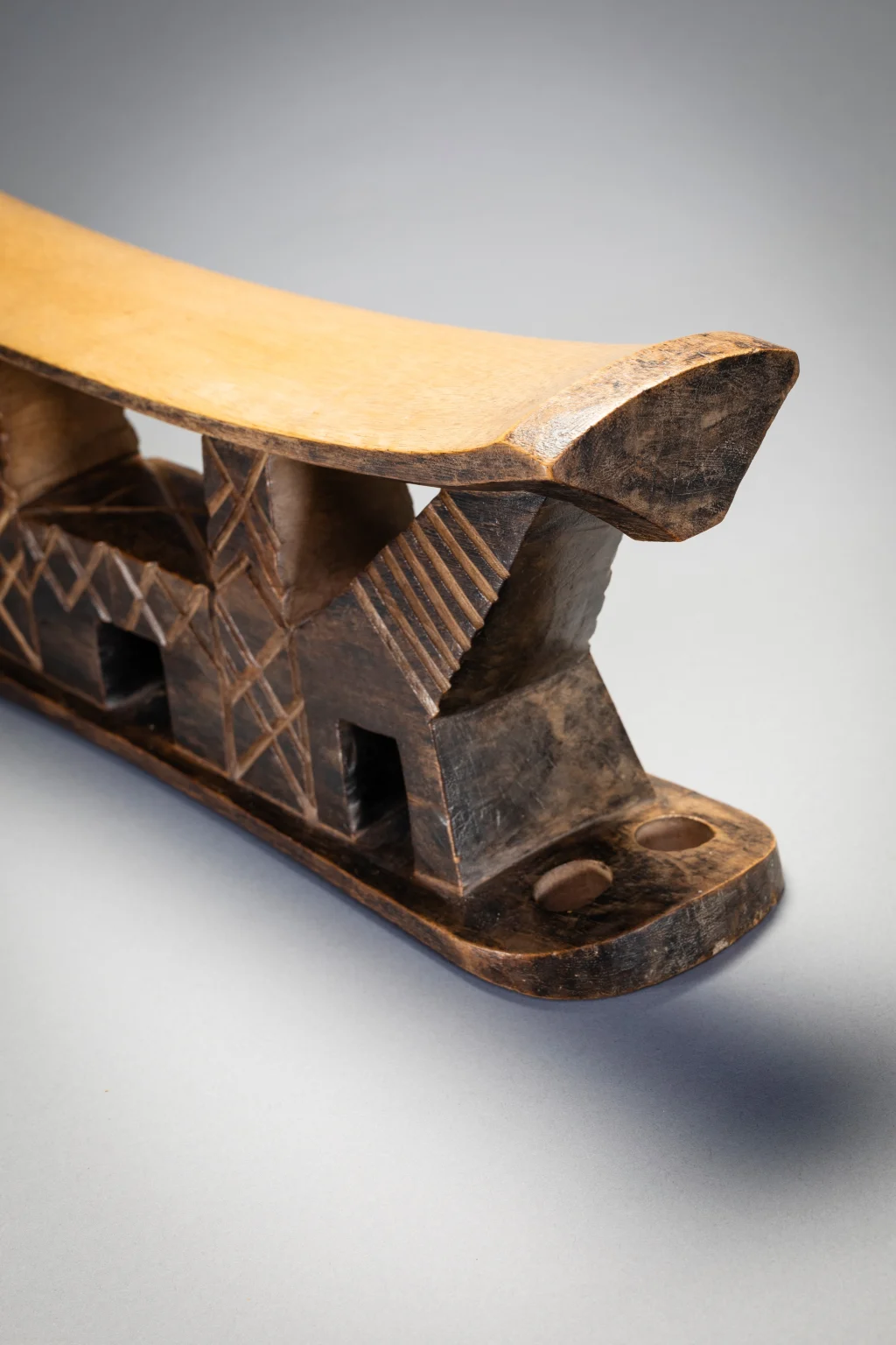 Il s’agit d’un appui-tête inhabituel et sculpté avec précision, les supports extérieurs et les pattes ressemblant à des girafes stylisées,. Un appui-tête similaire, probablement de la même main, se trouve au musée Killie Campbell à KZN.Il présente peu de signes d’utilisation, mais a une patine ancienne et sèche. Sous la base, se trouve une vieille étiquette indiquant. »Ubombo 1936″ et une date 8-4-36, ce qui signifie qu’il provient probablement de cette région et a peut-être été offert en dot à un mariage qui aurait eut lieu ce jour là. Les montagnes d’Ubombo se trouvent dans le nord du KwaZulu-Natal, tout près du Mozambique, à la frontière de l’Afrique du Sud et de l’Eswatini.