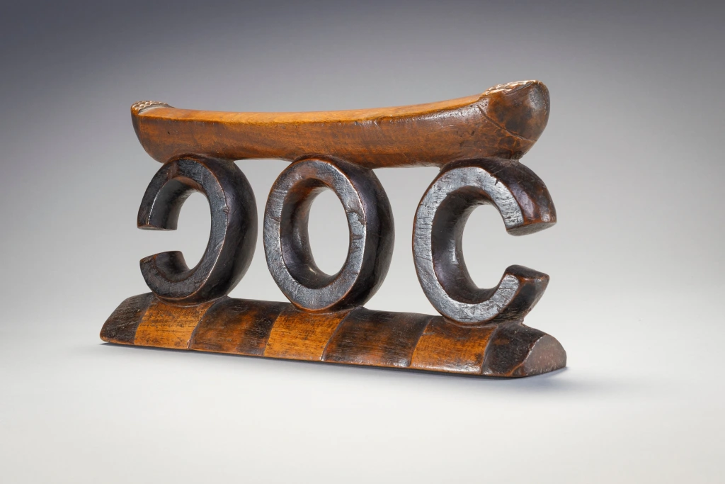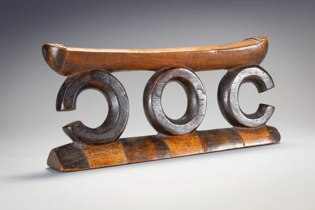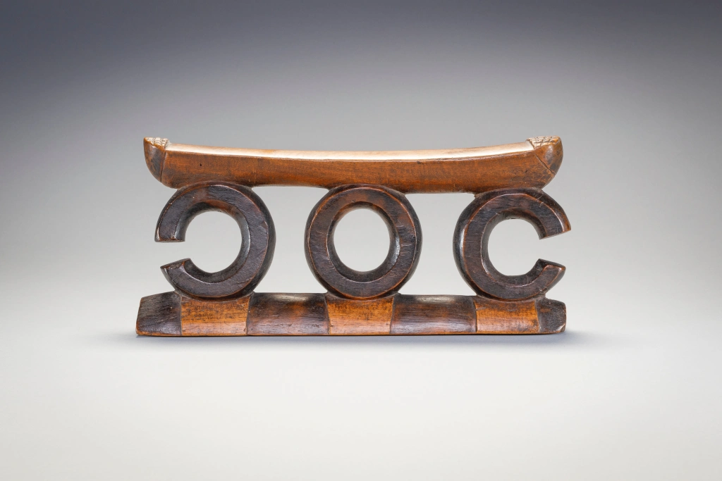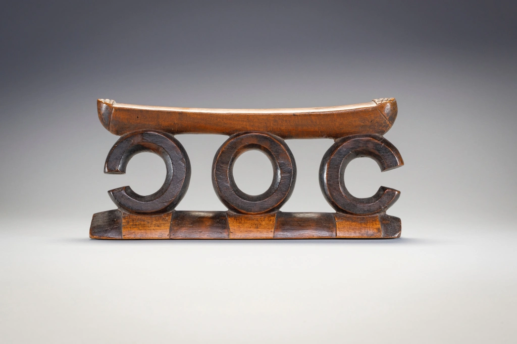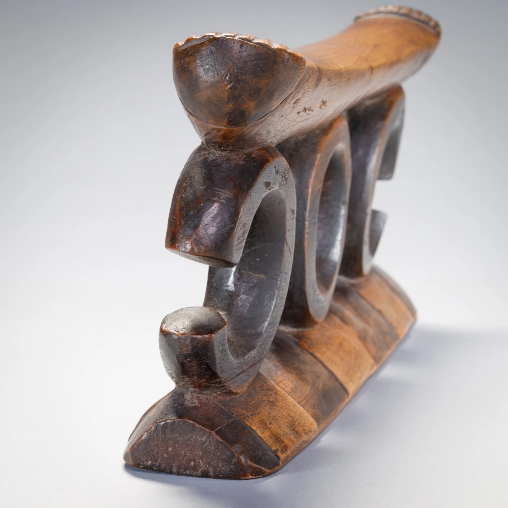 Piece emblématique de la collection, ce petit mais puissant appui-tête est composé de trois supports circulaires, ceux aux extrémités ne sont pas complets. La plate-forme présente une bande d’amasumpa à chaque extrémité légèrement surélevée et la base présente des pyrogravures. Cet appui-tête est sculpté dans un bois dur et sombre, ce qui signifie que le sculpteur, n’a pas embelli les cercles et a laissé la surface brillante être l’élément principal.