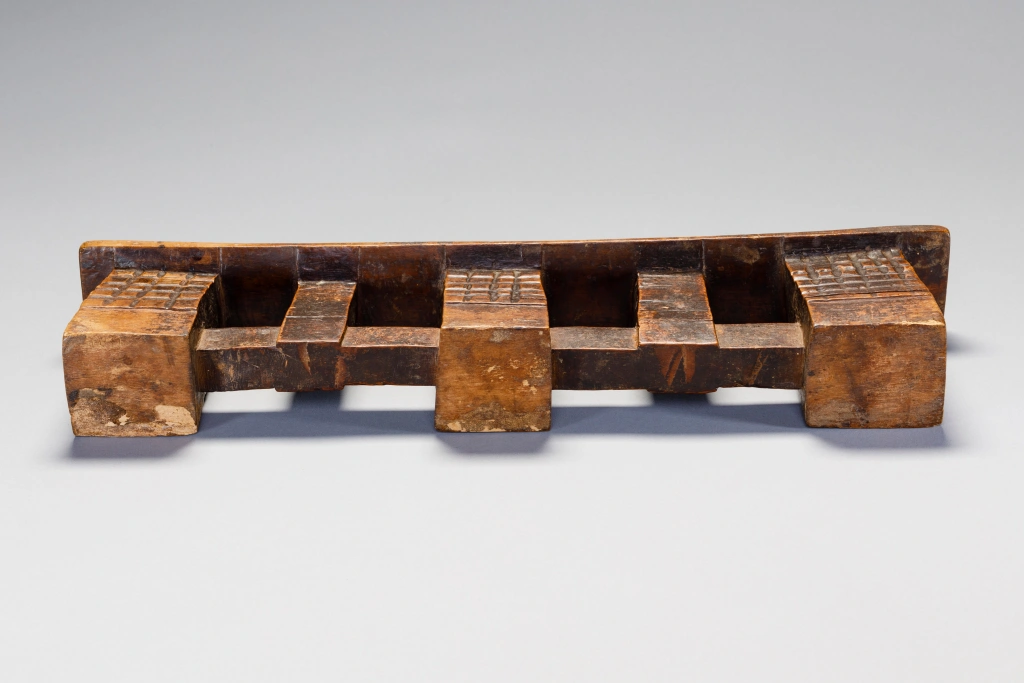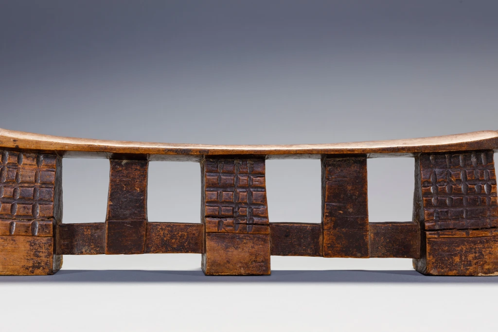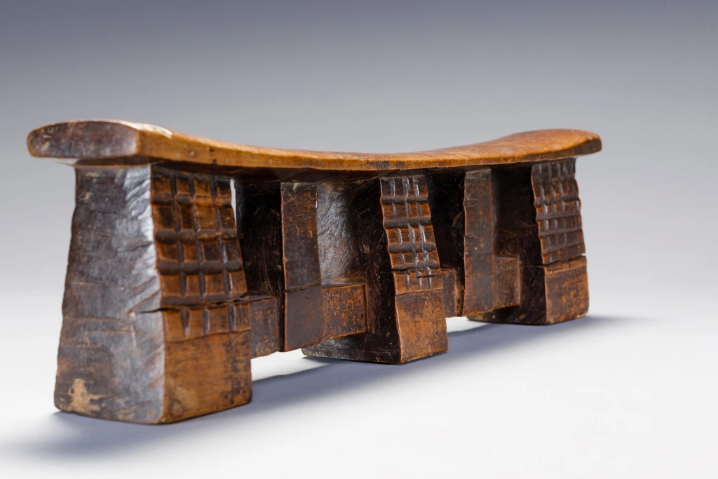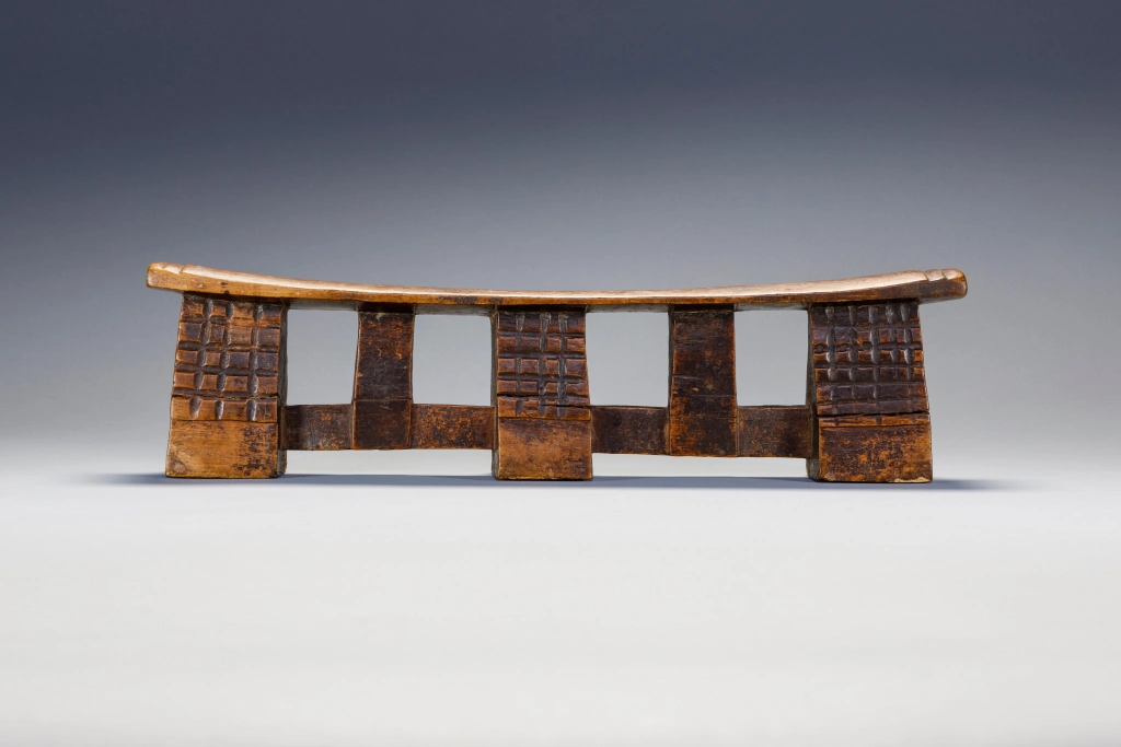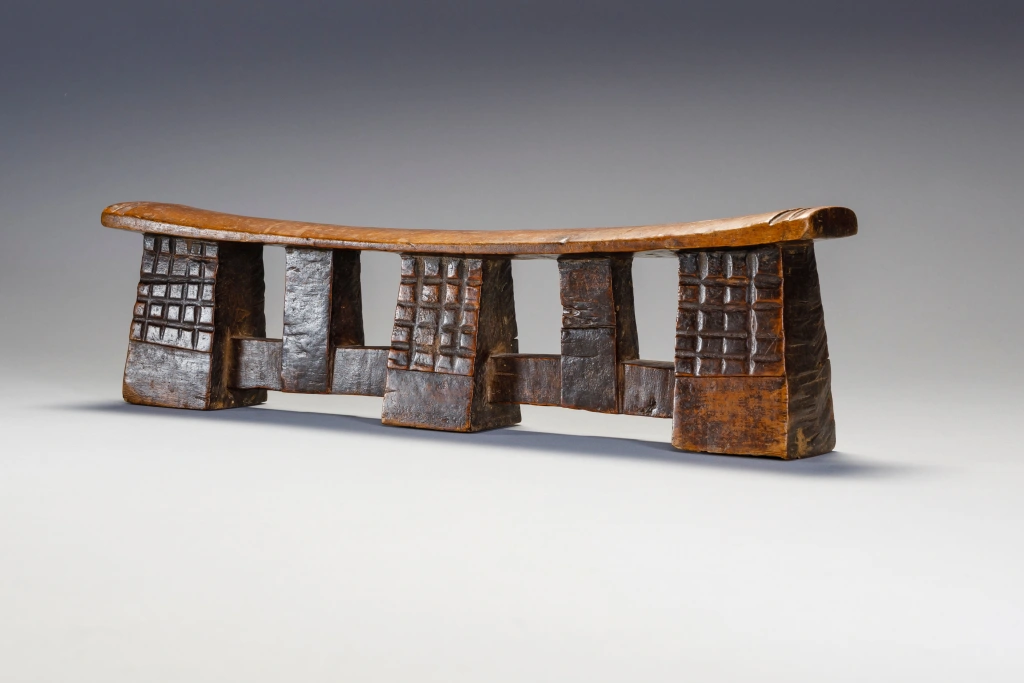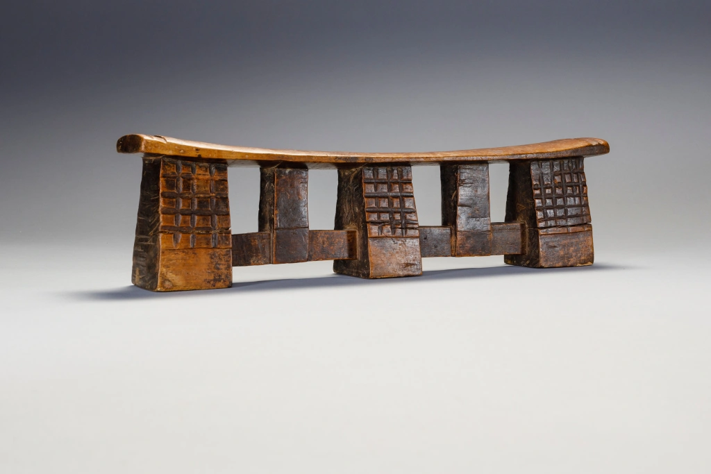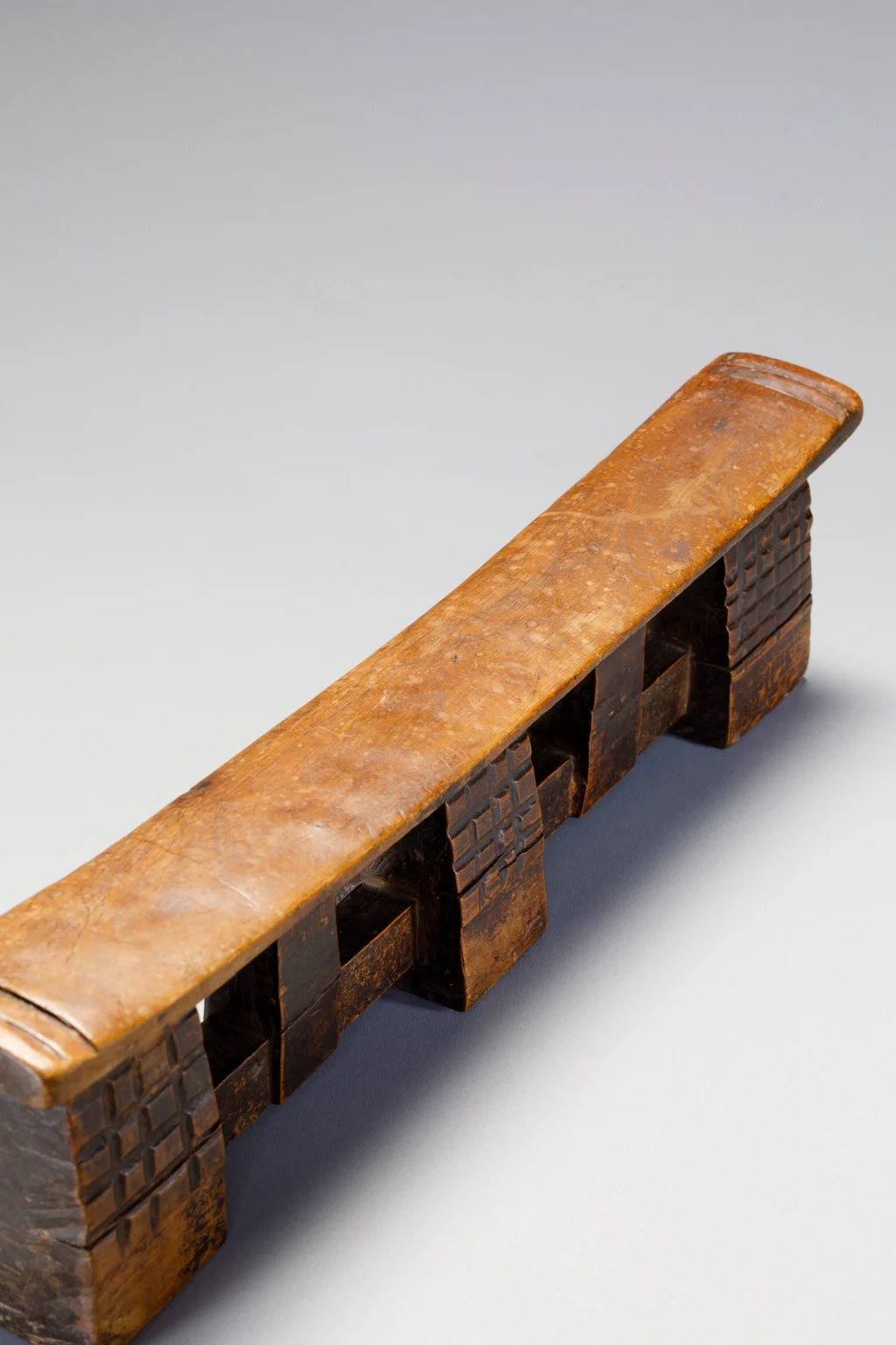 Ce superbe appui-tête ancien a la forme classique à trois pieds avec amasumpa des appuis-tête de la région de Kwazulu Natal, mais dans ce cas, les pieds sont reliés par des contreforts quadrillés qui s’emboîtent les uns dans les autres. Sans être vraiment semblable et probablement plus ancien cet appui-tete fait penser au style Steckemani version zouloue , les amasumpas zoulou s’étant substitués aux cannelures swazi