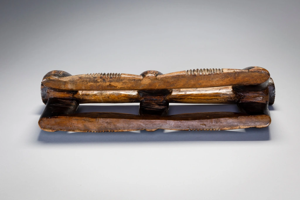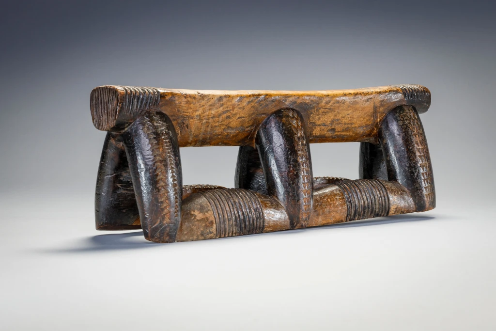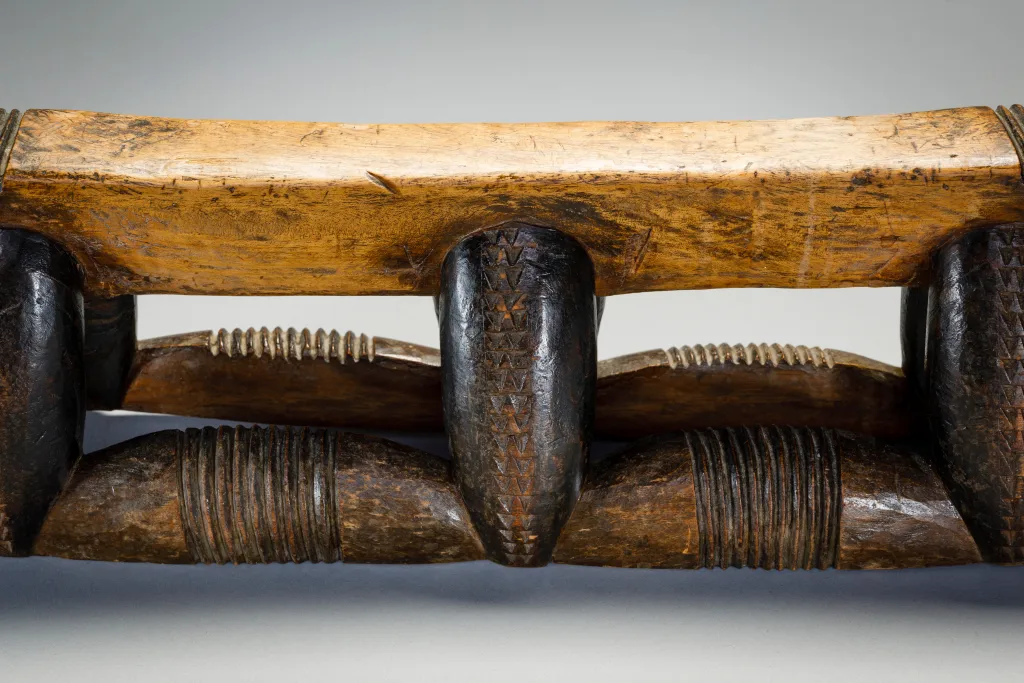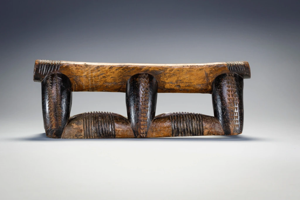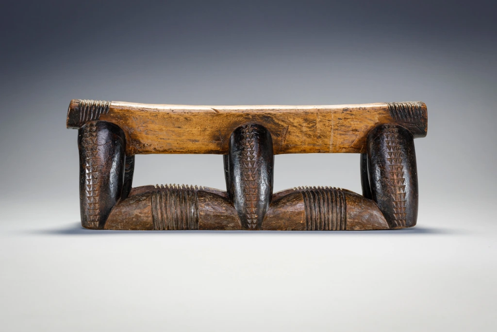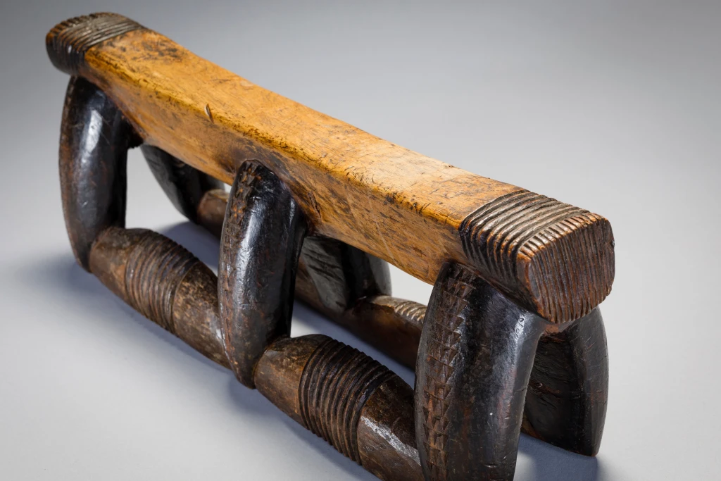 Un appui-tête de jambe amasondo avec des contreforts. Les décorations sont inhabituelles, avec de fines cannelures autour et aux extrémités de la plate-forme. Elles se poursuivent en bandes sur la base, et les pieds sombres et brillants, qui sont souvent décorés de motifs simples. Cet appui-tête a participé en Europe à diverses expositions à Bruxelles et Paris .