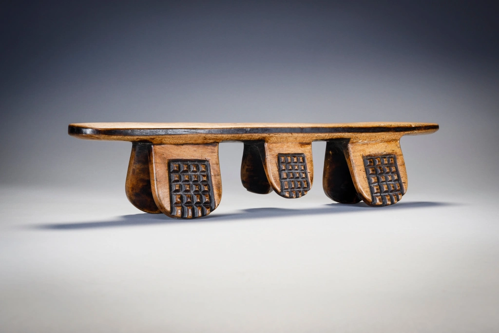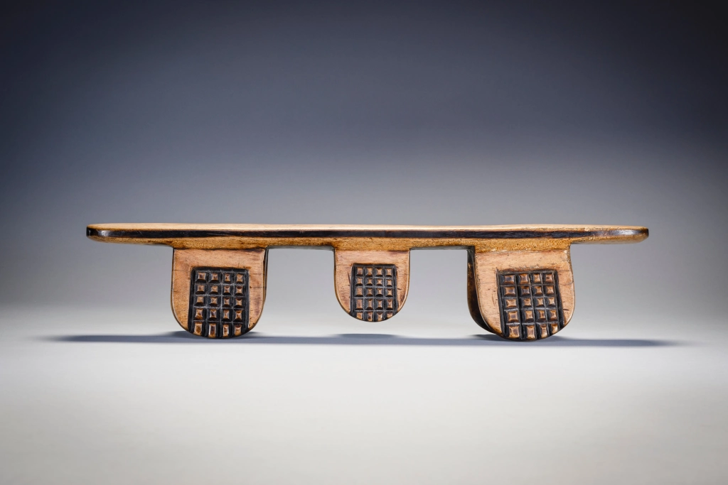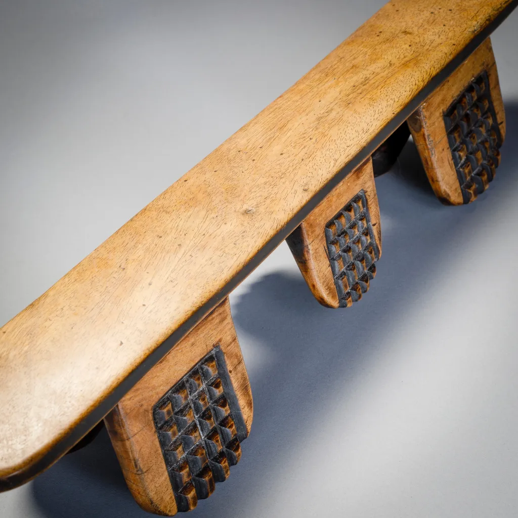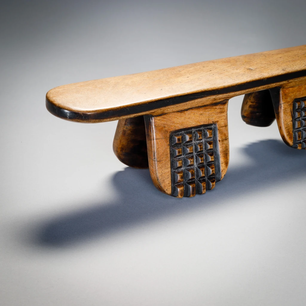 Il s’agit sans aucun doute de l’œuvre de Simamba Sithole. Les pieds de l’appui-tête comportent des blocs d’amasumpa. Arrivé en France vers 1970 cet appui tête est passé par 4 propriétaires français, collectionneurs ou galeries.