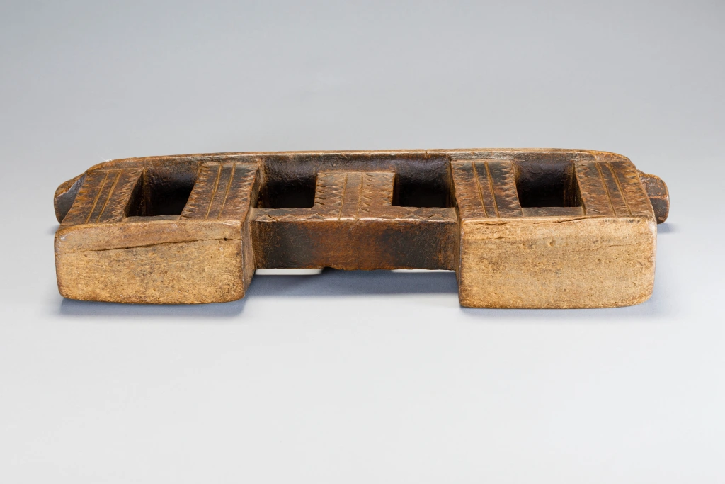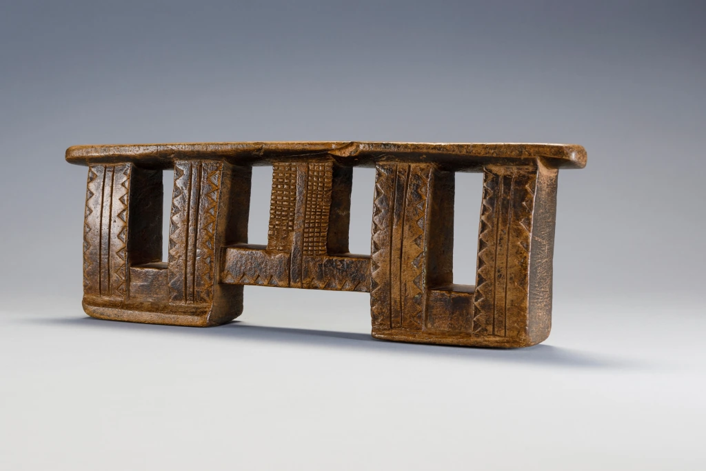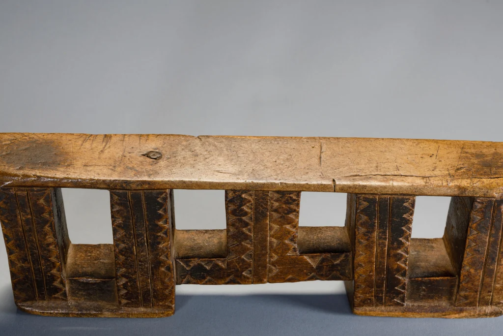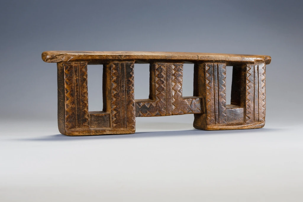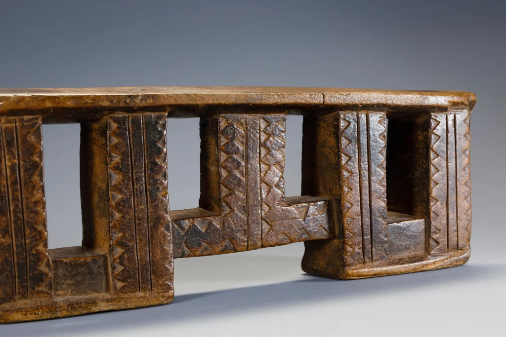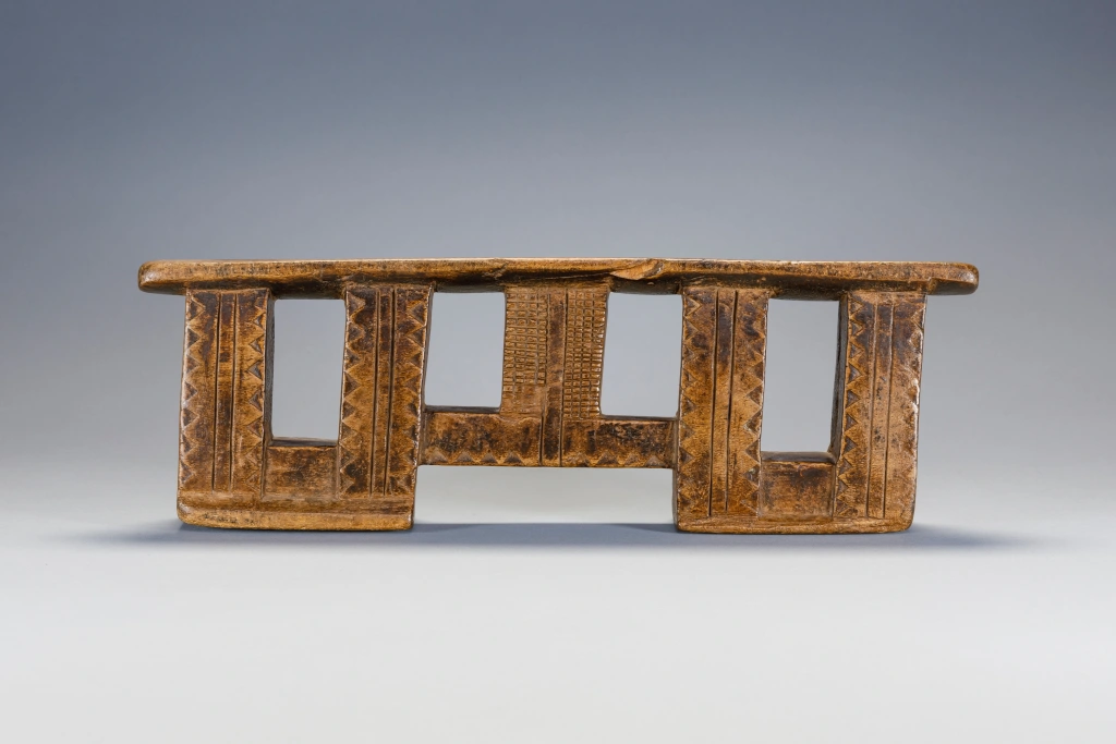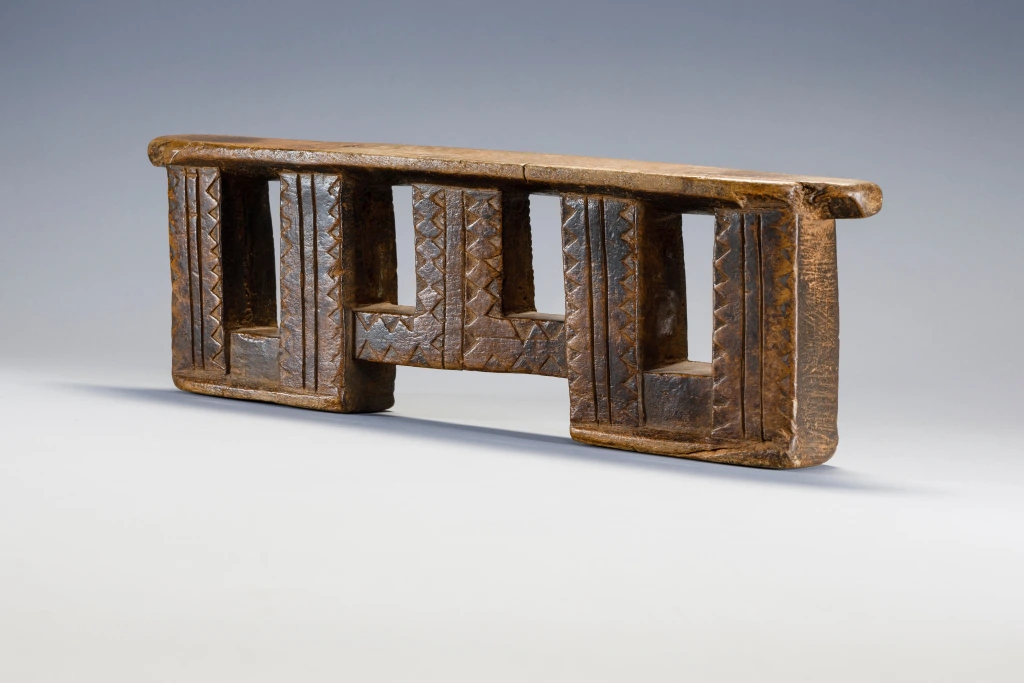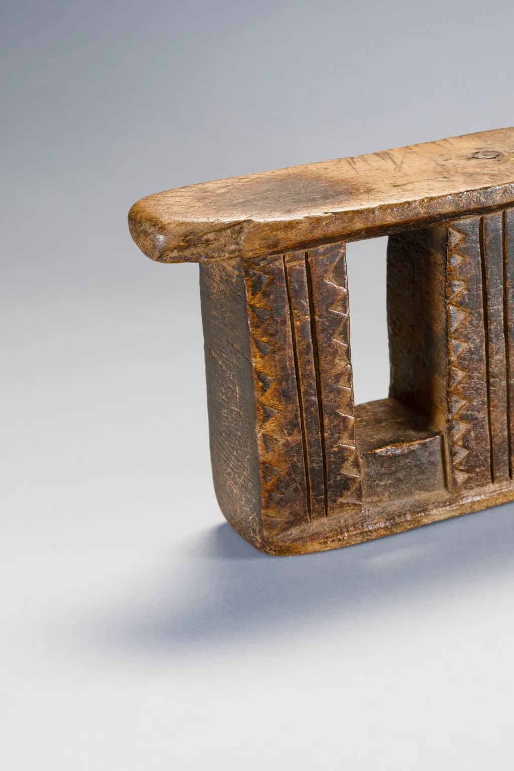 Un magnifique appui-tête zoulou ancien de forme complexe.Il s’agit d’un appui-tête fin et assez petit, qui présente un équilibre merveilleux. Provenant de la région de Nongoma, il est recouvert d’un ensemble de motifs Amasumpa. Sur le premier côté de la partie supérieure, les deux coins ont été ébréchés.