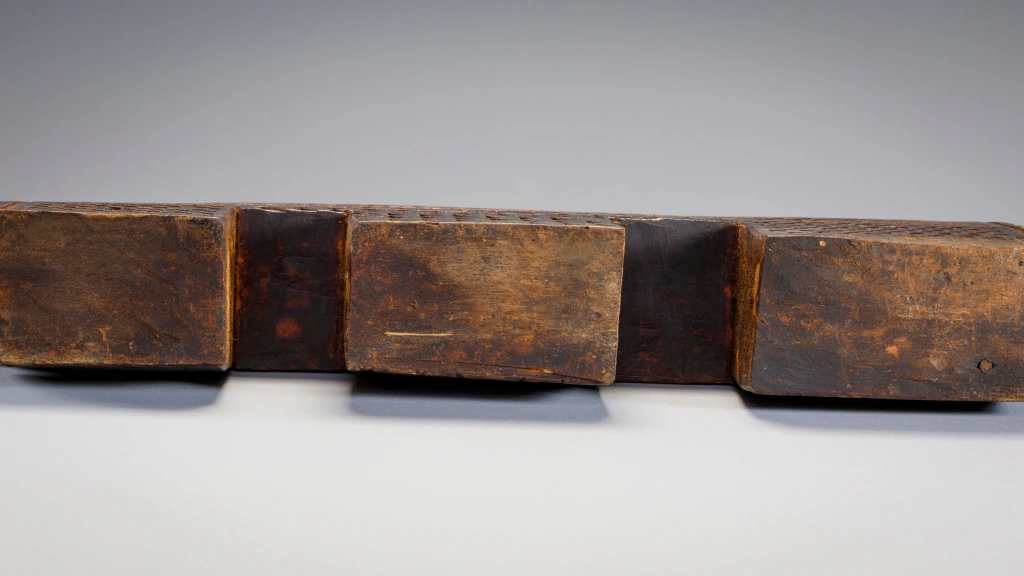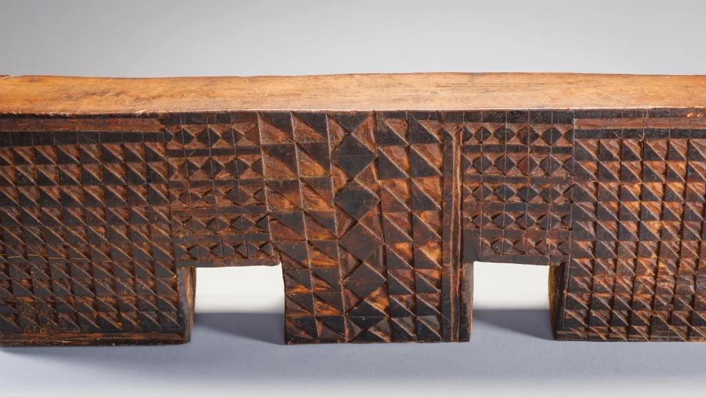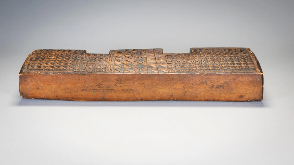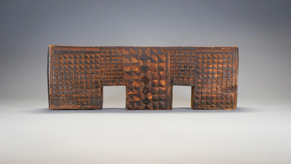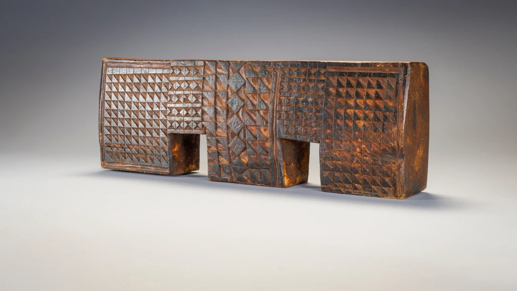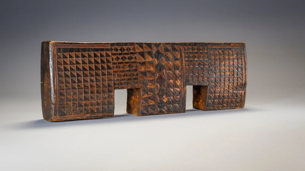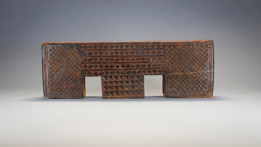 Cet appui-tête est attribué par son propriétaire à Gaishilili Ngubane un sculpteur provenant du haut de la municipalité de Msinga. Cet appui-tête possède trois pieds en forme de blocs. On peut y voir une répétition de pyrogravures inhabituelles, notamment une rainure en forme de cadre qui remonte le long du bord extérieur des pieds et le long des côtés de la plate-forme. Sa couleur, ses motifs et sa forme de double arche en font une pièce extrêmement originale et à forte personnalité.