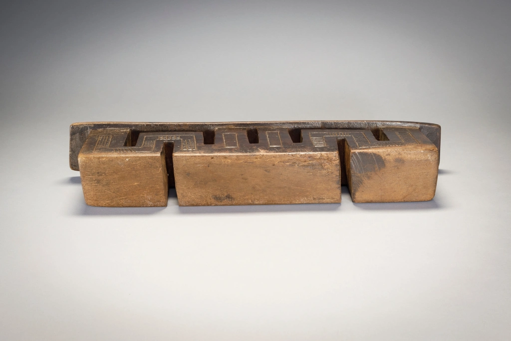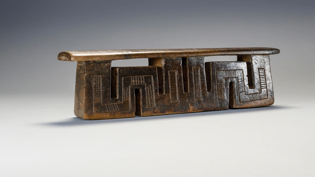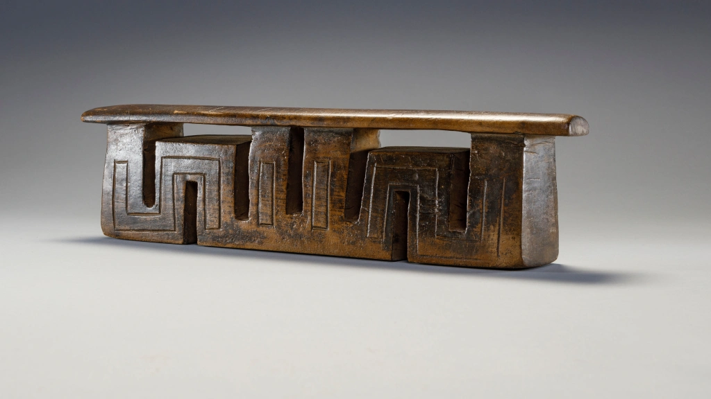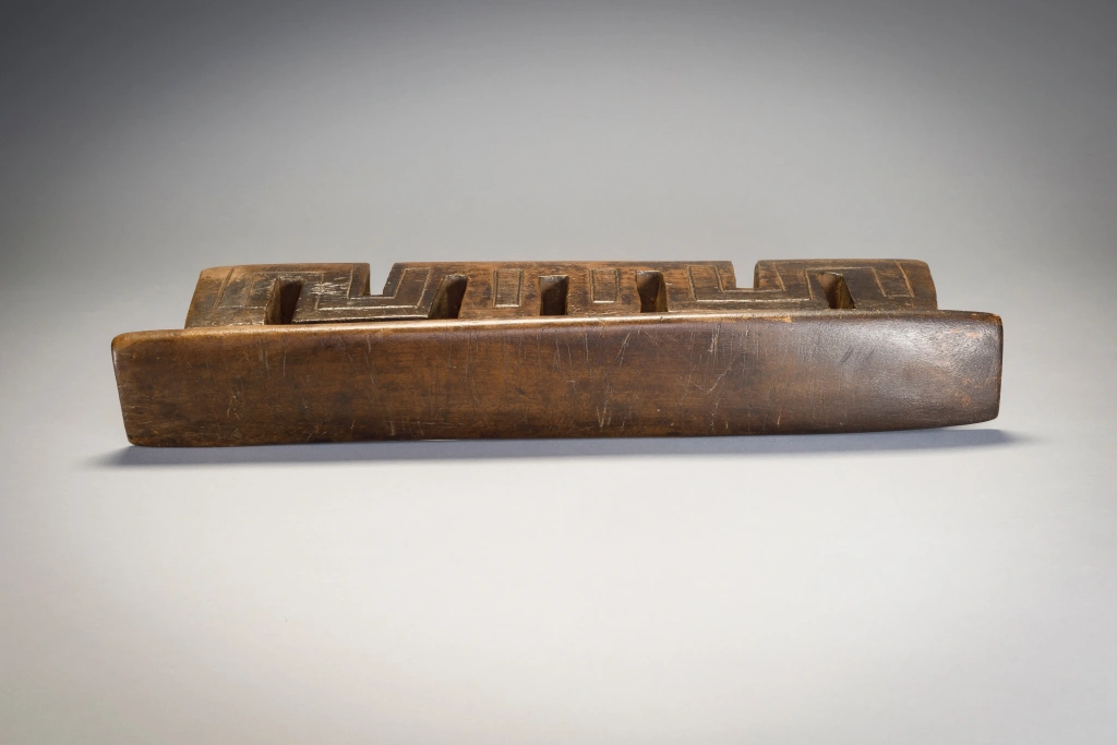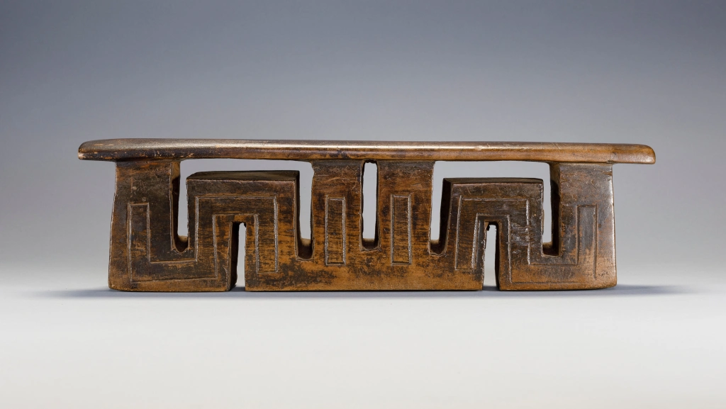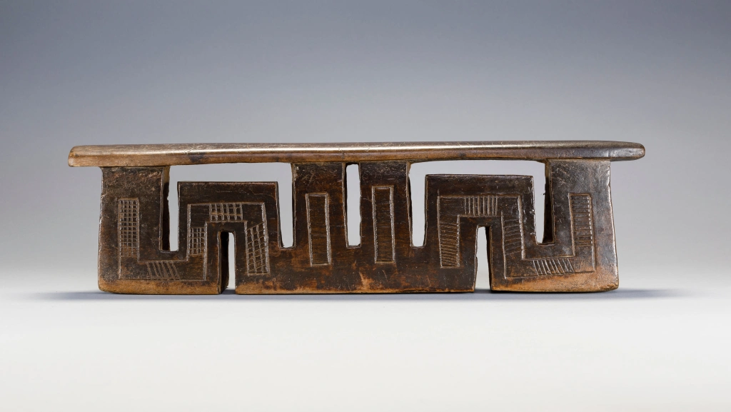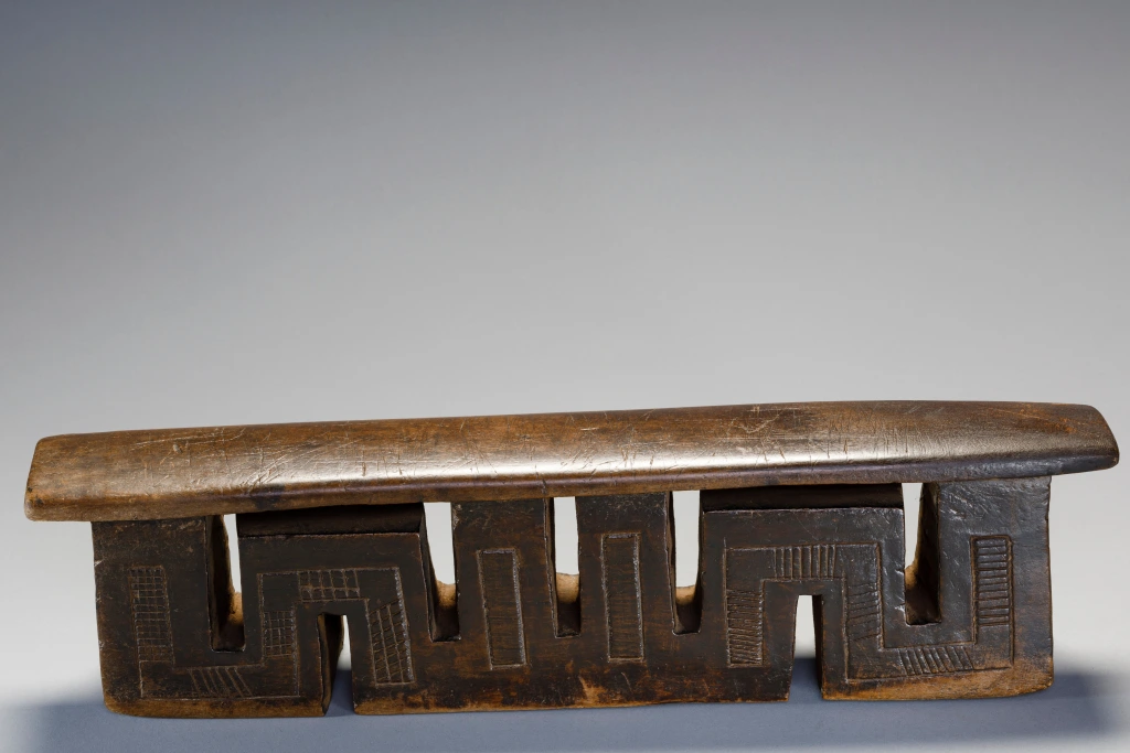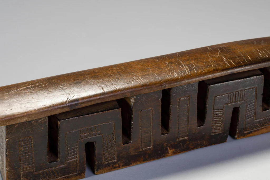 Cet appui-tête a presque la forme d’un serpent, s’écoulant d’une colonne extérieure à l’autre. Cet appui-tête a une forme très typique des appui-têtes fabriqués par Ndabakazulu Myeza.