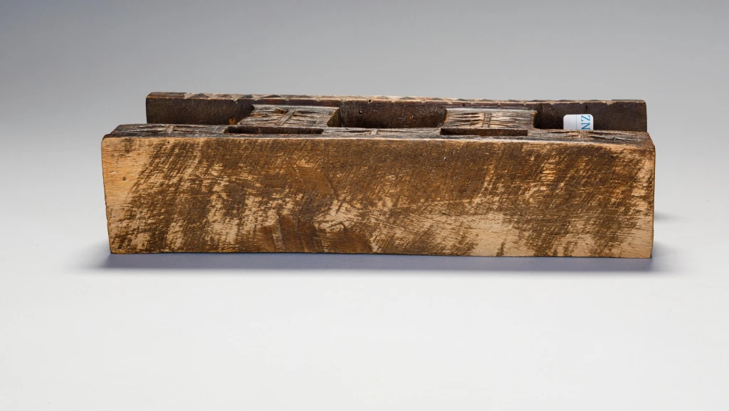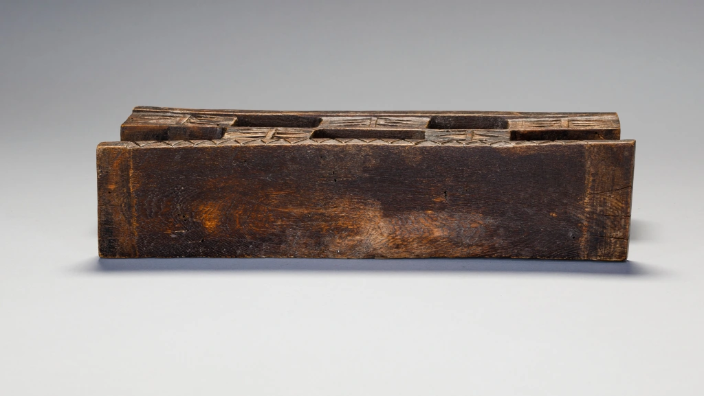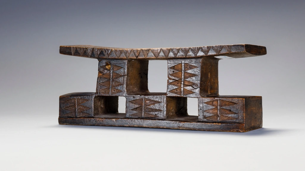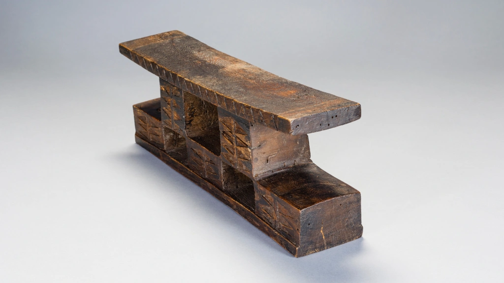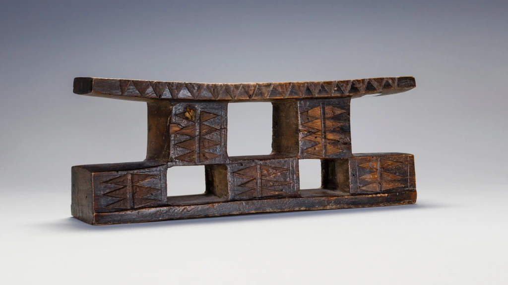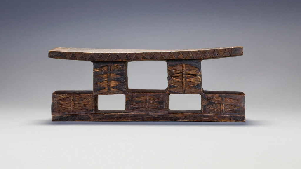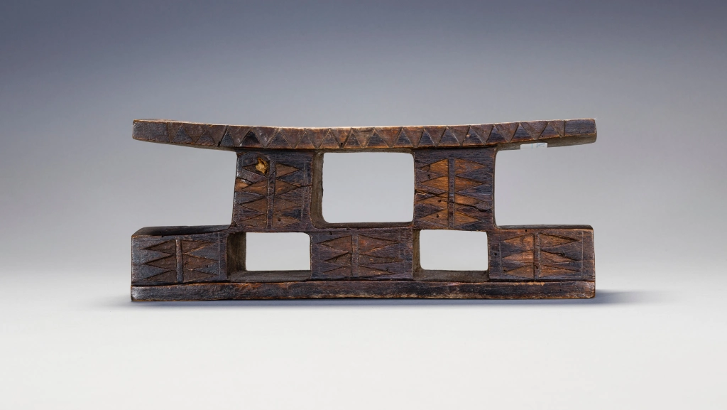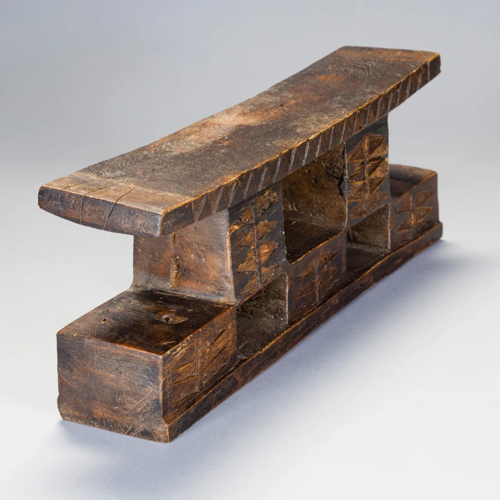 Cet appui-tête se présente sous la forme de cinq blocs empilés, trois sur la base et deux au-dessus de ces derniers, soutenant la partie supérieure. Les blocs sont décorés de longs triangles dos à dos et la plate-forme est bordée du motif triangulaire commun aux premières pièces collectées au KwaZulu-Natal.Cet appui-tête a été échangé par Bert Garrebeck avec le musée d’Ulundi contre trois poteries zouloues qu’ils n’avaient pas dans leur collection. Il avait été offert au musée par un militaire Anglais qui résidait à Oudtshoorn dans les années 1940. Le propriétaire initial était probablement cireur de chaussures au regard de la forme de son appui-tête.