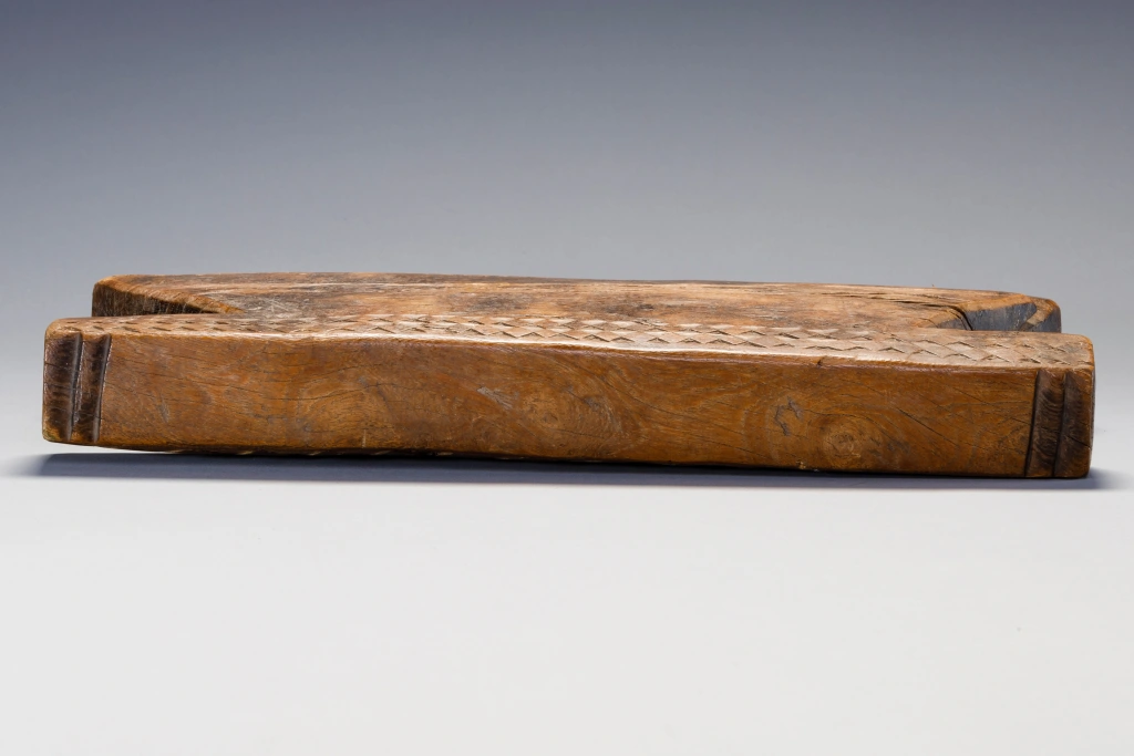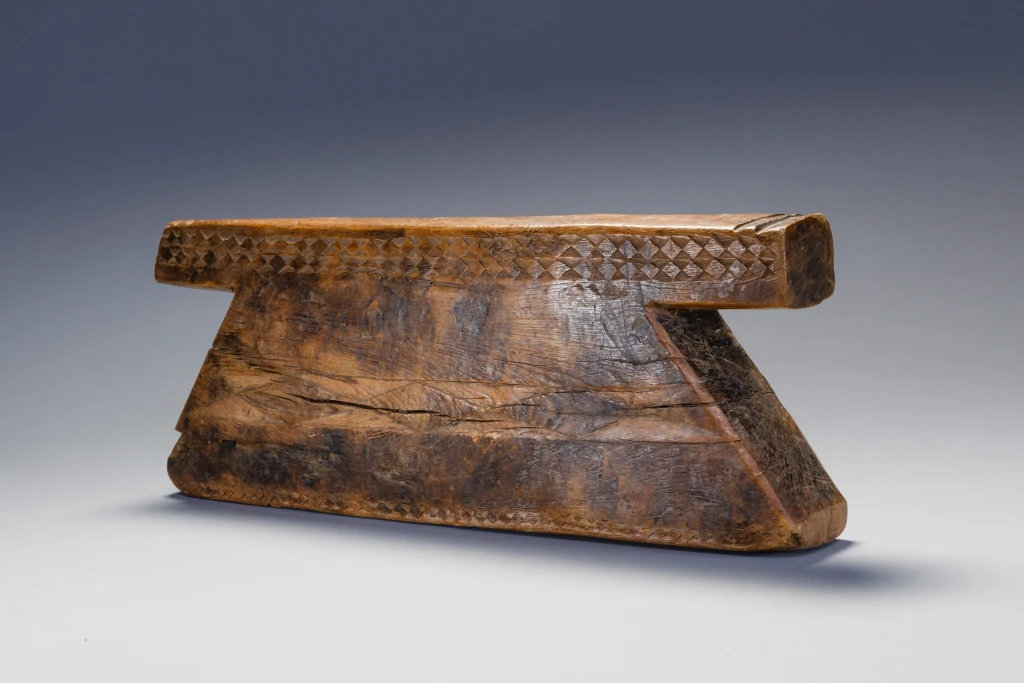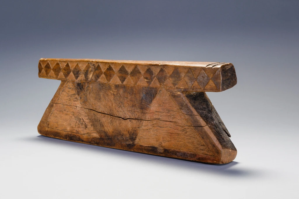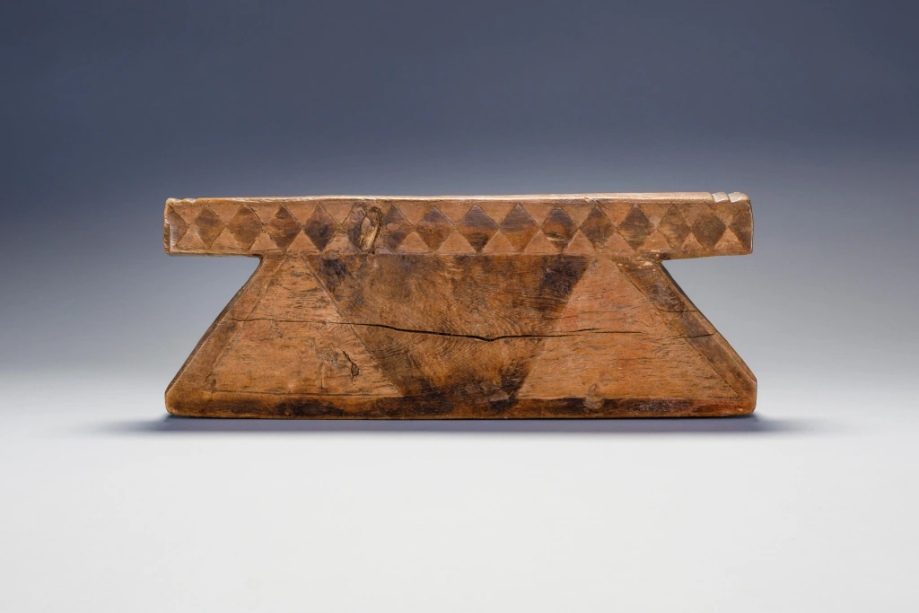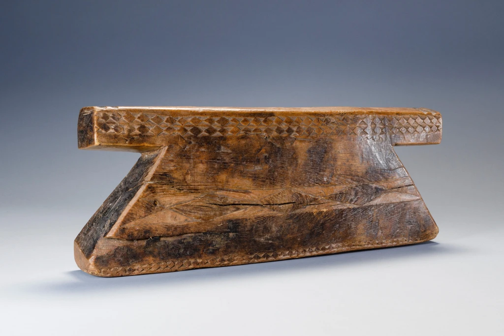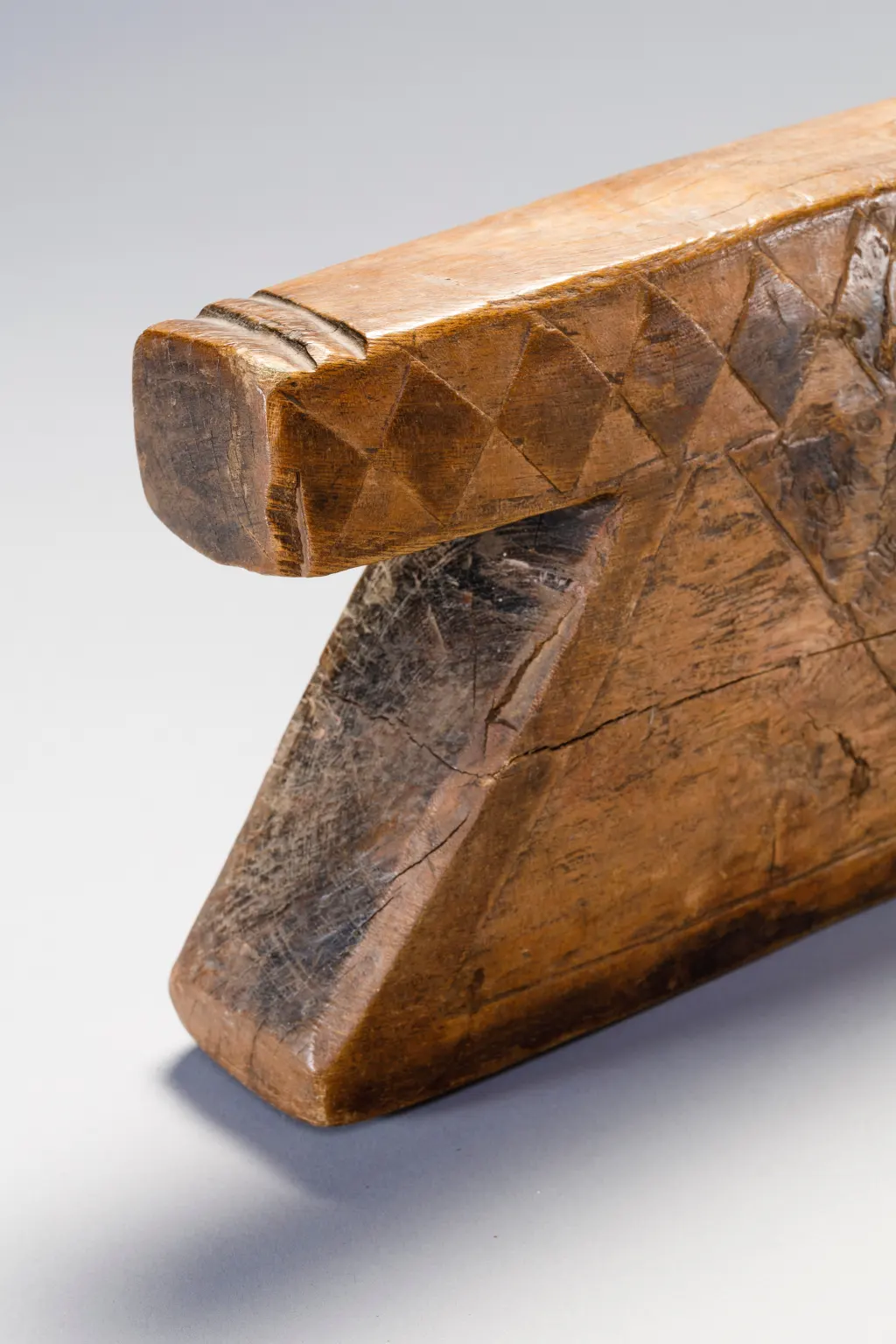 Les côtés inclinés de cet appui-tête se découpent nettement sous une plate-forme massive décorée de formes de diamants. Cette pièce a été collectée entre Pomeroy et Tugela Ferry dans la région de Msinga par Steve de Combes , collectionneur de la région de Capetown en 2011.