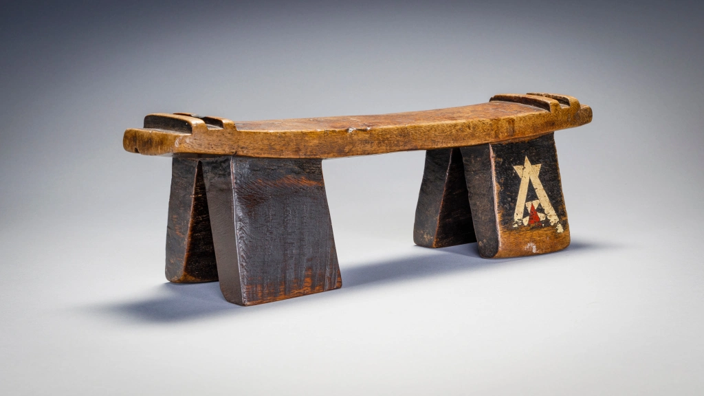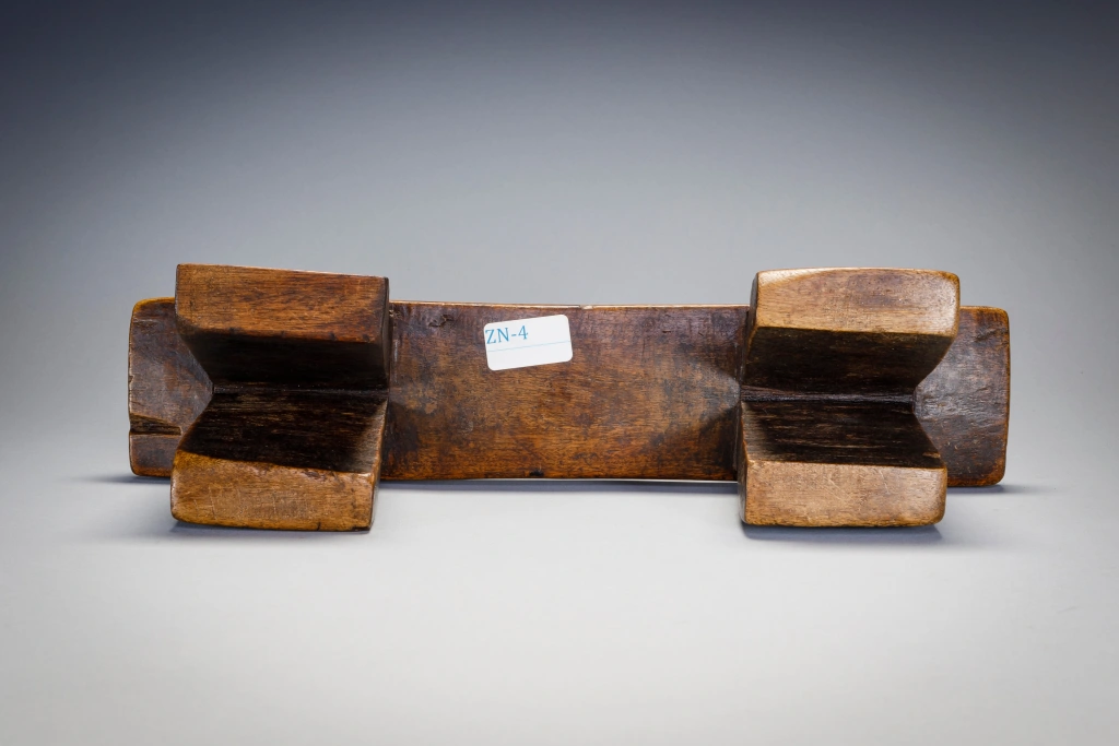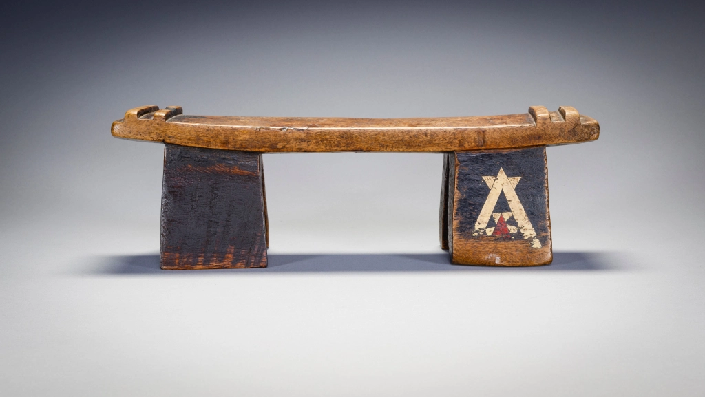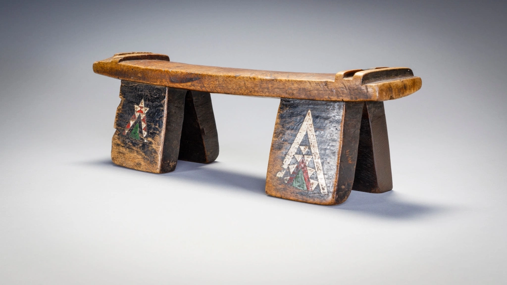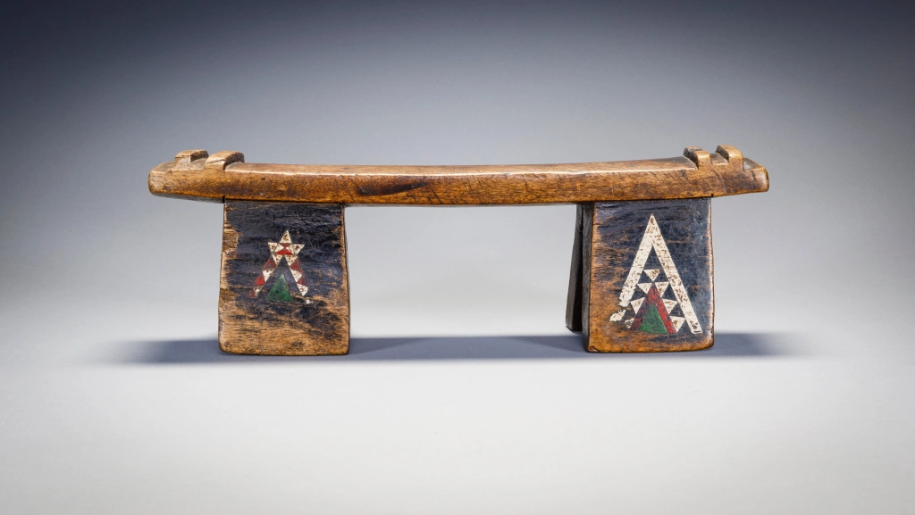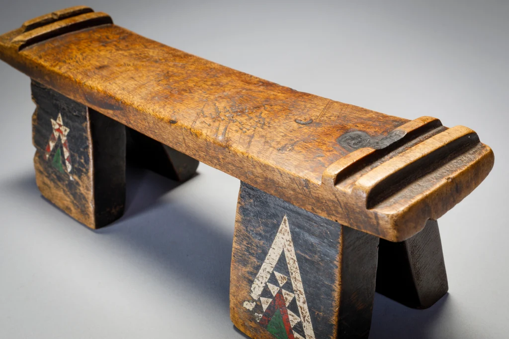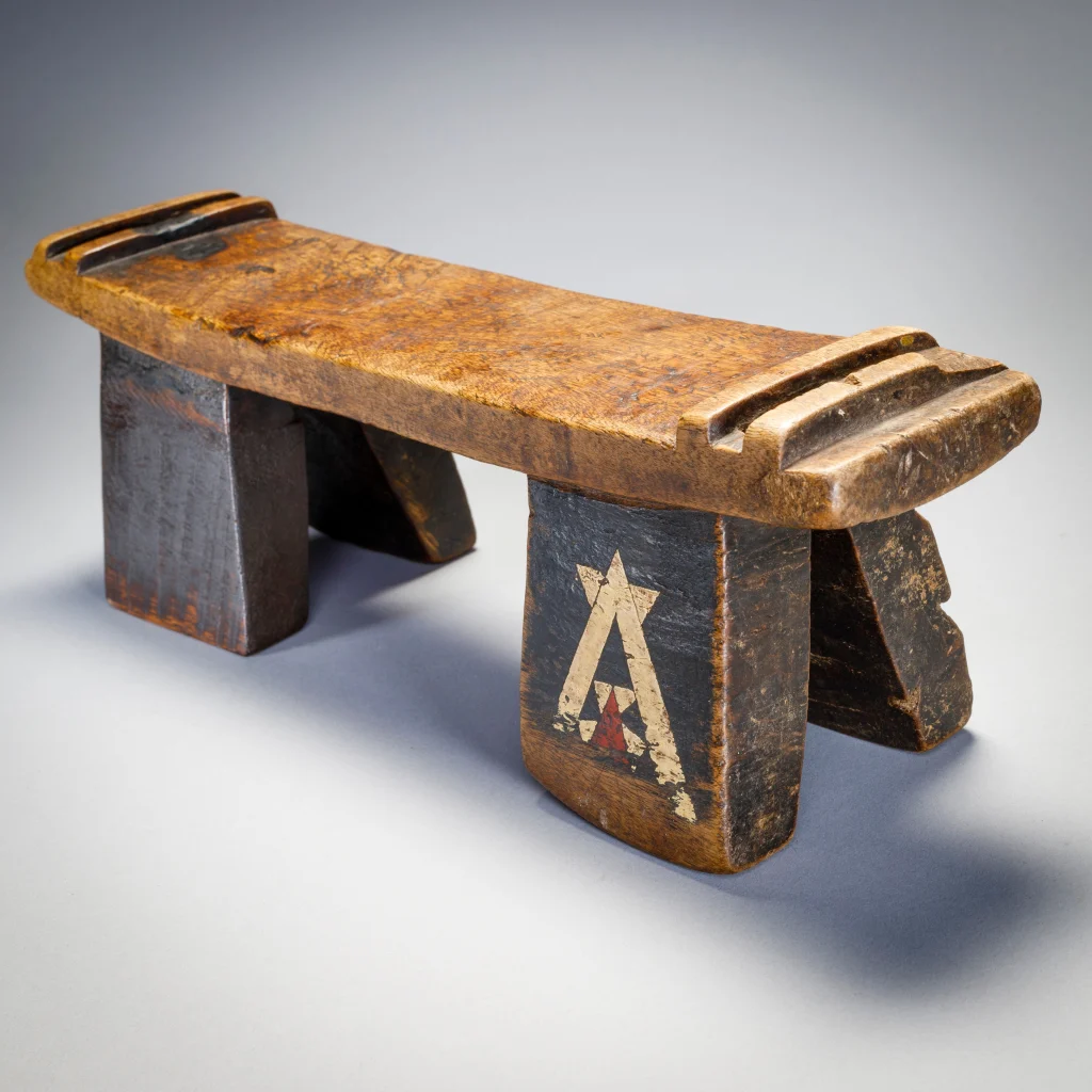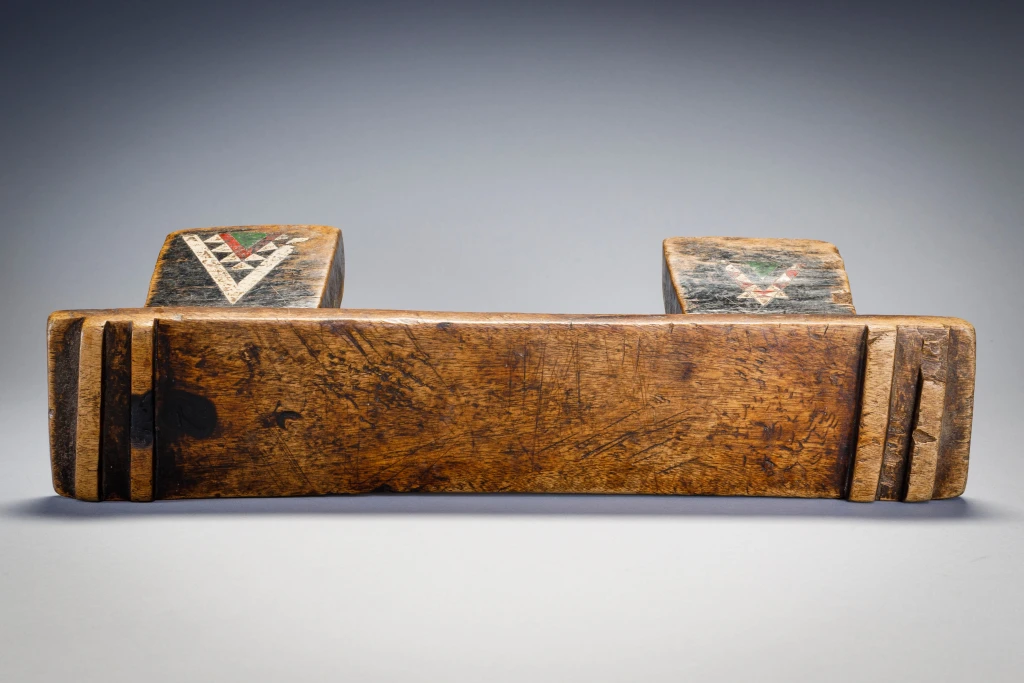 Appui-tête à quatre pieds, avec des crêtes prononcées aux extrémités de la partie supérieure. Ses pieds ont été peints avec des motifs perlés très similaires à ceux peints sur les portes-matelas (amabhaxa) de la région de Nongoma, au centre de Zoulouland. On retrouve également ces motifs sur les boucles d’oreilles des femmes Zouloues. On peut imaginer que cet appui-tête ait fait partie d’un trousseau de dot comprenant une paire de boucles d’oreilles assorties à l’appui-tête.