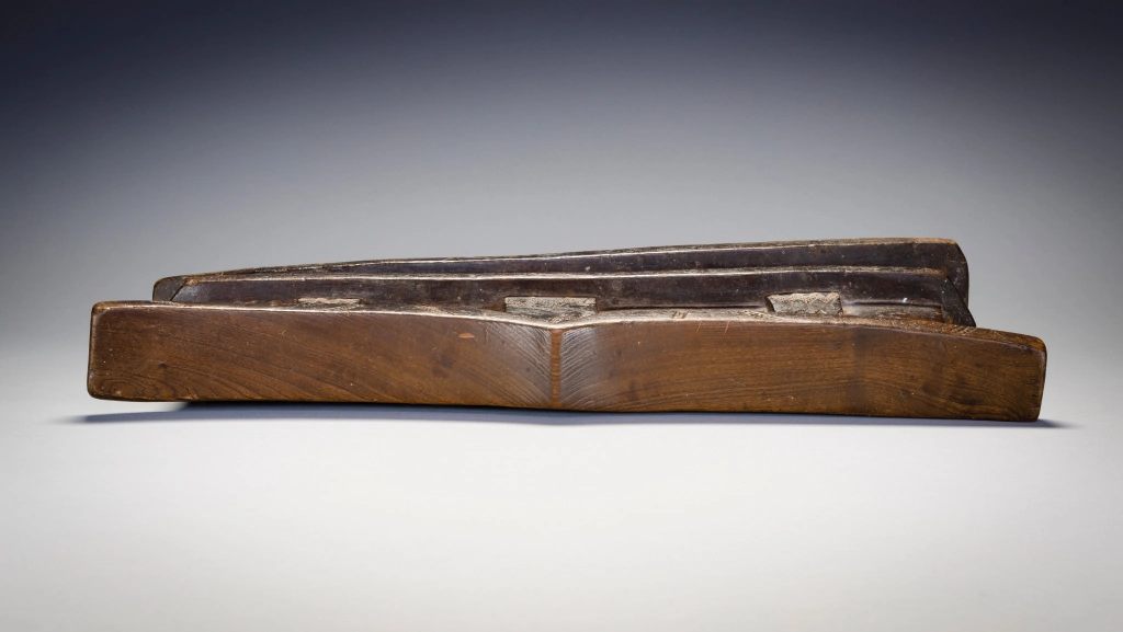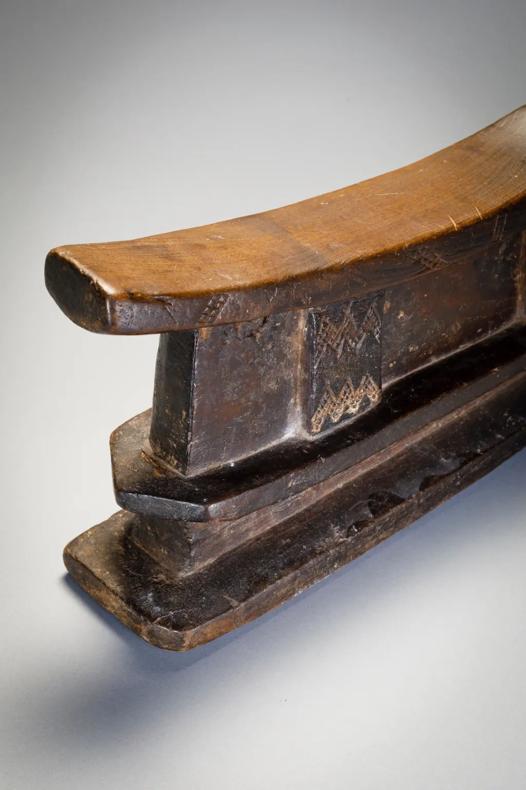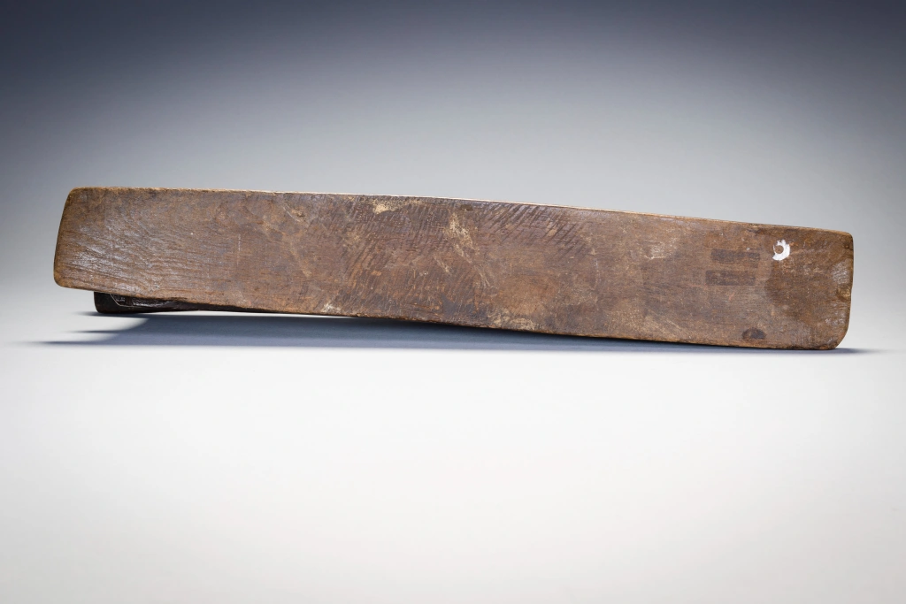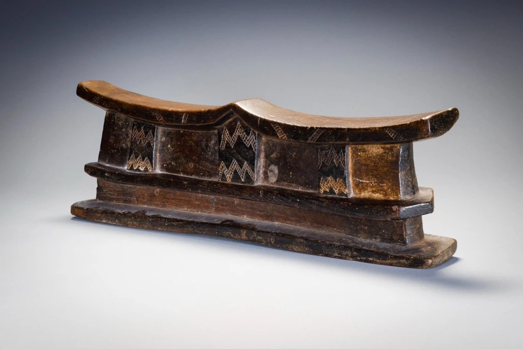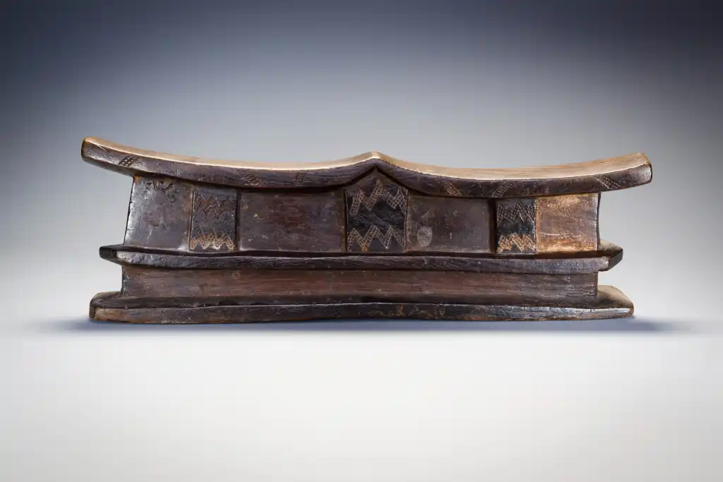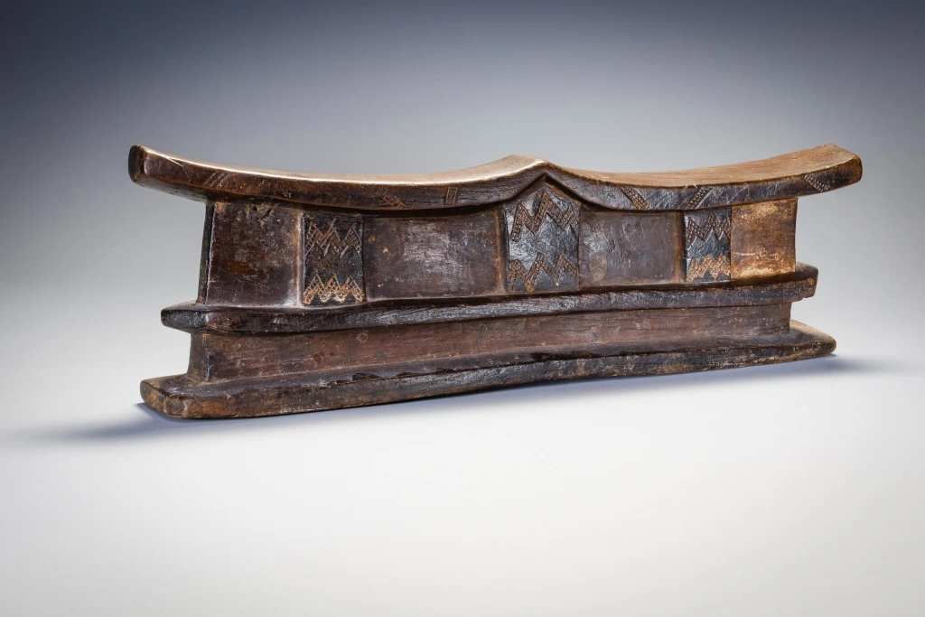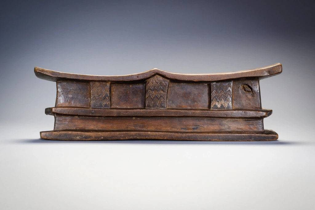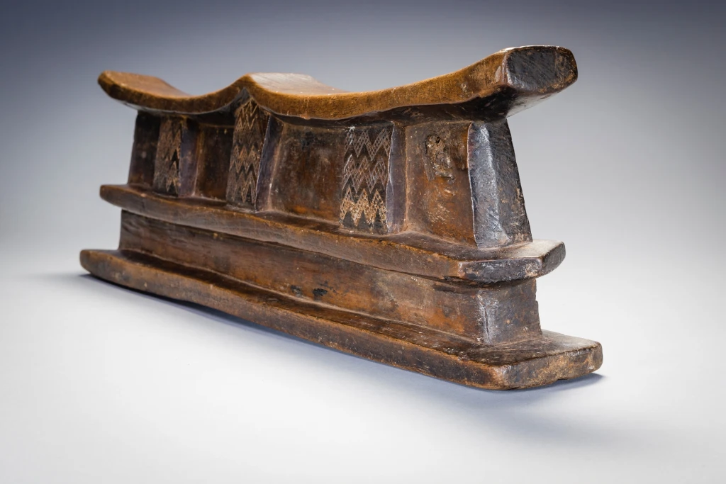 Un grand appui-tête double comportant plusieurs couches. La plate-forme repose sur trois colonnes décorées dans le corps massif de l’appui-tête. La partie supérieure de l’appui-tête repose à son tour sur une base inhabituelle à double couche dégageant une puissance inhabituelle.