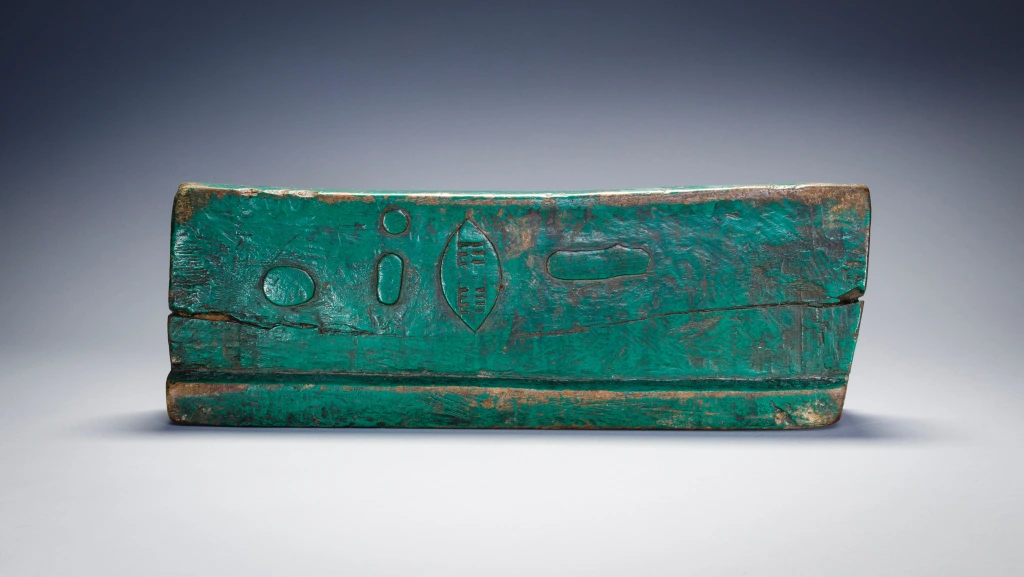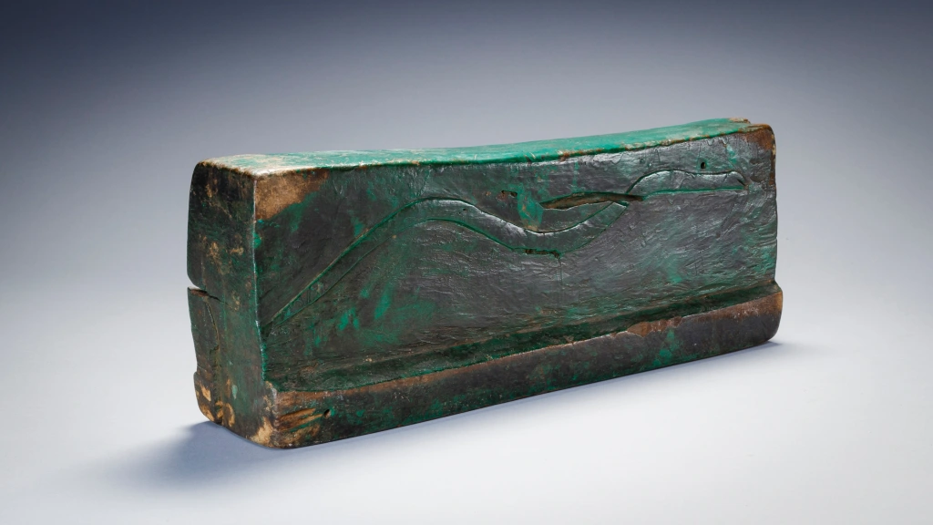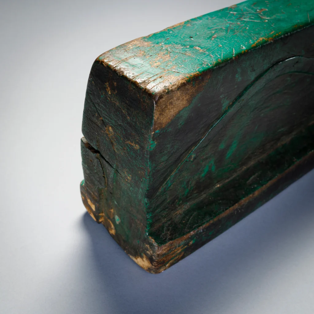 Bert Garrebeck a recueilli cet appui-tête vert en décembre, à l’approche de Noël en 1983, dans le district de Nongoma.Il est resté environ six semaines dans les montagnes (il y a appris la langue zouloue , petit à petit…) et a commencé à voyager au Kwazulu Natal vers 1974 jusqu’en 1997.Il a découvert l’appui-tête vert ainsi qu’un appui-tête double et beaucoup de matériel zoulou fantastiques chez une même famille.Ces gens ont été chassés par les « afrikaners » blancs vers 1950 jusqu’au nord du Kwazulu Natal.L’appuie-tête vert (izigqiki) est utilisé par l’homme et la femme mariés comme soutien pour leurs nuques pendant leur sommeil.Il y a une raison particulière à la couleur verte… Bert Garrebeck a collectionné plusieurs centaines de vaisselles zouloues, dont certaines ont des couleurs bleues , jaunes ou vertes.En effet, lors des grandes fêtes où l’on buvait beaucoup de bière…. On savait, grâce à la couleur de la vaisselle , à qui elle appartenait.Cette caractéristique, associée à de petits motifs décoratifs apparemment placés au hasard, dont un bouclier et la lettre « i », en fait une pièce inhabituelle.