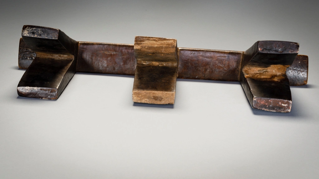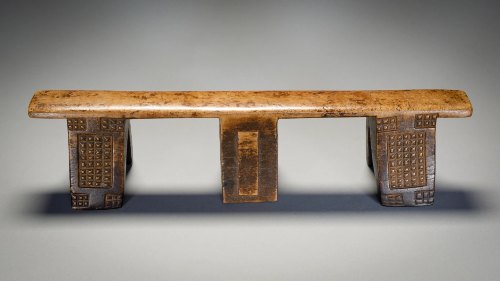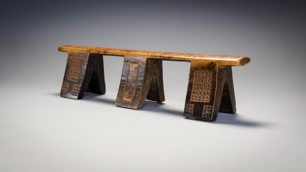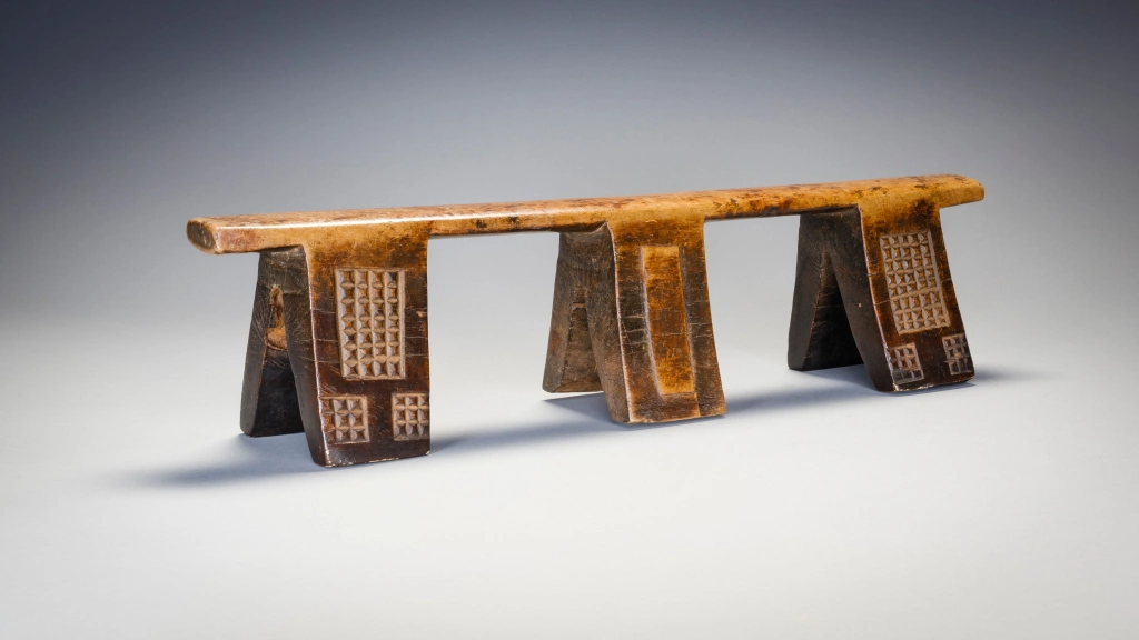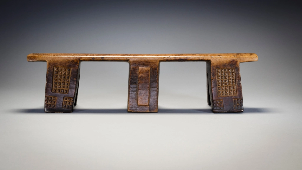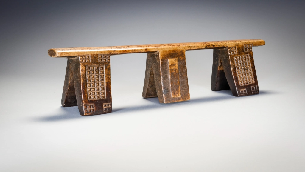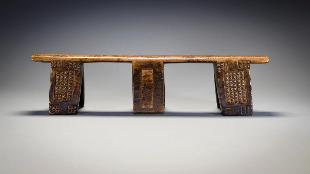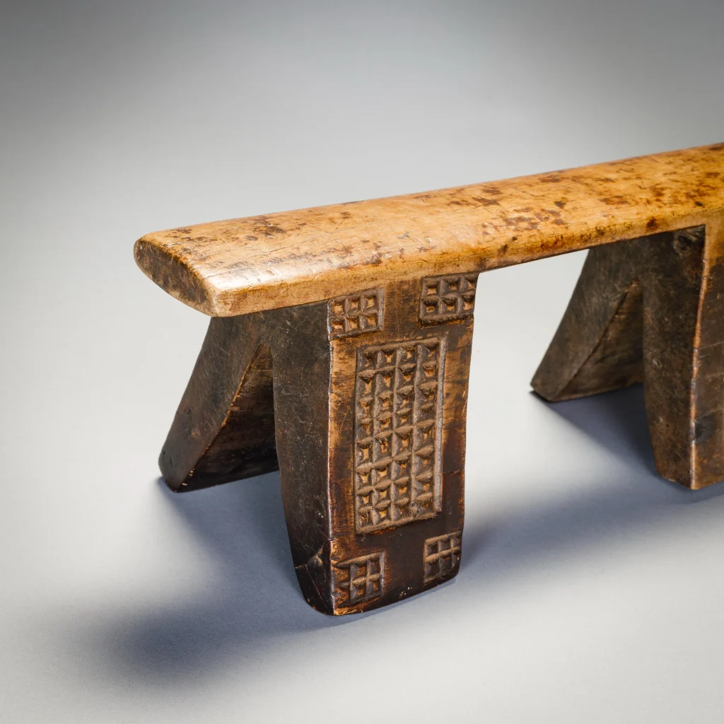 Cet ancien appui-tête à six pieds présente un motif complexe, avec des blocs d’amasumpa sur ses pieds extérieurs et un autre motif plus simple sur les pieds centraux. Il est inhabituel et a une partie supérieure remarquablement droite, cet appui-tête pourrait également être l’œuvre d’un sculpteur de la montagne Madondo.