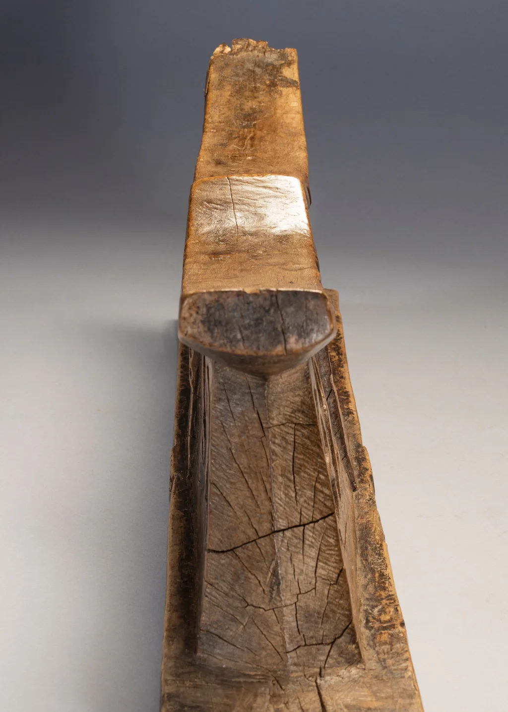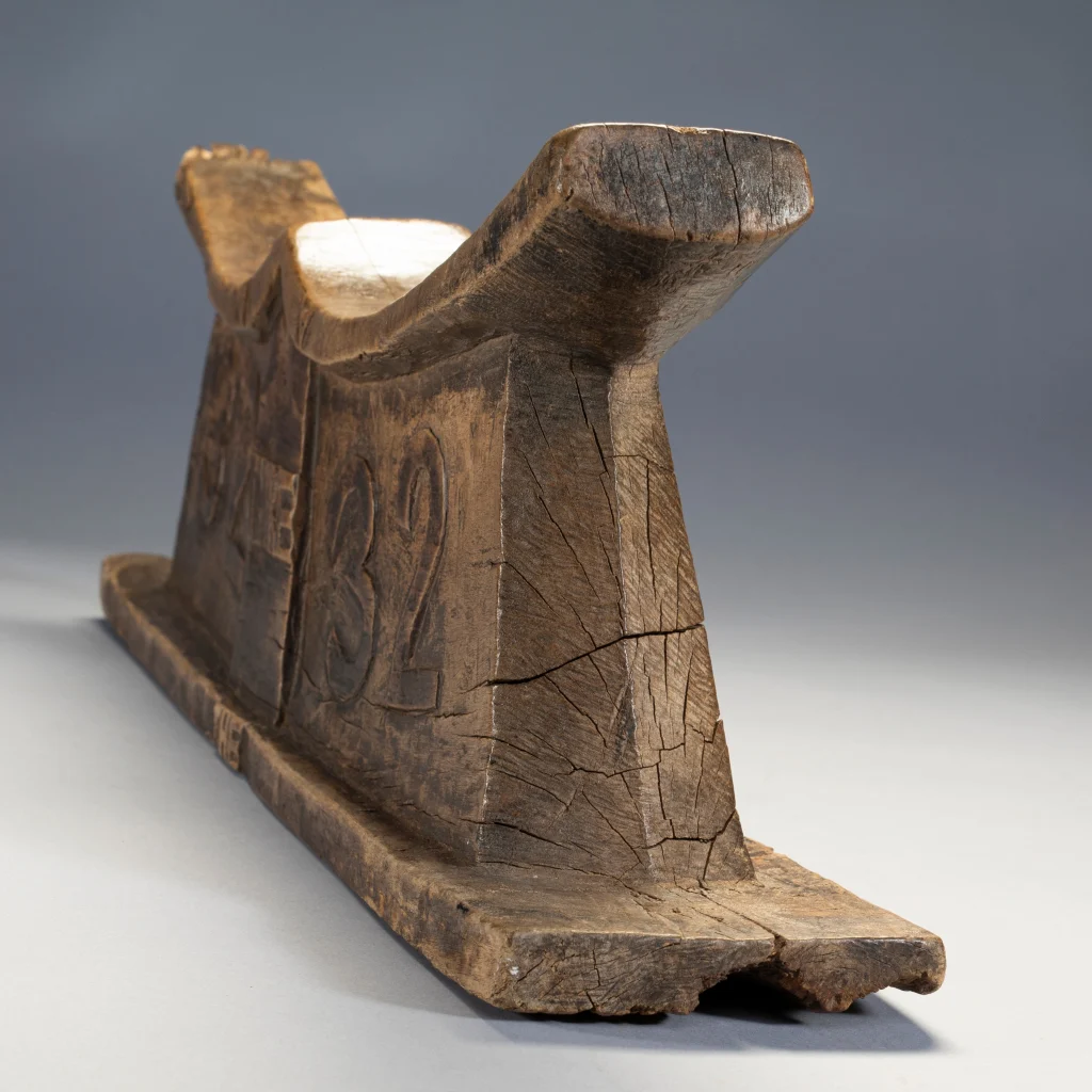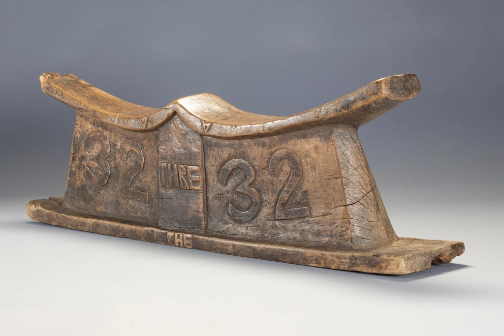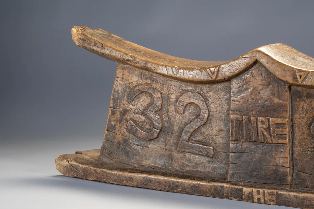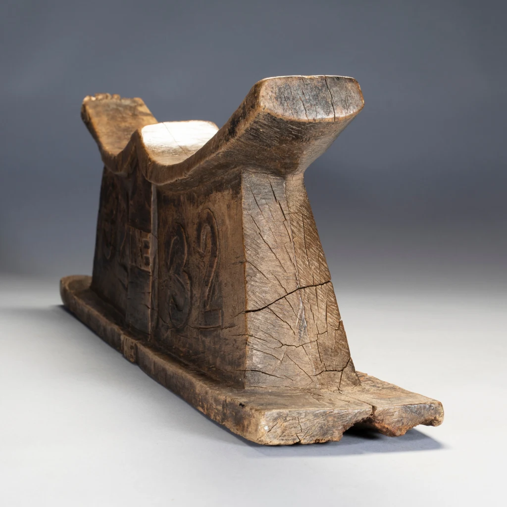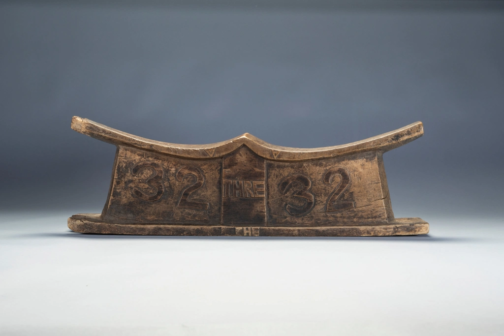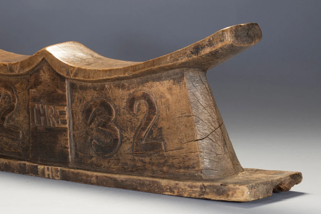 Un appui-tête massif a double bloc, avec un corps angulaire. Sculptée en relief, une colonne centrale divise l’appui-tête à l’intersection des deux sections incurvées de la partie supérieure. Les décorations consistent en des chiffres et en des lettres gravées sur les deux côtés désignant comme souvent soit la date et le mois de la fabrication de l’objet soit la date et le mois de l’occasion pour laquelle il a été conçu.