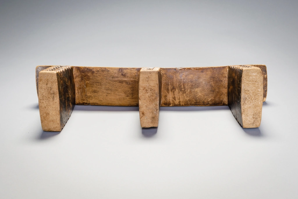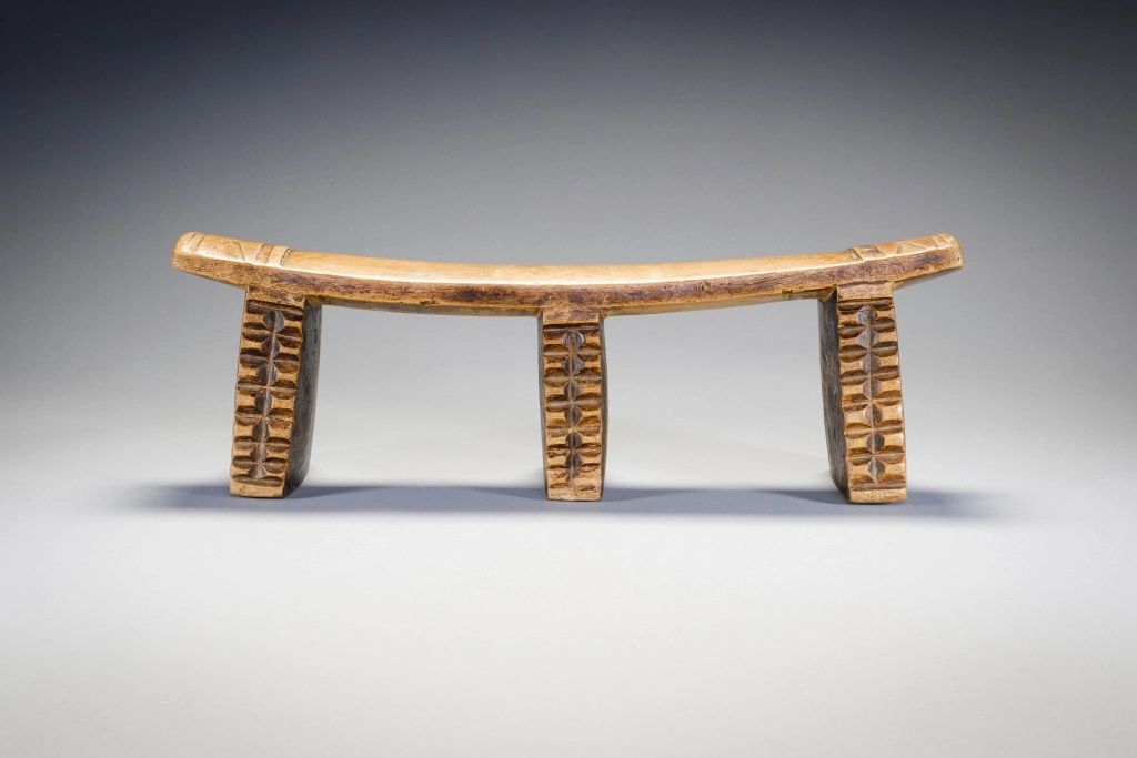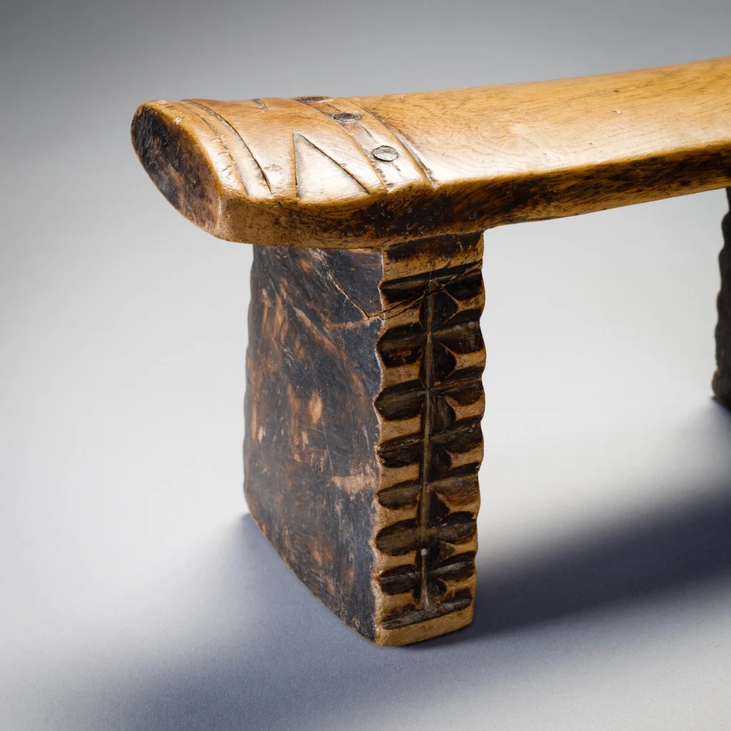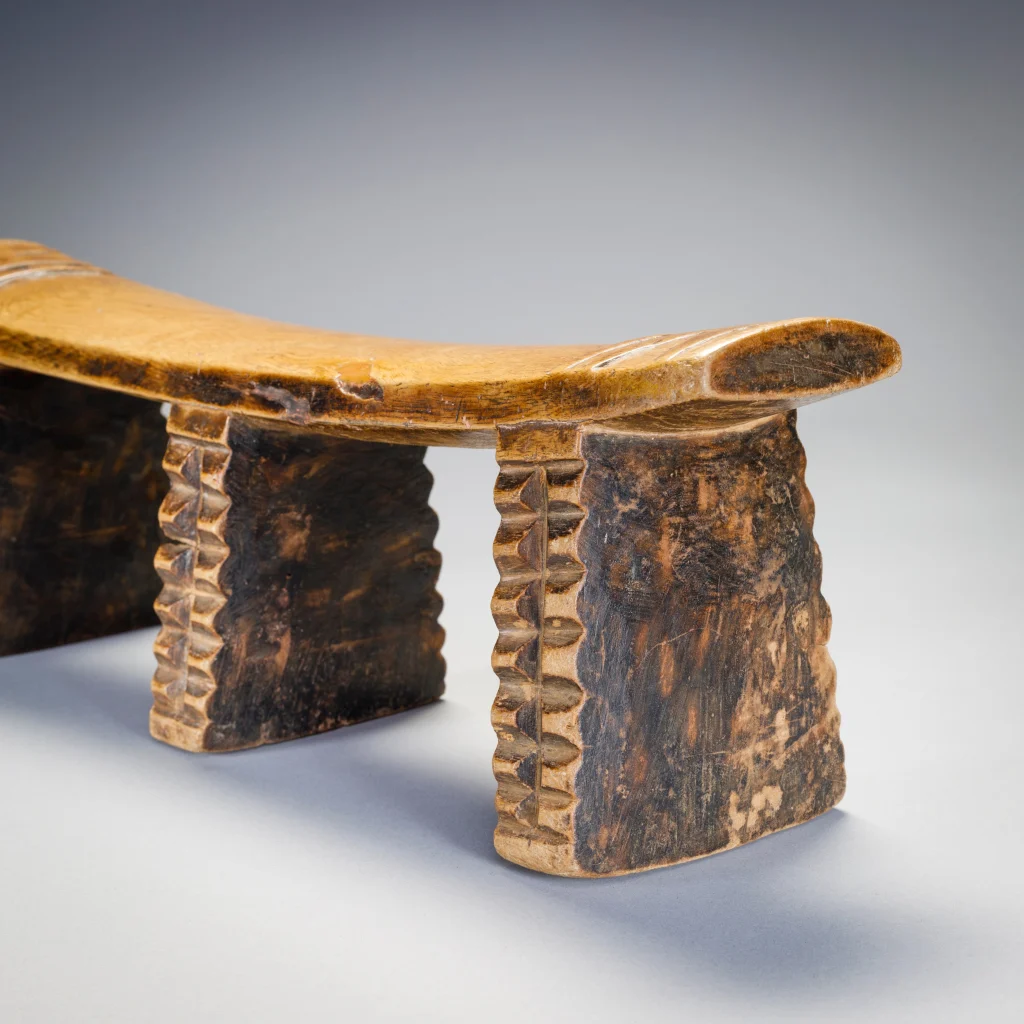 Cet appui-tête ancien présente une surface de couchage gracieusement incurvée, avec d’intéressants motifs en relief aux extrémités et des pieds inhabituellement fins qui sont décorés d’une double rangée d’amasumpa.