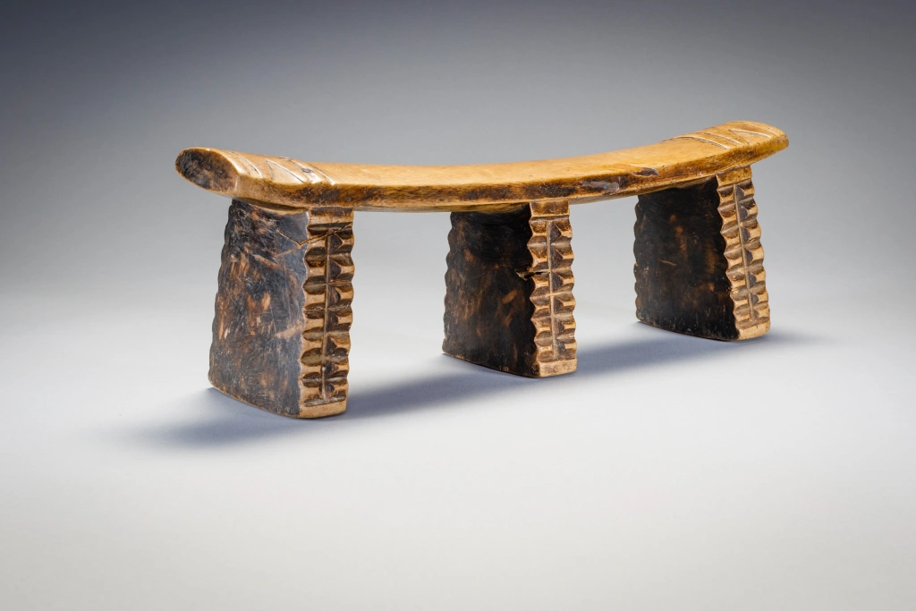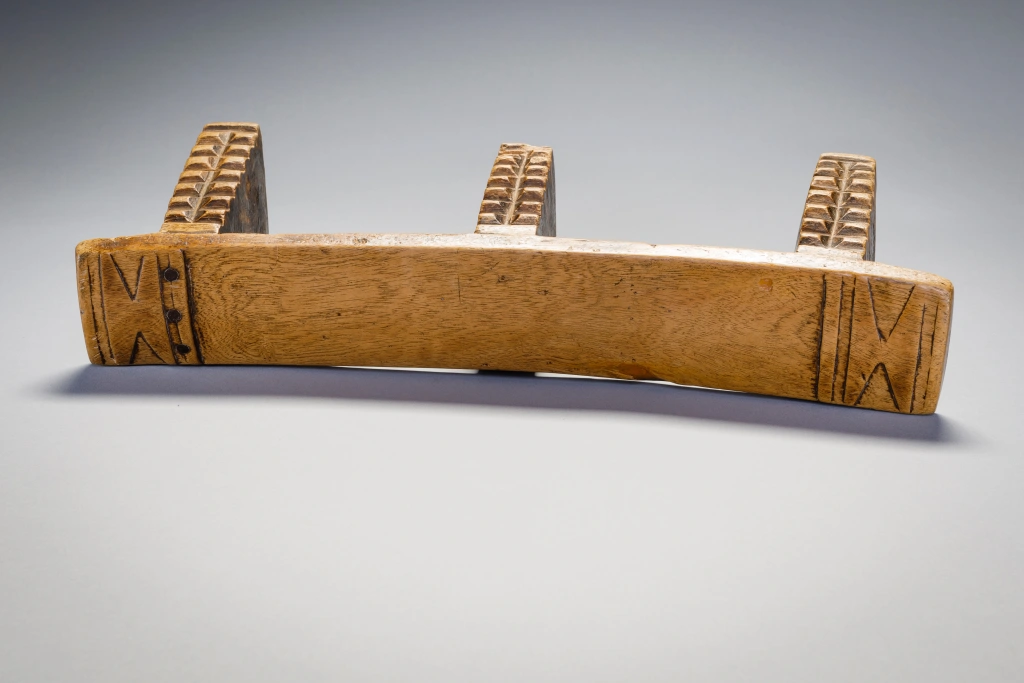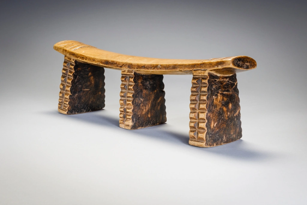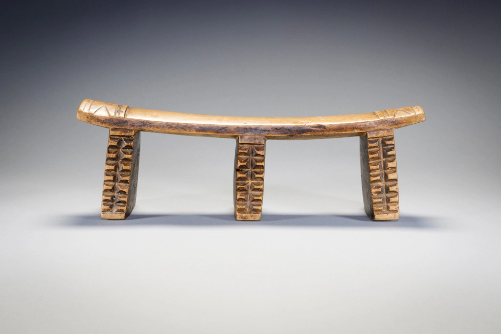 Cet appui-tête ancien présente une surface de couchage gracieusement incurvée, avec d’intéressants motifs en relief aux extrémités et des pieds inhabituellement fins qui sont décorés d’une double rangée d’amasumpa.