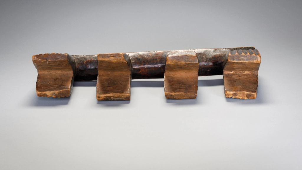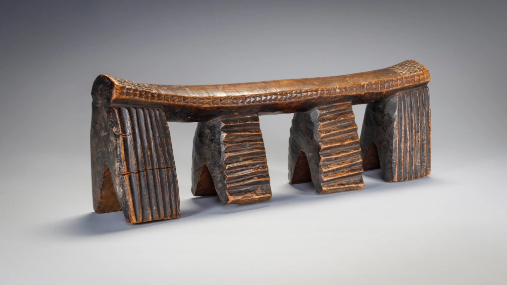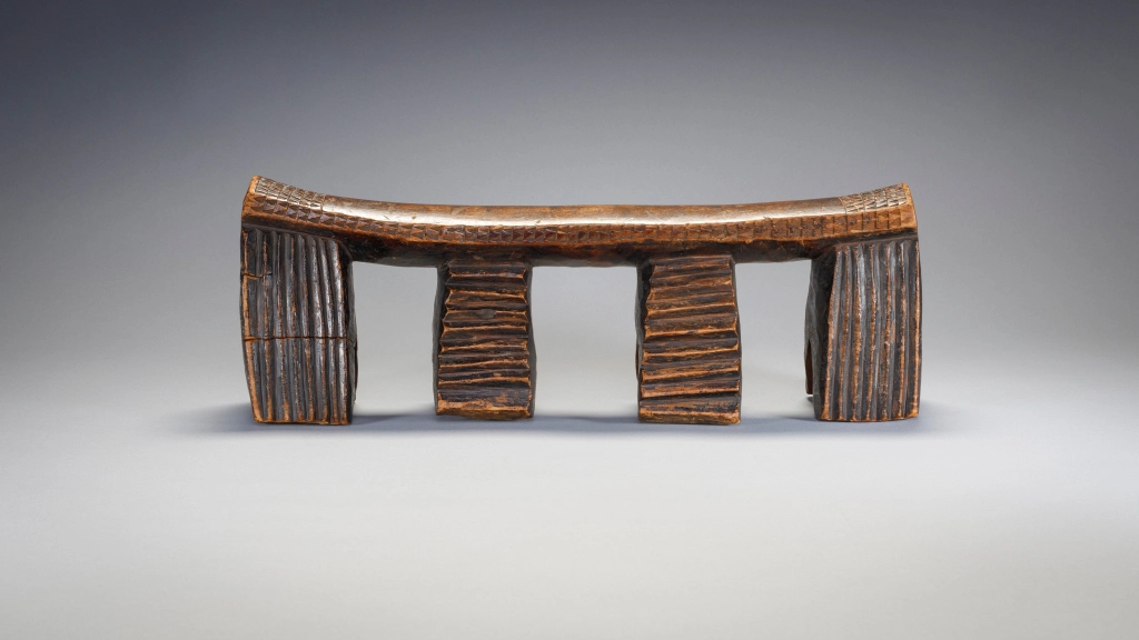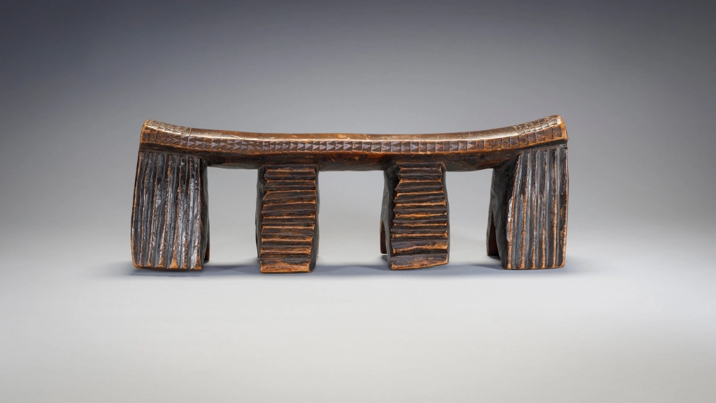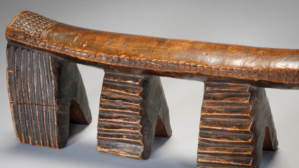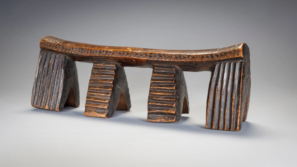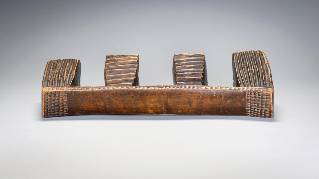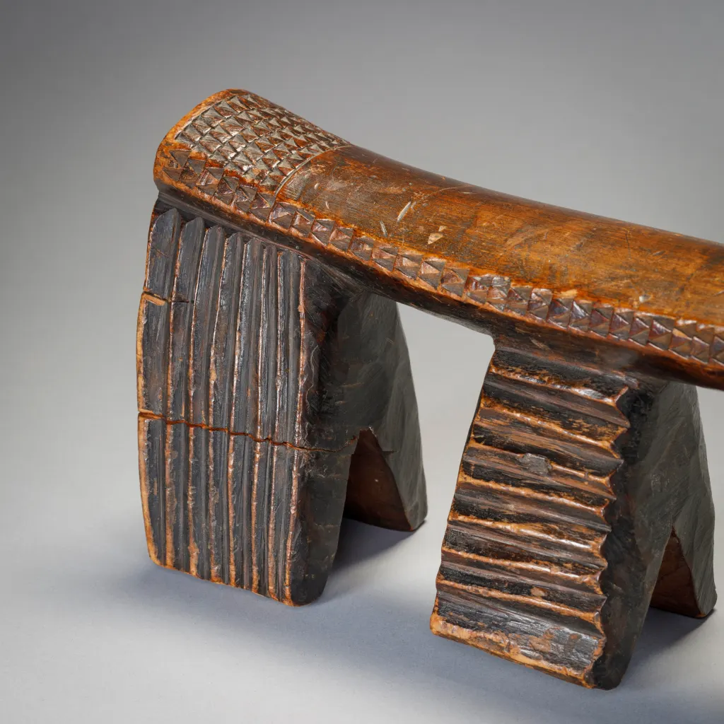 Appui tete Zoulou à quatre pieds terminés en fourche et comportant des rainures verticales ou horizontales. A noter les  fines gravures d’amasumpa sur la tranche de la barre d’appui et aux extrémités de celle ci. On peut aisément sentir le vécu de cet objet au travers de sa superbe patine.