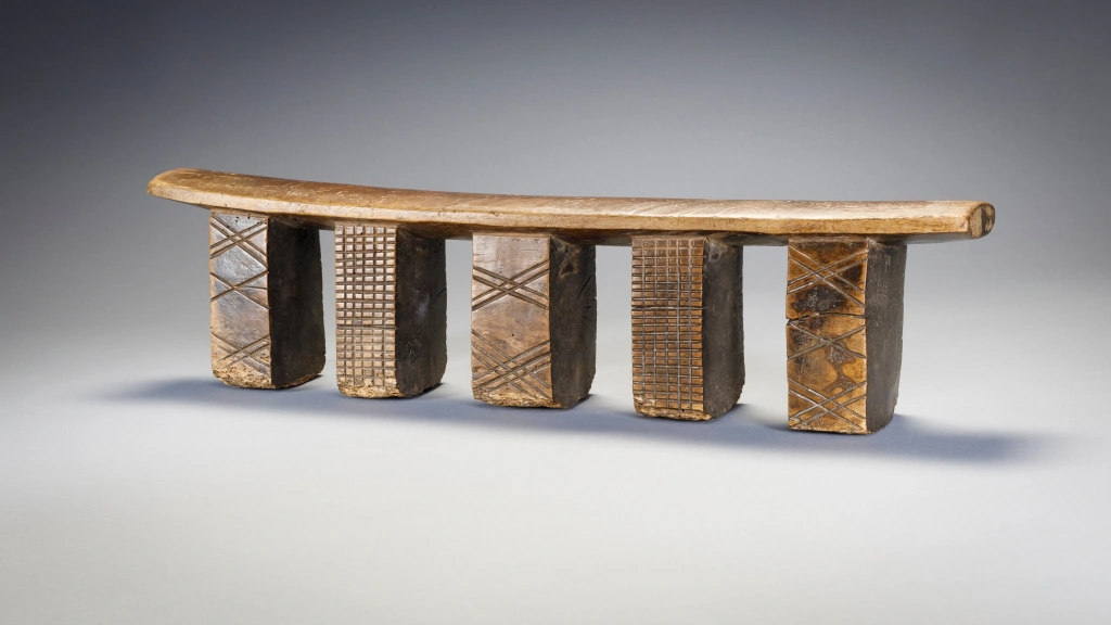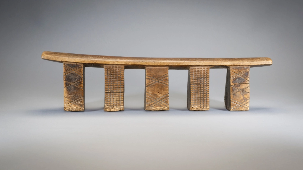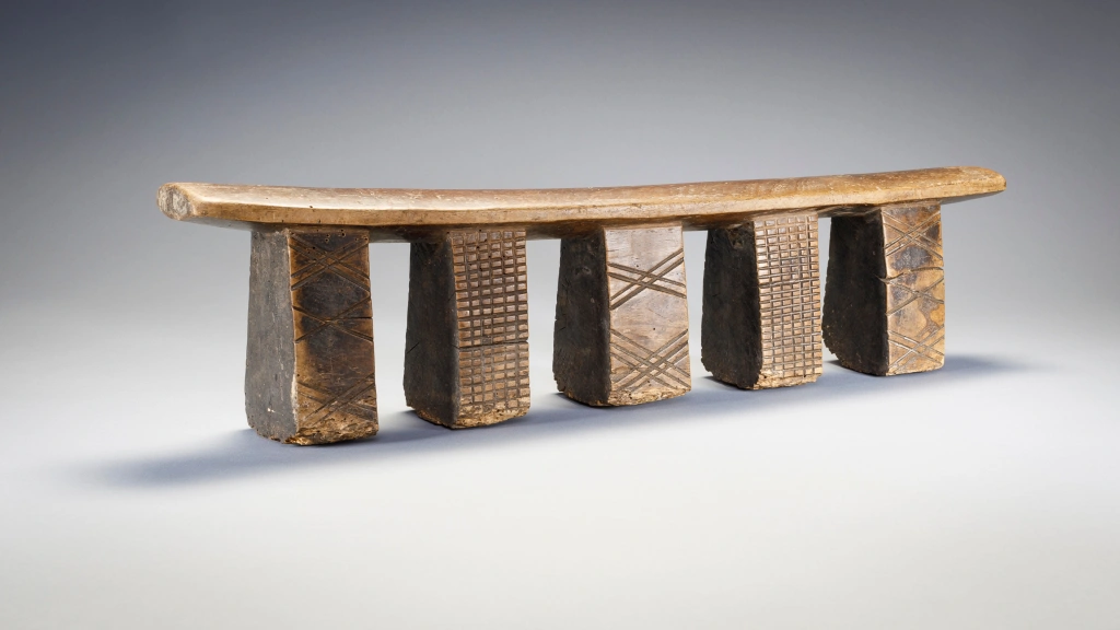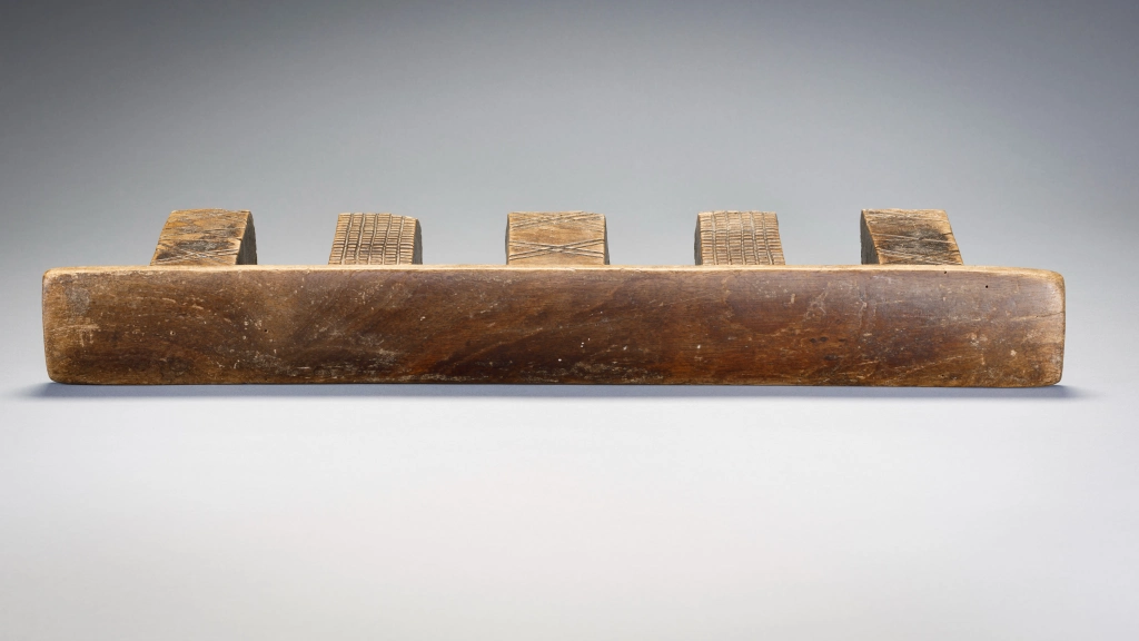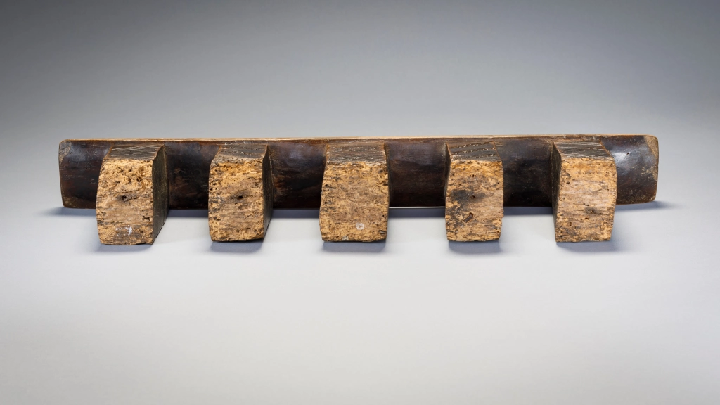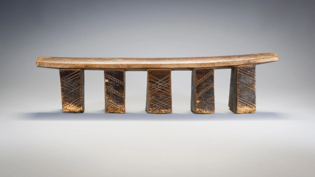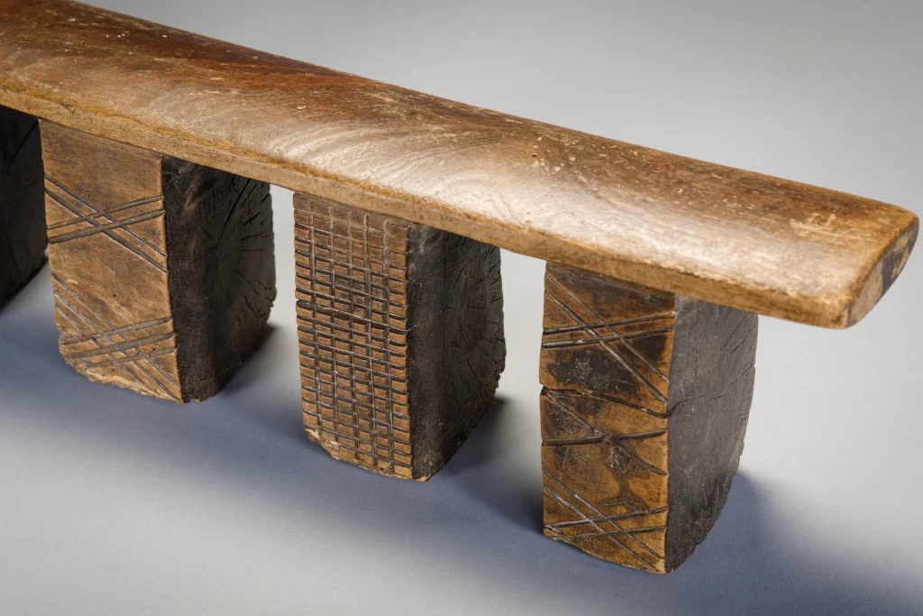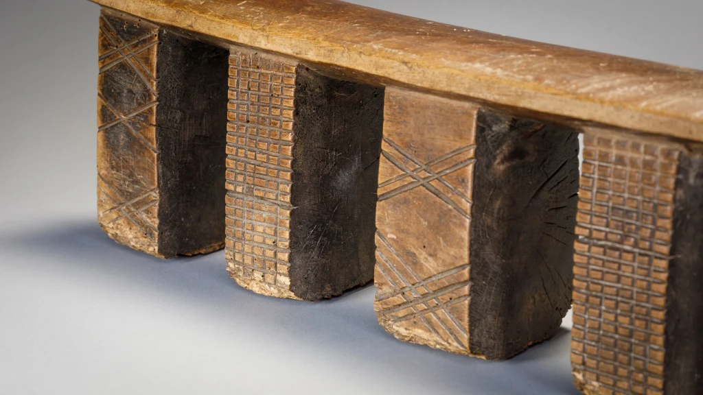 Cet appui-tête a cinq pieds disposés en ligne, ce qui est très rare pour les appuis-tête de la région. Deux des pieds sont recouverts de fines hachures et les trois autres sont ornés de motifs linéaires en forme de X. On peut lire le vécu de cet objet à l’usure visible sur la base des pieds ayant probablement séjourné sur la terre parfois humide en hiver .