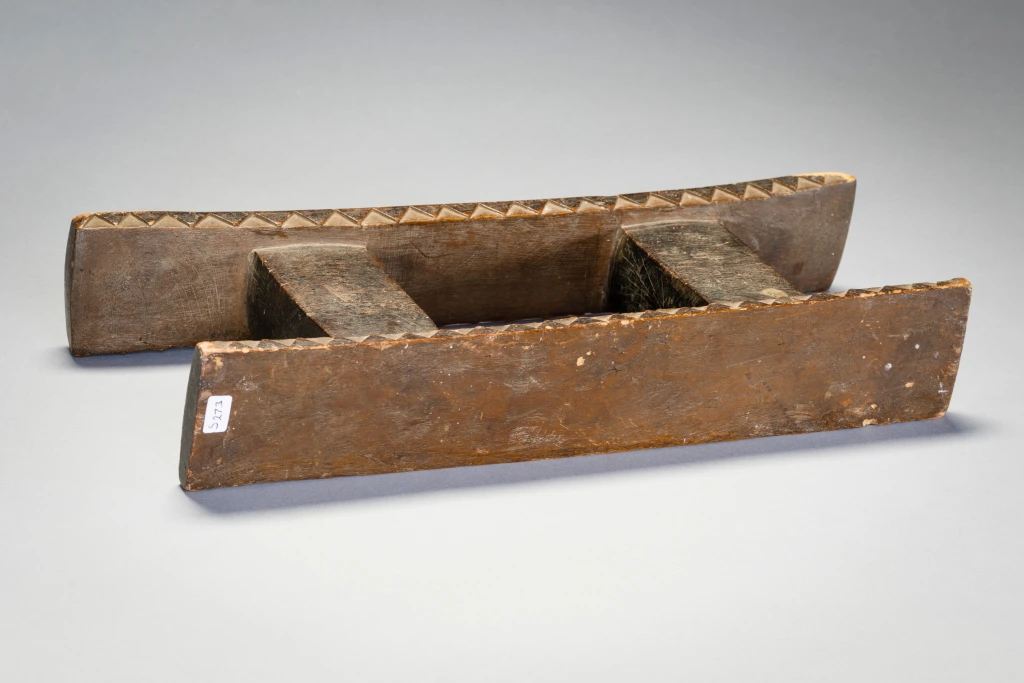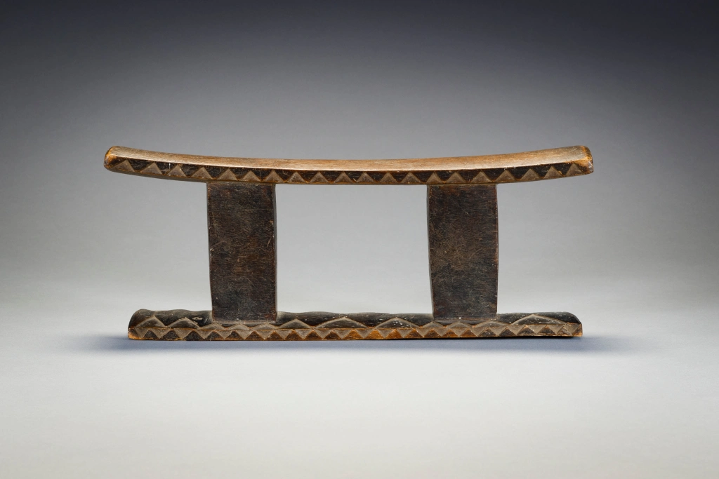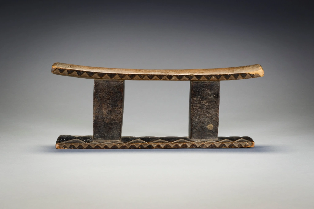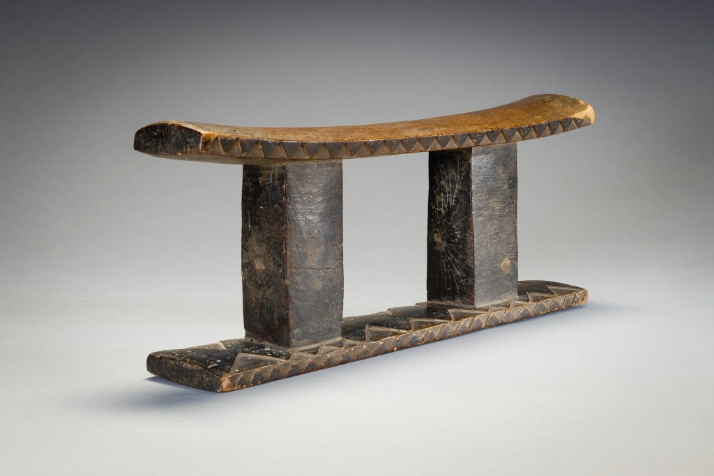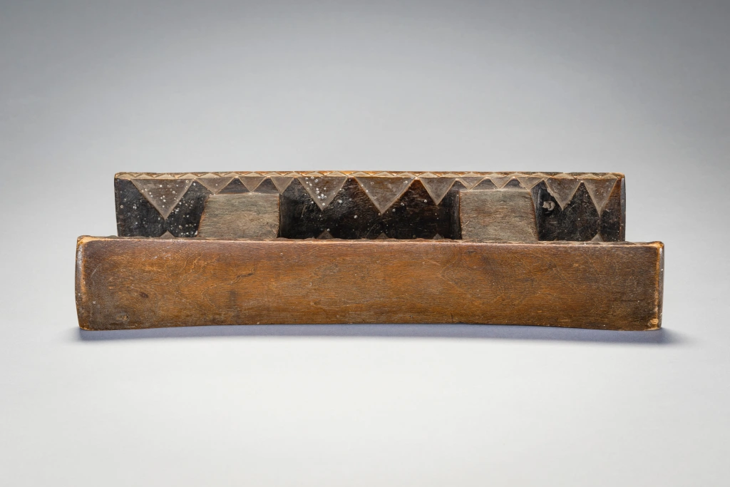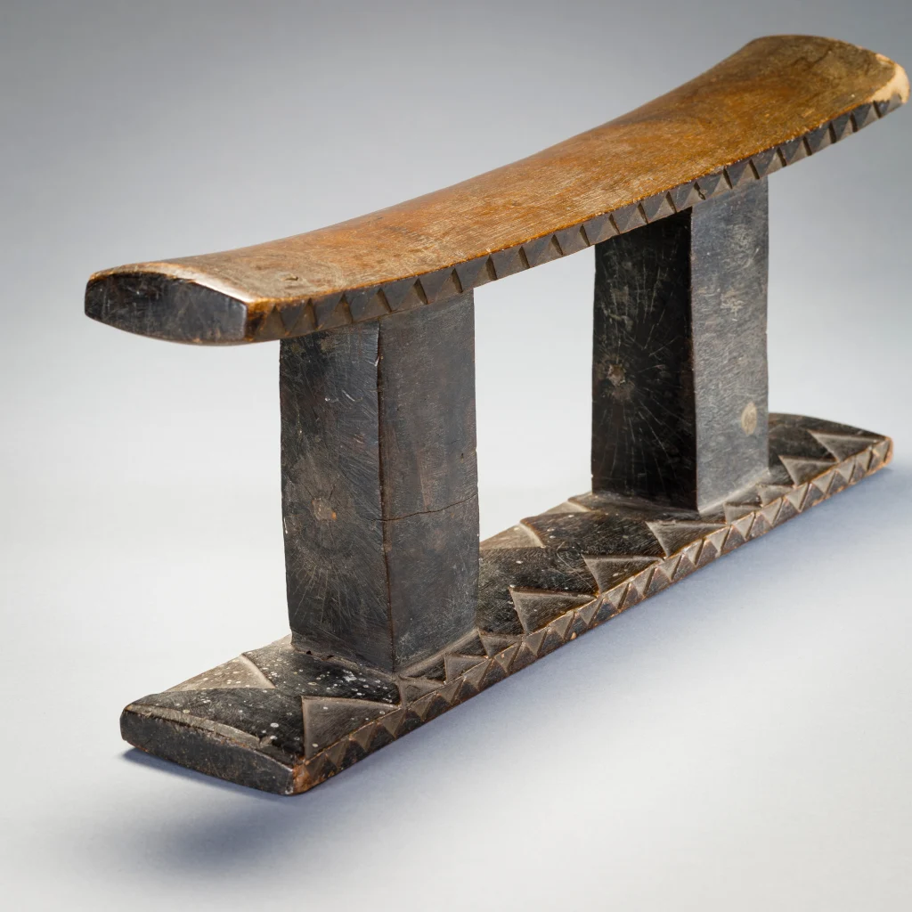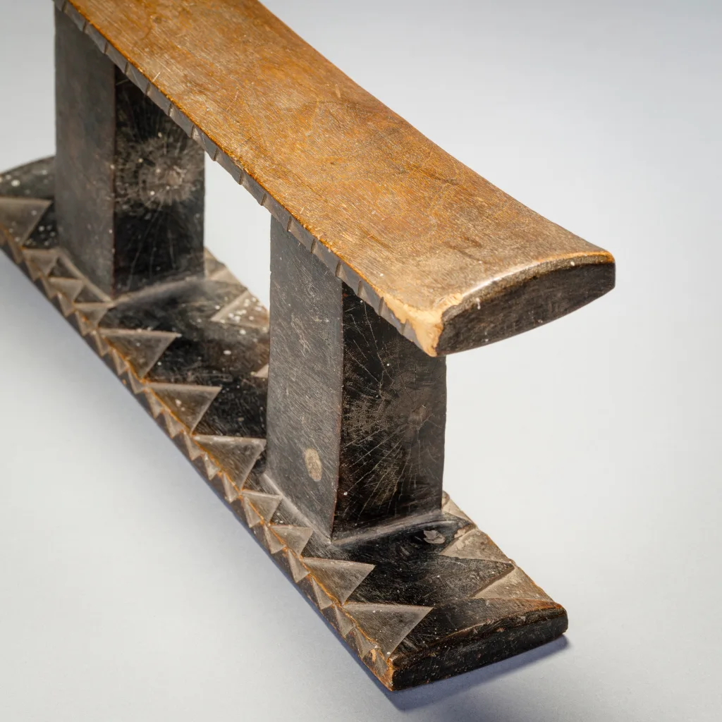 Cet appui-tête ancien à deux colonnes sort de l’ordinaire grâce à la décoration bicolore de sa base et au motif triangulaire le long des bords de sa plate-forme.