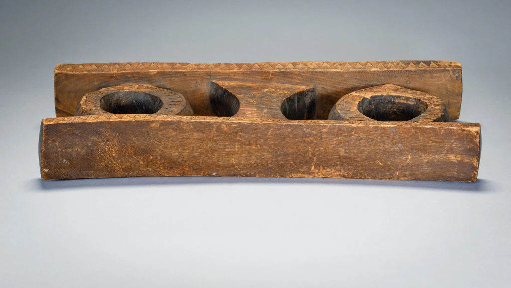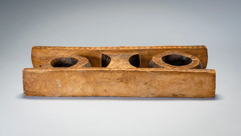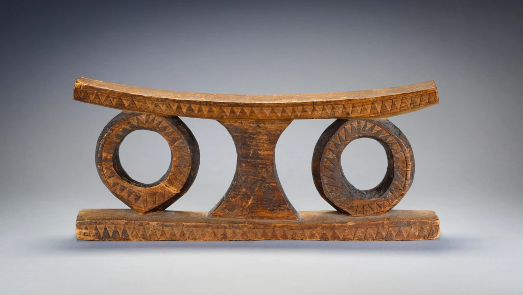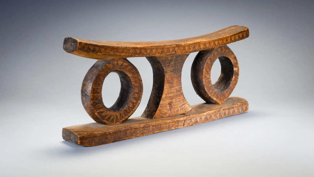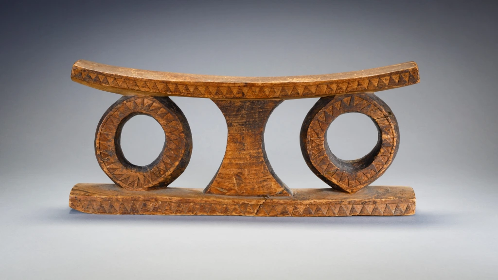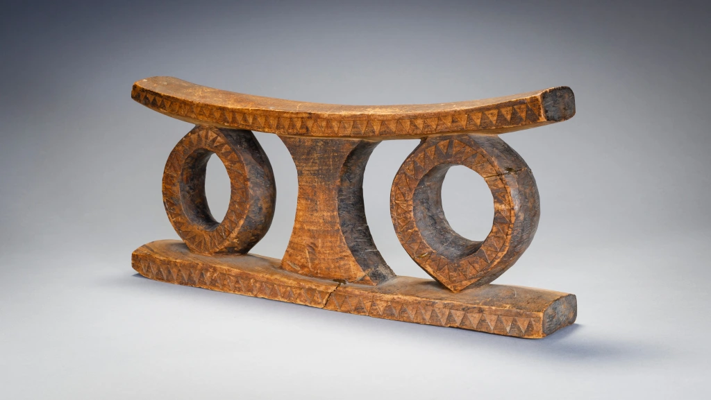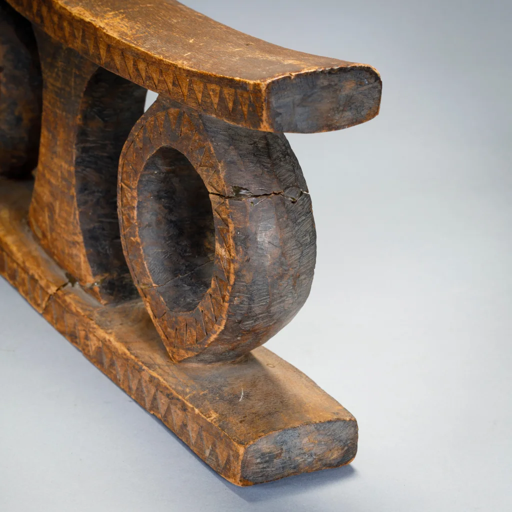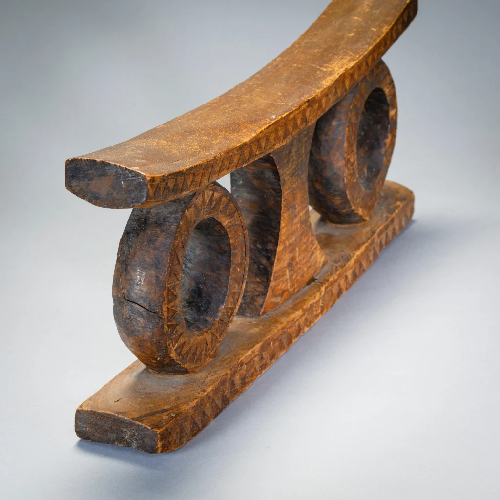 Cet appui-tête ancien présente deux cercles séparés par un pilier central incurvé. La plate-forme, la base et les cercles sont tous décorés par des pyrogravures triangulaires. L’usure , la patine , la texture du bois et le style de cette sculpture sont autant d’éléments permettant de dater l’objet à environ 200 ans il est même possible que ce soit l’un des rares appuis-tête Zoulou du XVIIIème siècle .