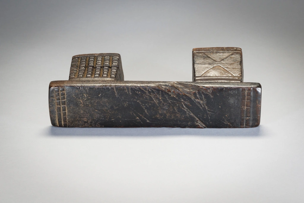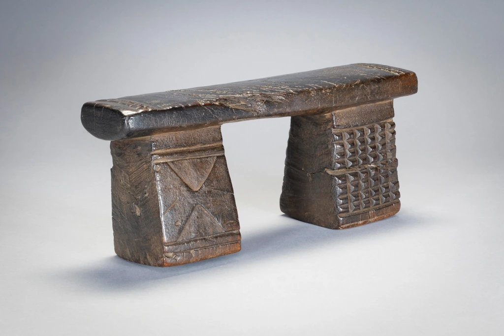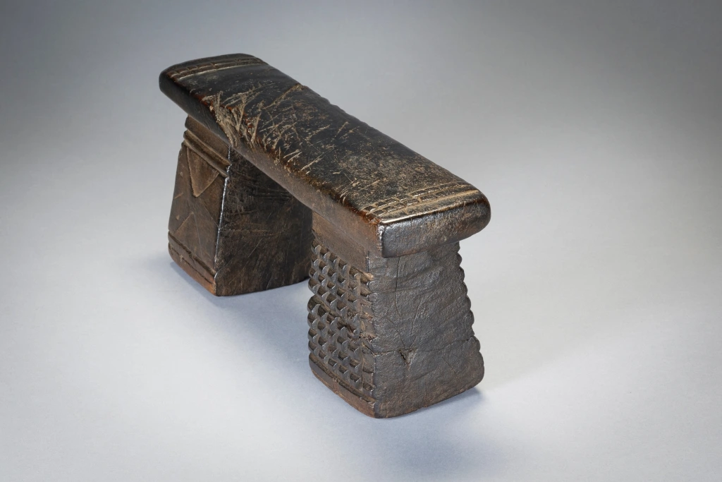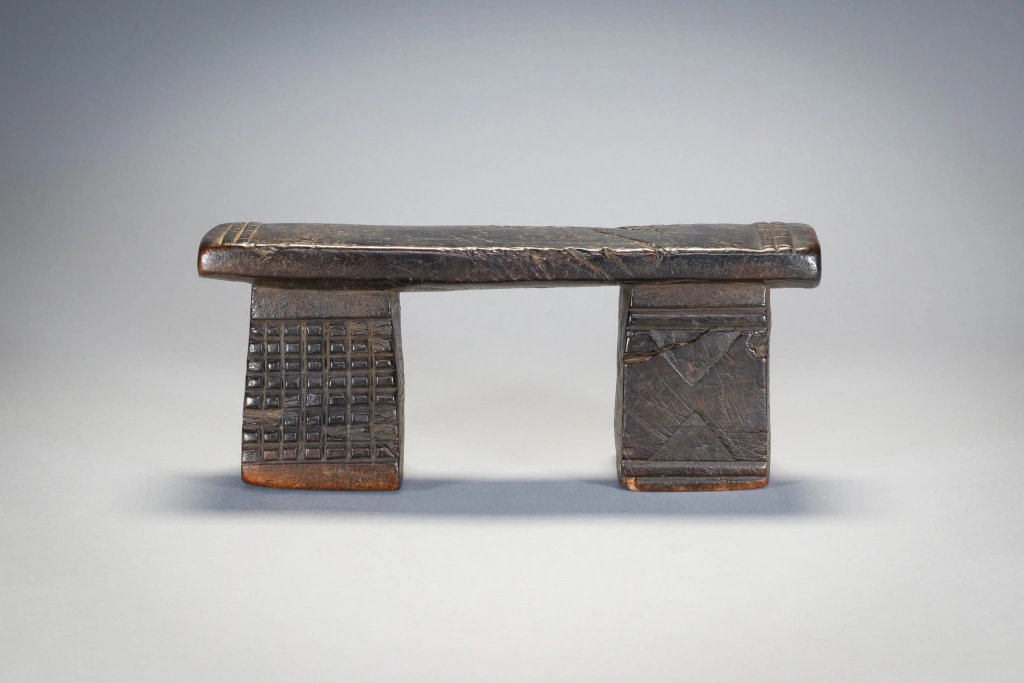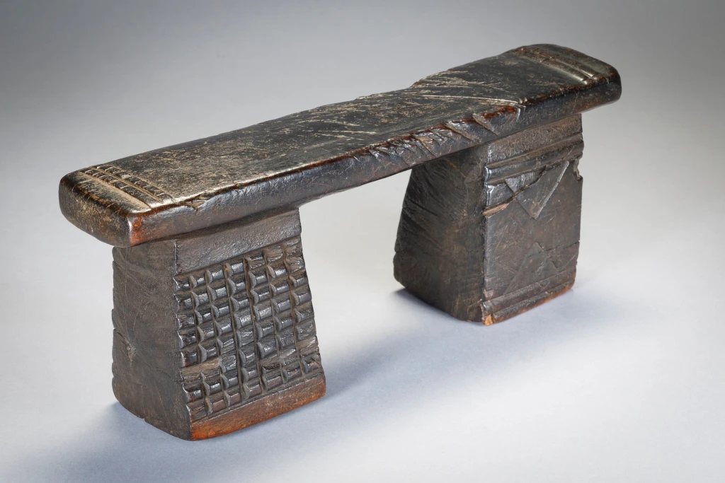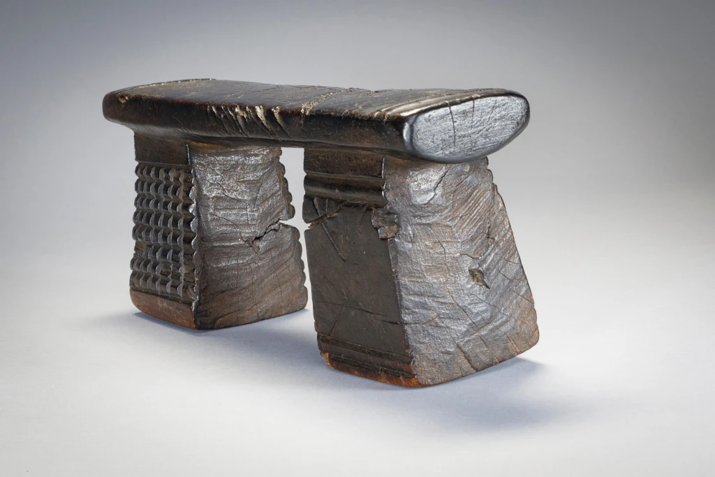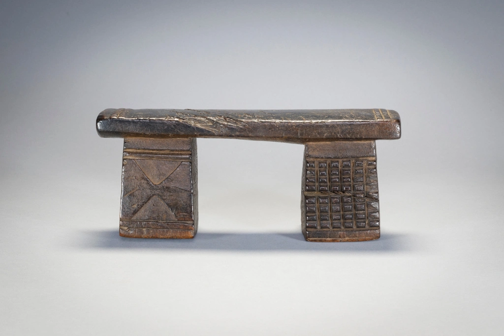 Petit appui-tête trapu aux pieds décorés différemment.Sa plateforme éraflée ses pieds fissurés, les gravures d’amasumpa écornées font ressortir le vécu de l’objet et le rendent attachant au premier coup d’œil et votre regard restera fixé un long moment sur cette sculpture.
