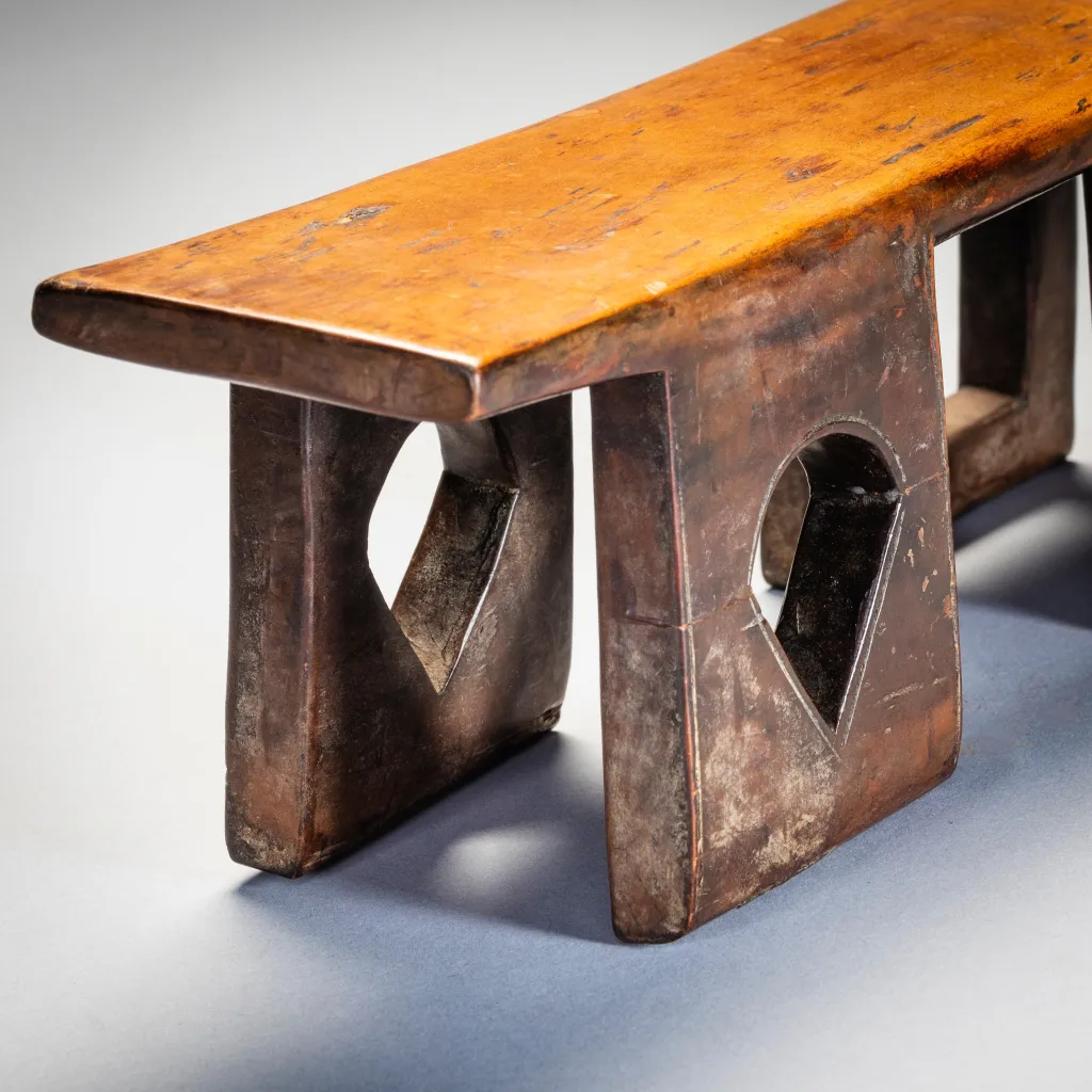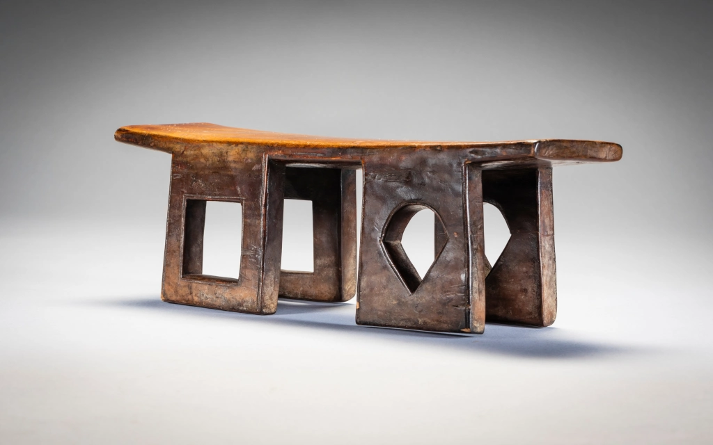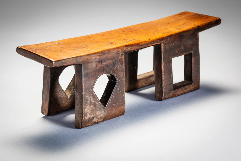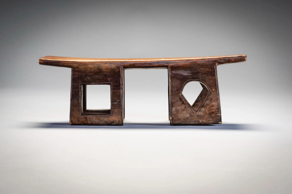 Un appui-tête original aux quatre pieds percés avec des ouvertures de formes différentes. De fabrication récente, il a probablement peu servi dans les villages. Les fenêtres au centre de chaque pied , qui donnent de la transparence à l’objet, en forme de carreaux et de piques font immanquablement penser à un jeu de cartes dont était peut-être friand le commanditaire de cet appui tête.