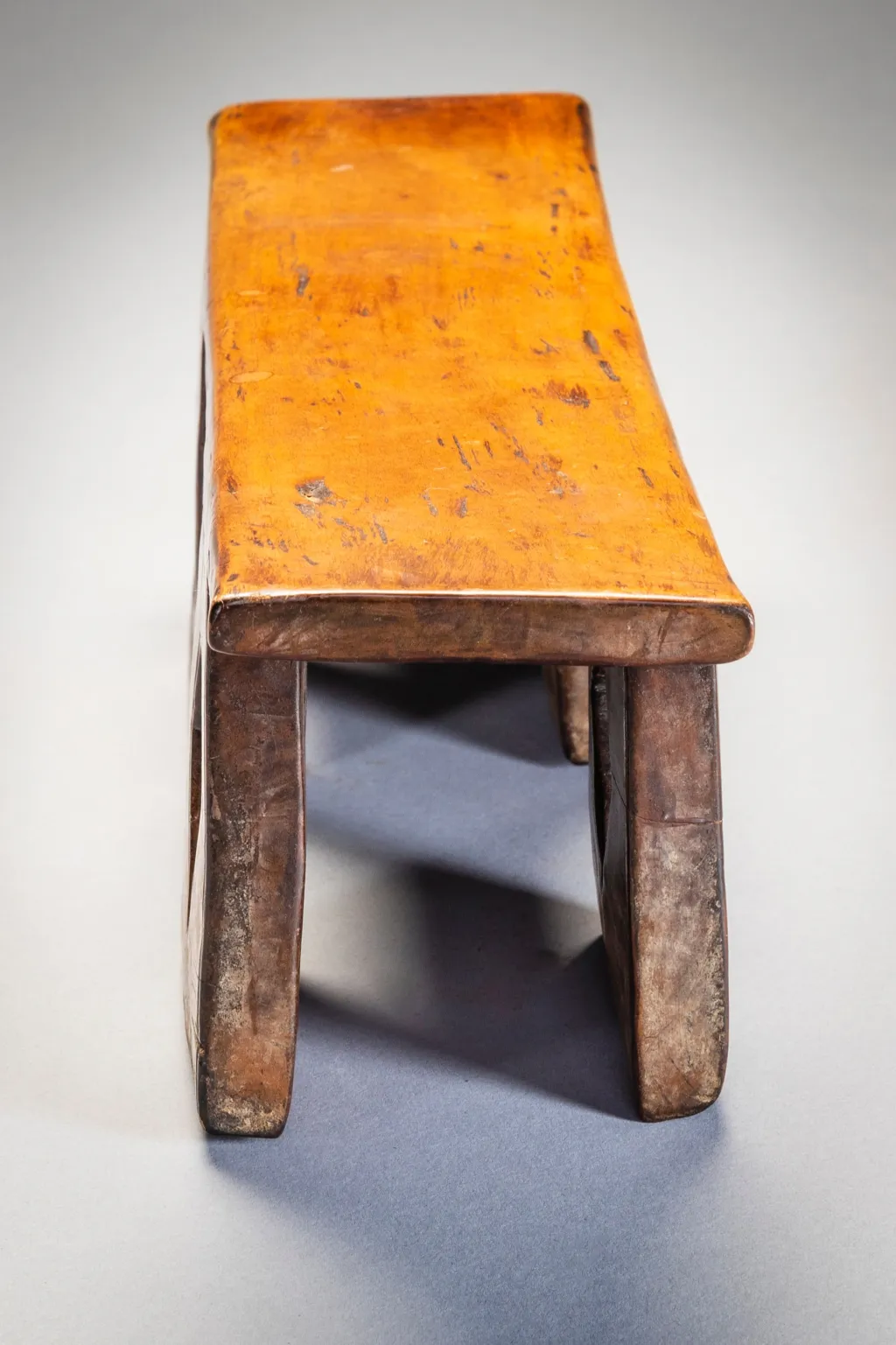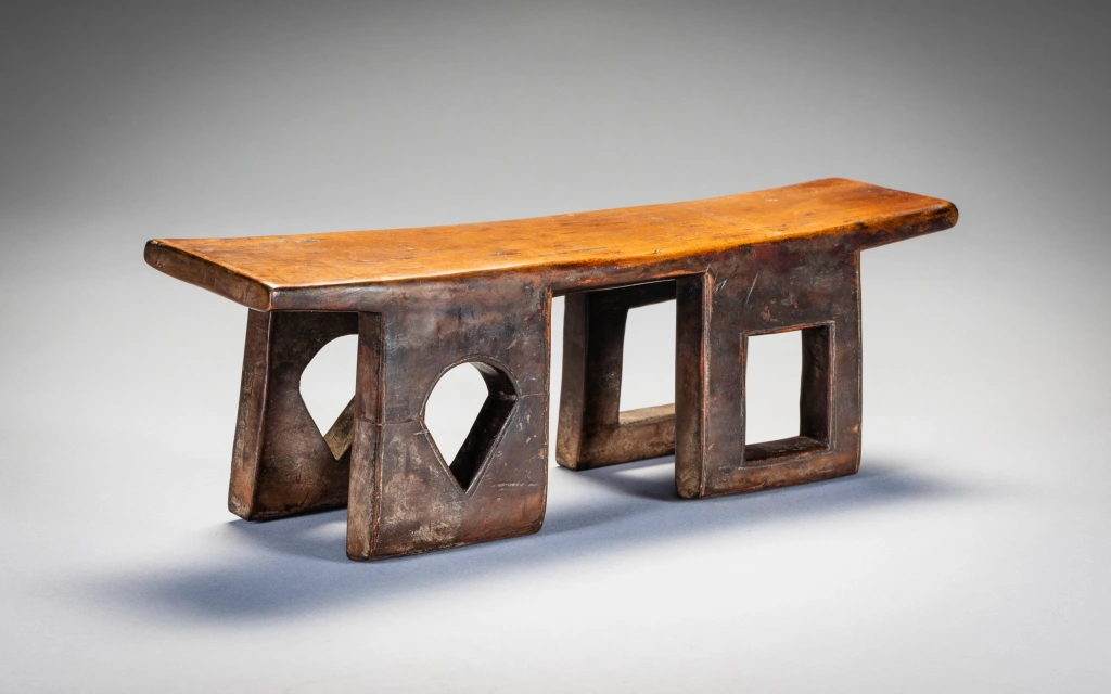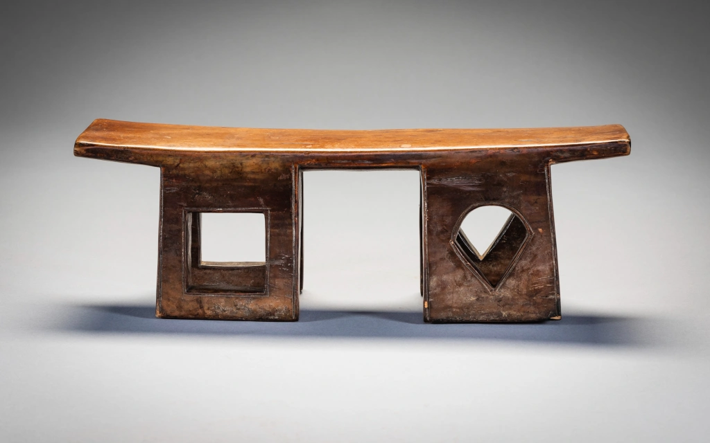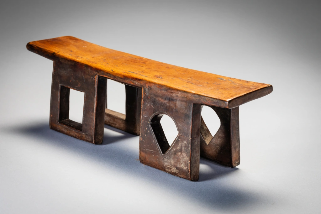 Un appui-tête original aux quatre pieds percés avec des ouvertures de formes différentes. De fabrication récente, il a probablement peu servi dans les villages. Les fenêtres au centre de chaque pied , qui donnent de la transparence à l’objet, en forme de carreaux et de piques font immanquablement penser à un jeu de cartes dont était peut-être friand le commanditaire de cet appui tête.