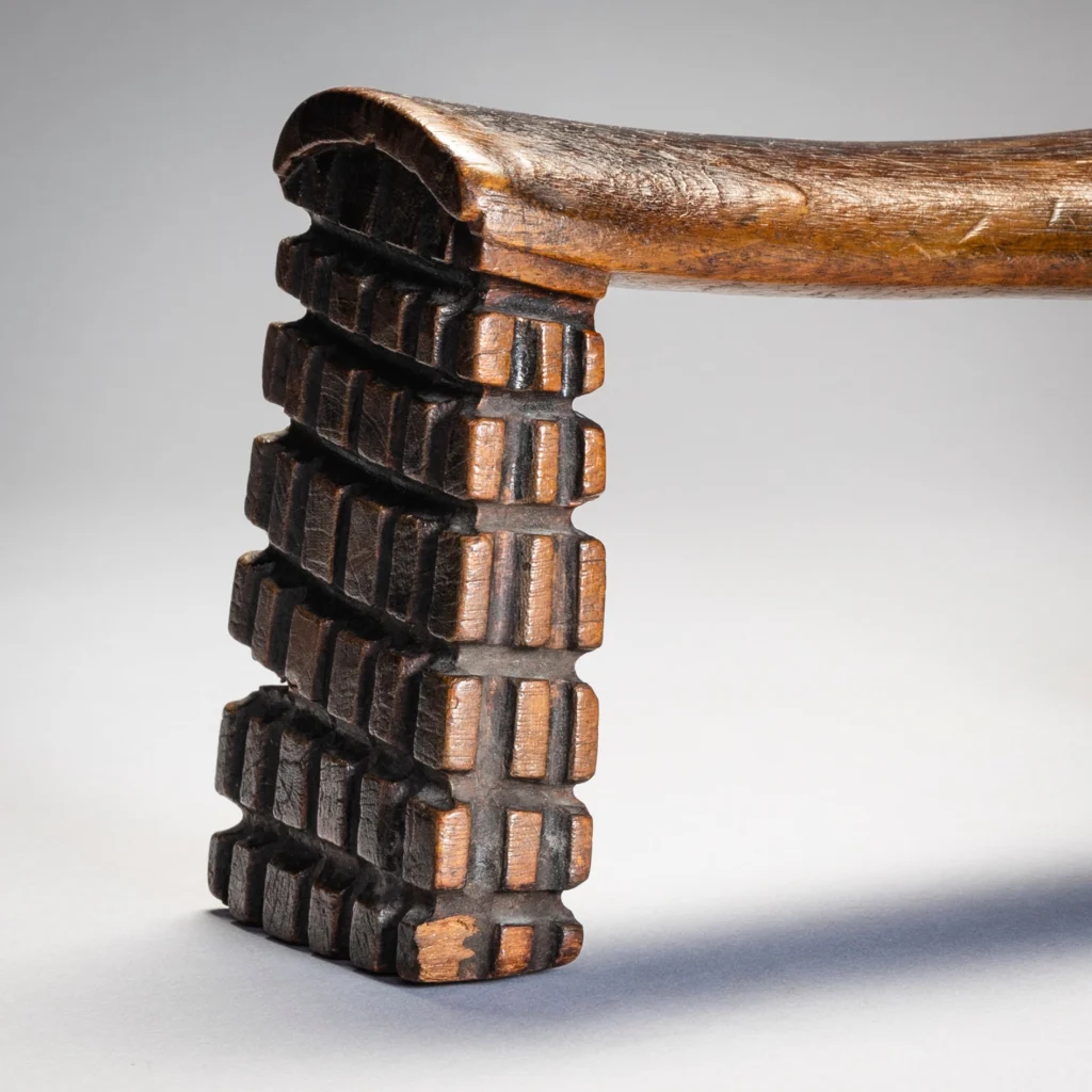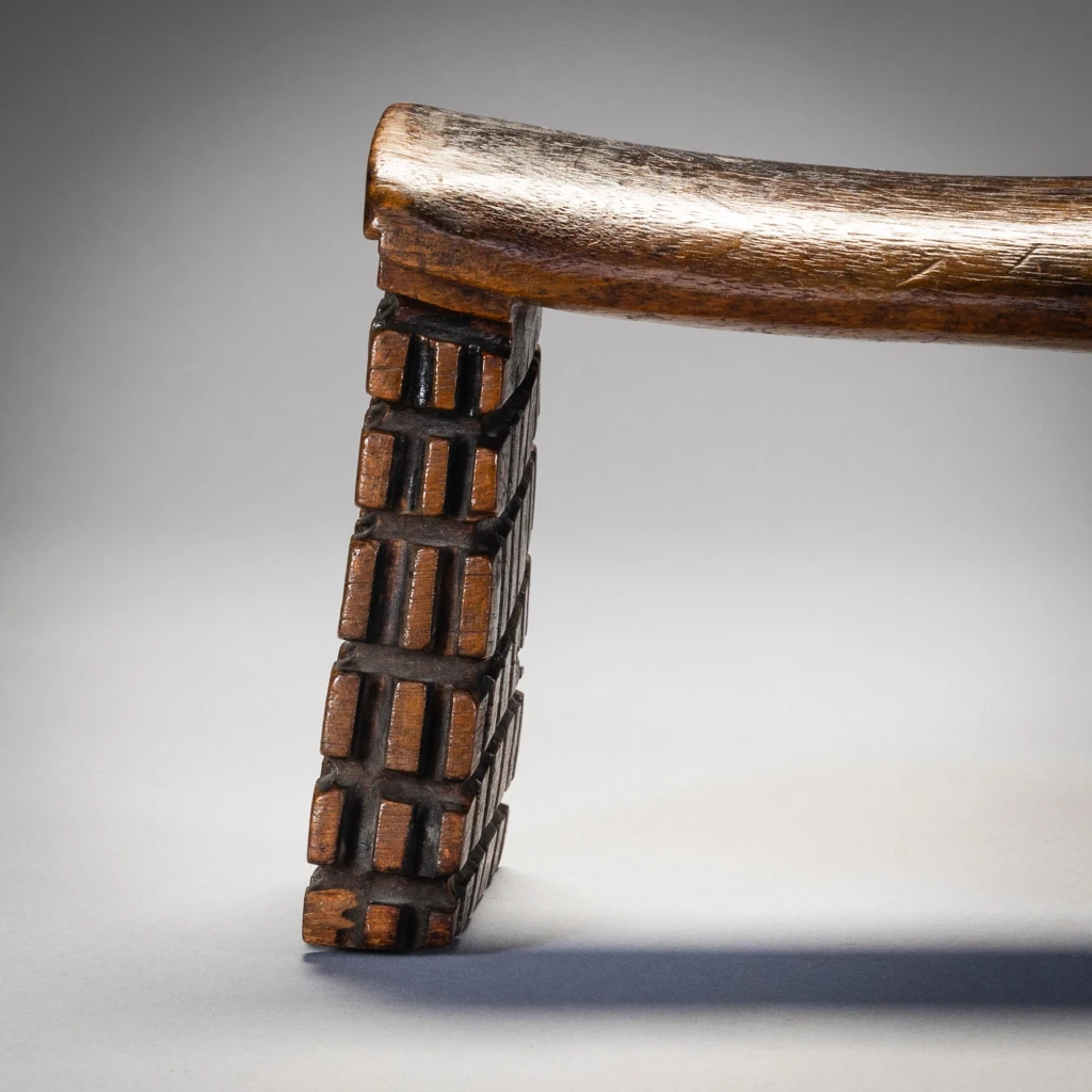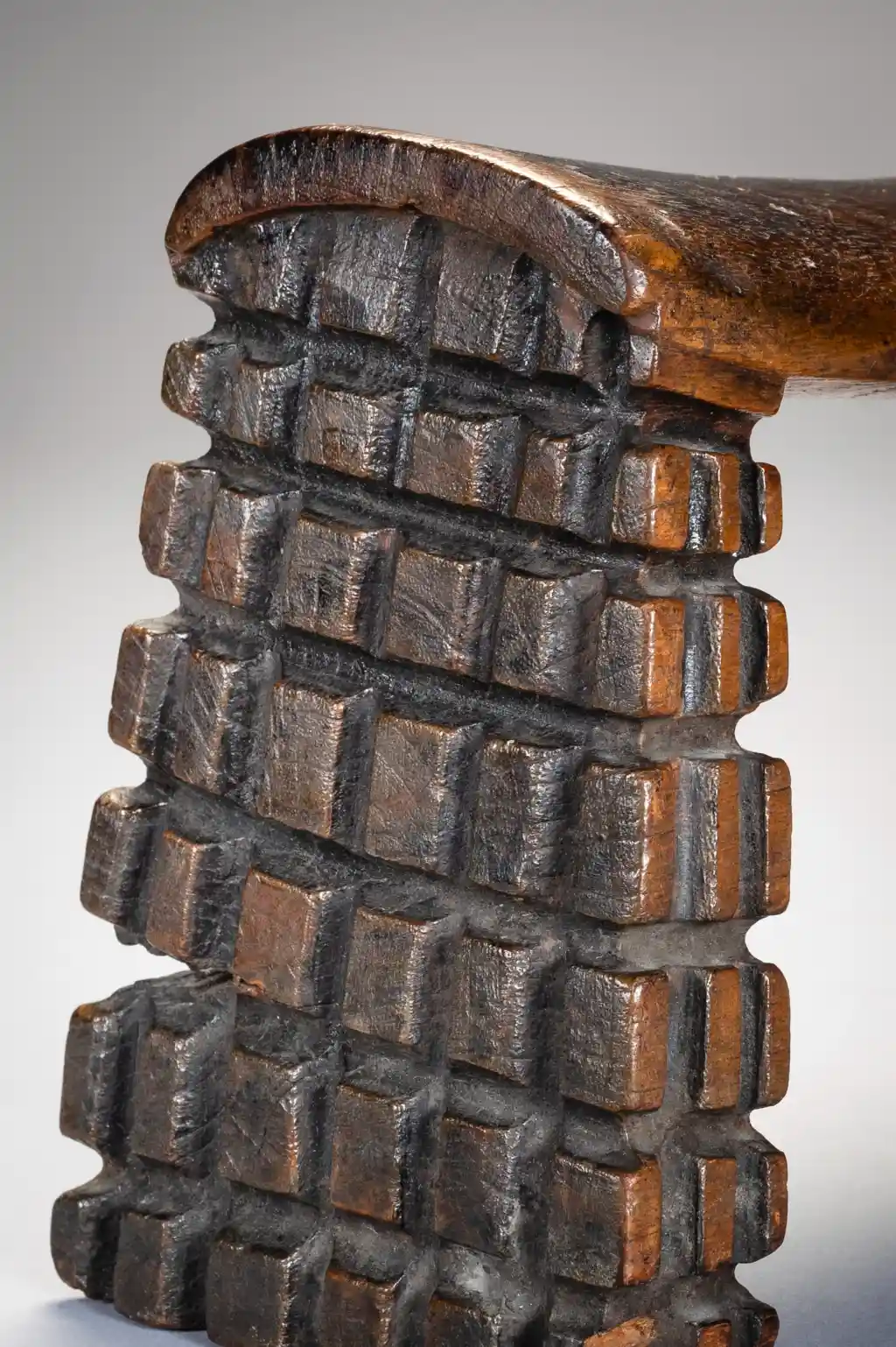 Un superbe appui-tête avec deux pieds extrêmement fins décorés d’amasumpa particulièrement profonds sur les 4 faces donnant un profil très dentelé à cette sculpture L’usure et la patine montrent de nombreuses décennies d’utilisation , la craquelure sur l’un des pieds du fait du travail du bois par les changements de température des saisons  laisse à imaginer le vécu de plus d’une centaine d’années de l’objet. Sa légèreté et sa finesse permettent incontestablement de le classer dans les appuis-tête « de voyage » ou propriété de quelques bergers qui accompagnent la transhumance des troupeaux dans les régions montagneuses du KwazuluNatal.