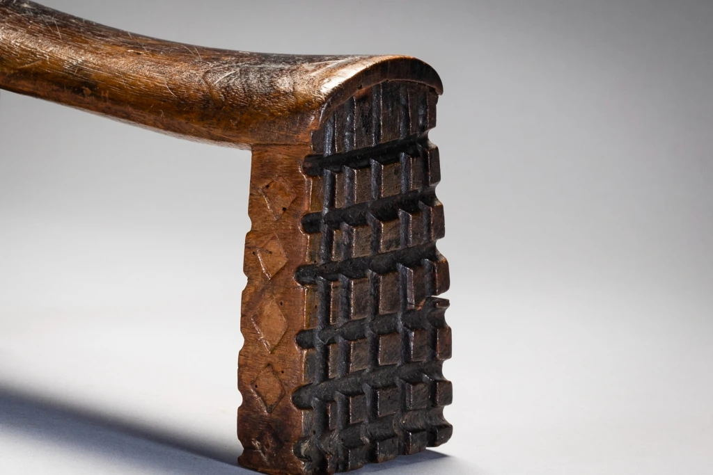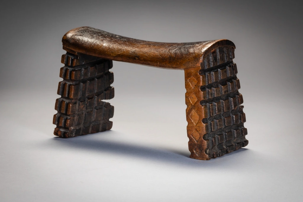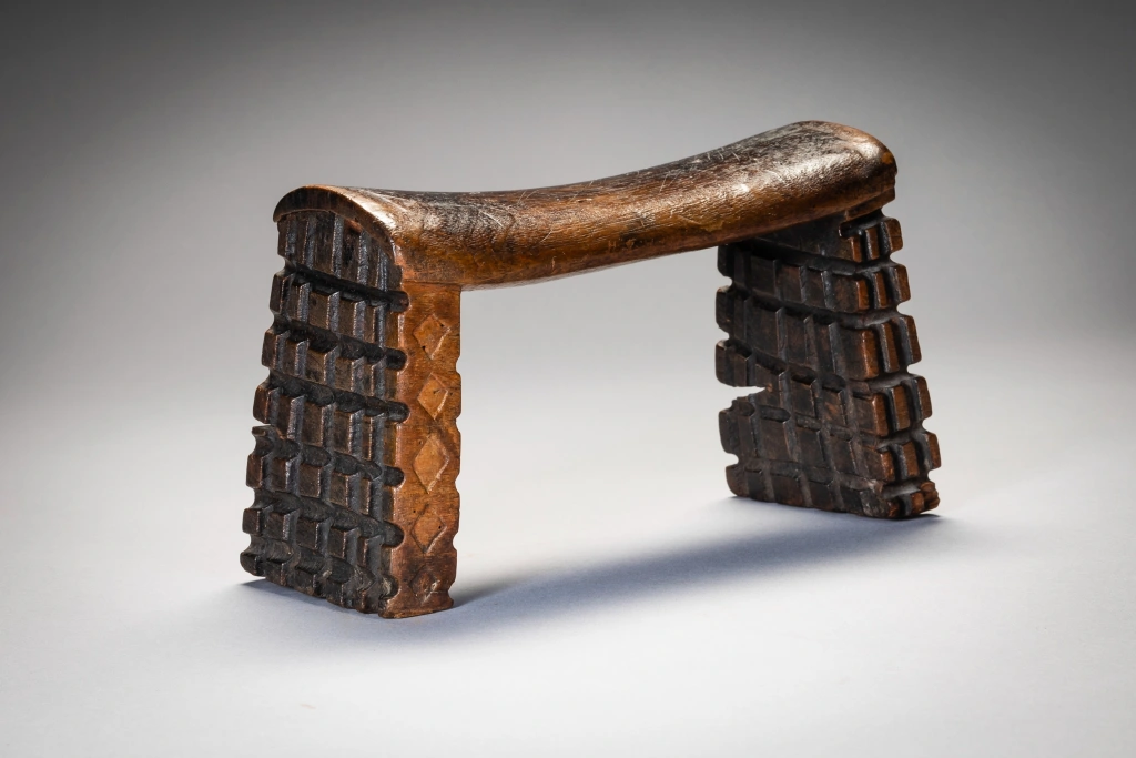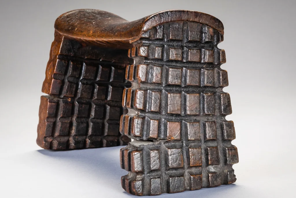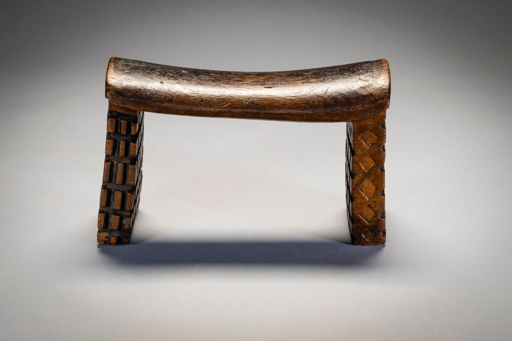 Un superbe appui-tête avec deux pieds extrêmement fins décorés d’amasumpa particulièrement profonds sur les 4 faces donnant un profil très dentelé à cette sculpture L’usure et la patine montrent de nombreuses décennies d’utilisation , la craquelure sur l’un des pieds du fait du travail du bois par les changements de température des saisons  laisse à imaginer le vécu de plus d’une centaine d’années de l’objet. Sa légèreté et sa finesse permettent incontestablement de le classer dans les appuis-tête « de voyage » ou propriété de quelques bergers qui accompagnent la transhumance des troupeaux dans les régions montagneuses du KwazuluNatal.