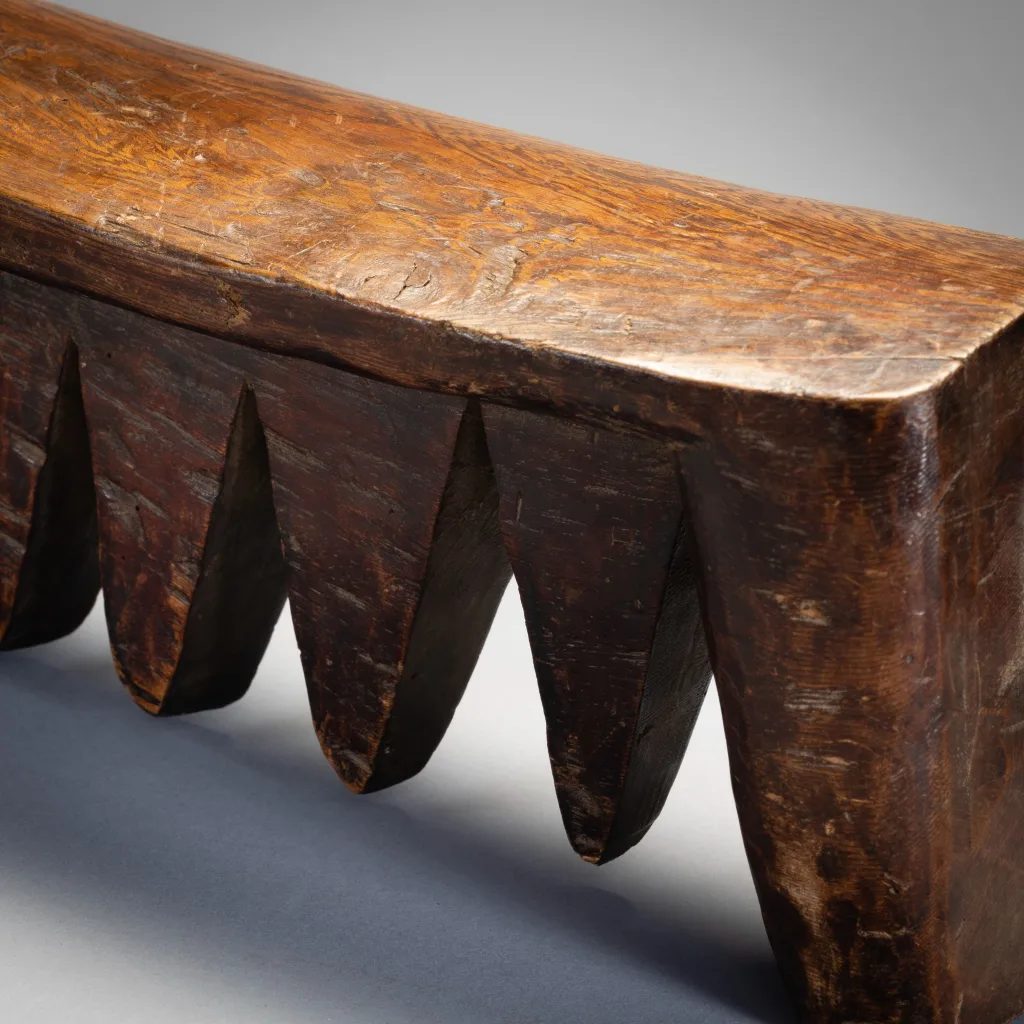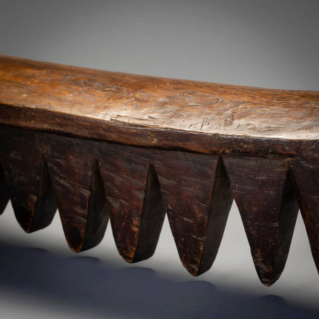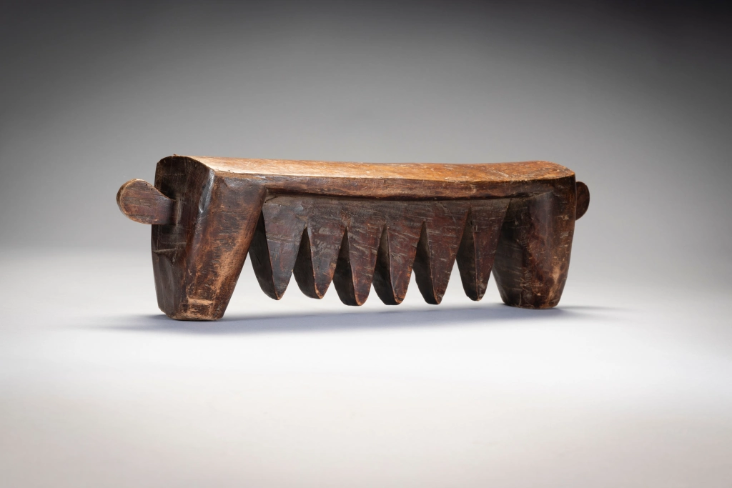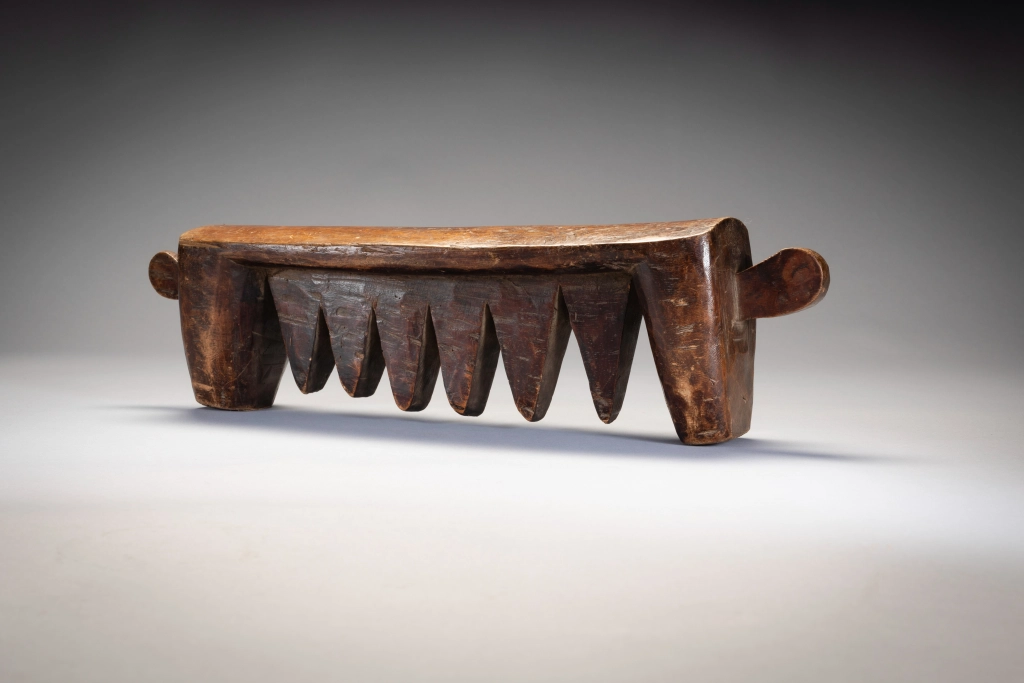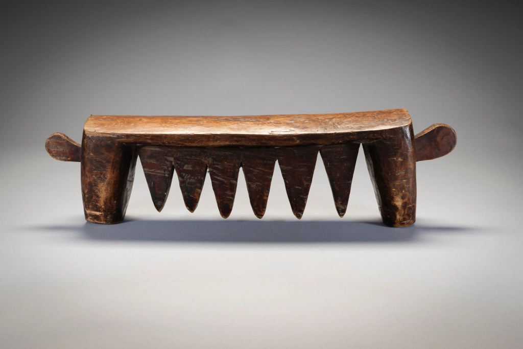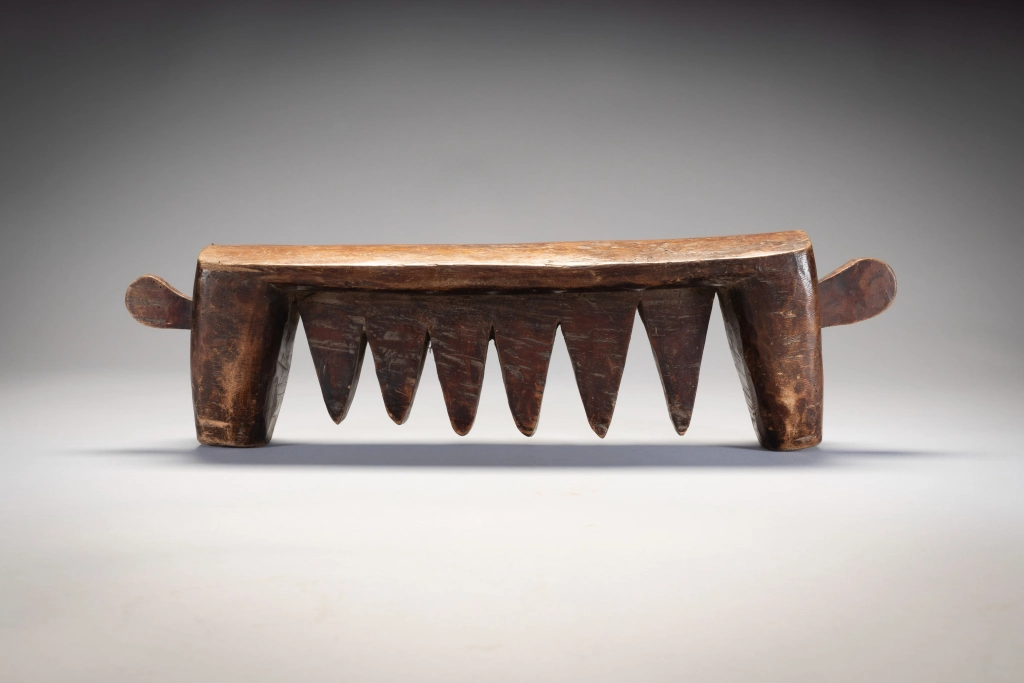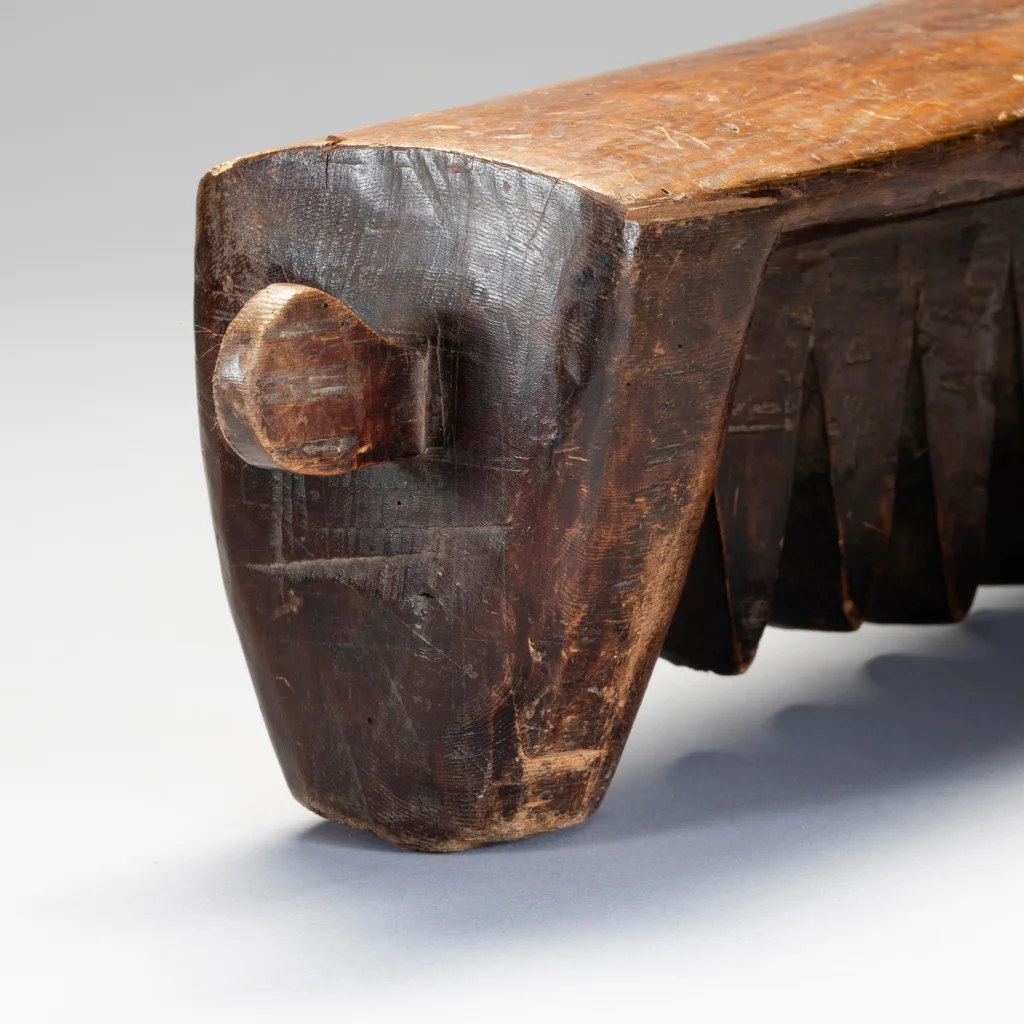 Un appui-tête très original d’une part à cause des pointes qui retombent du linteau en forme de mâchoire et d’autre part à cause des deux oreillettes aux extrémités pour le saisir. C’est une pièce très atypique qui bien que située géographiquement de façon précise n’a pas encore rencontré dans cette région ou plus loin d’autres sculptures de la même veine .