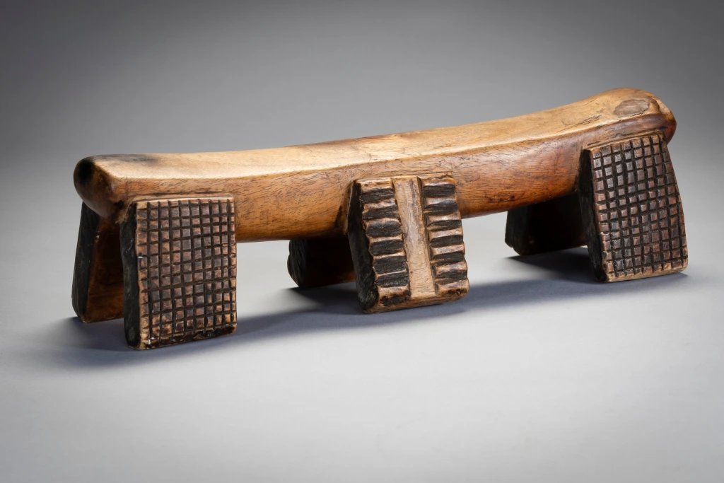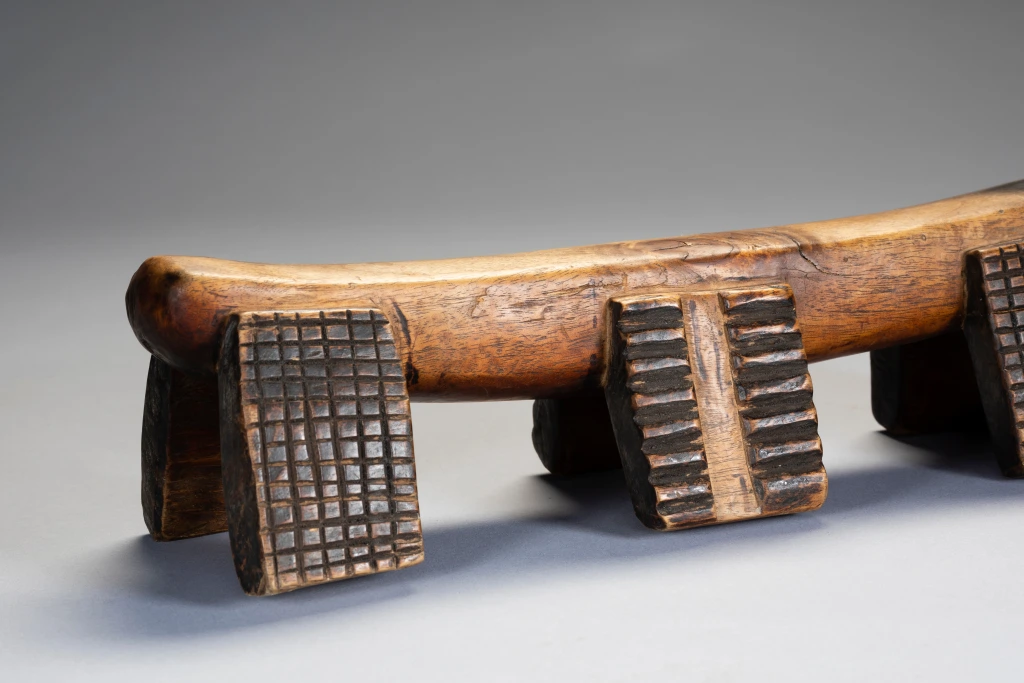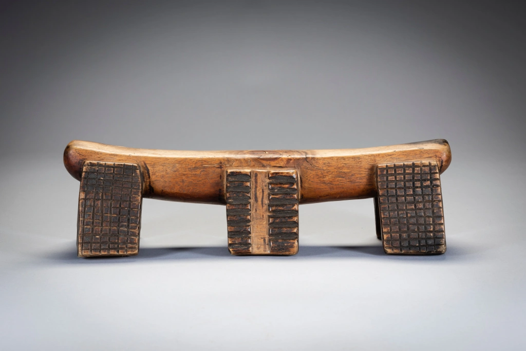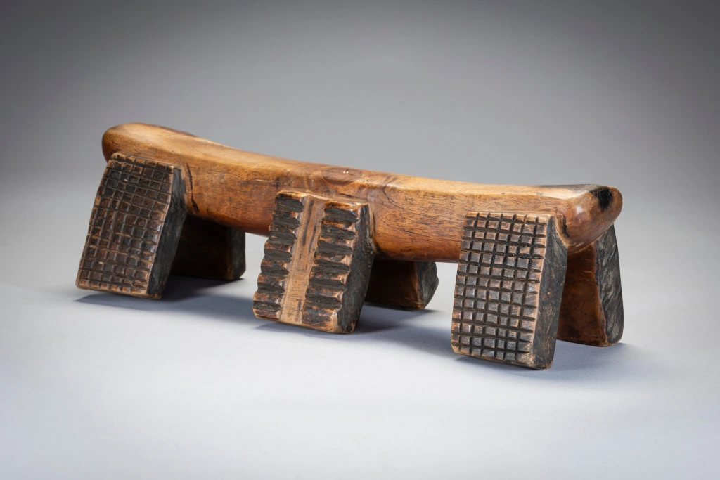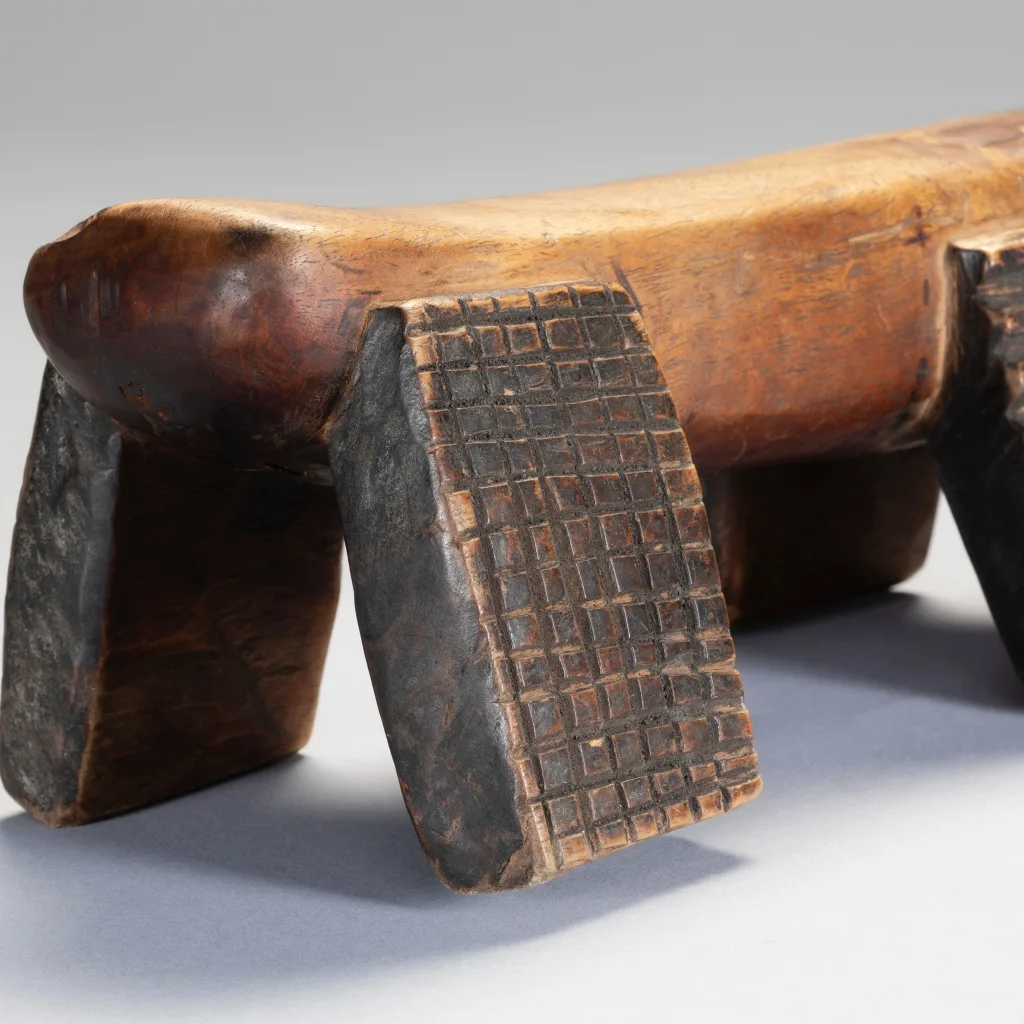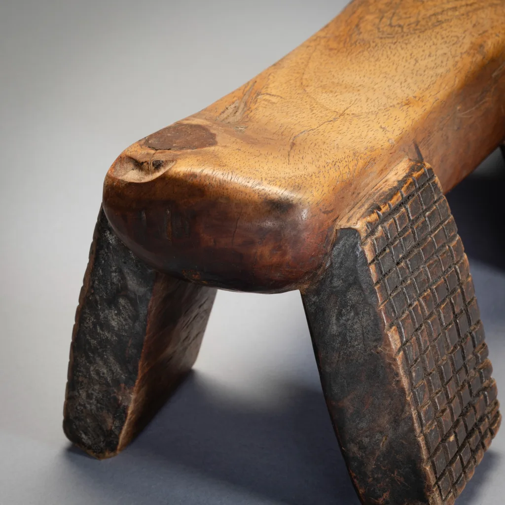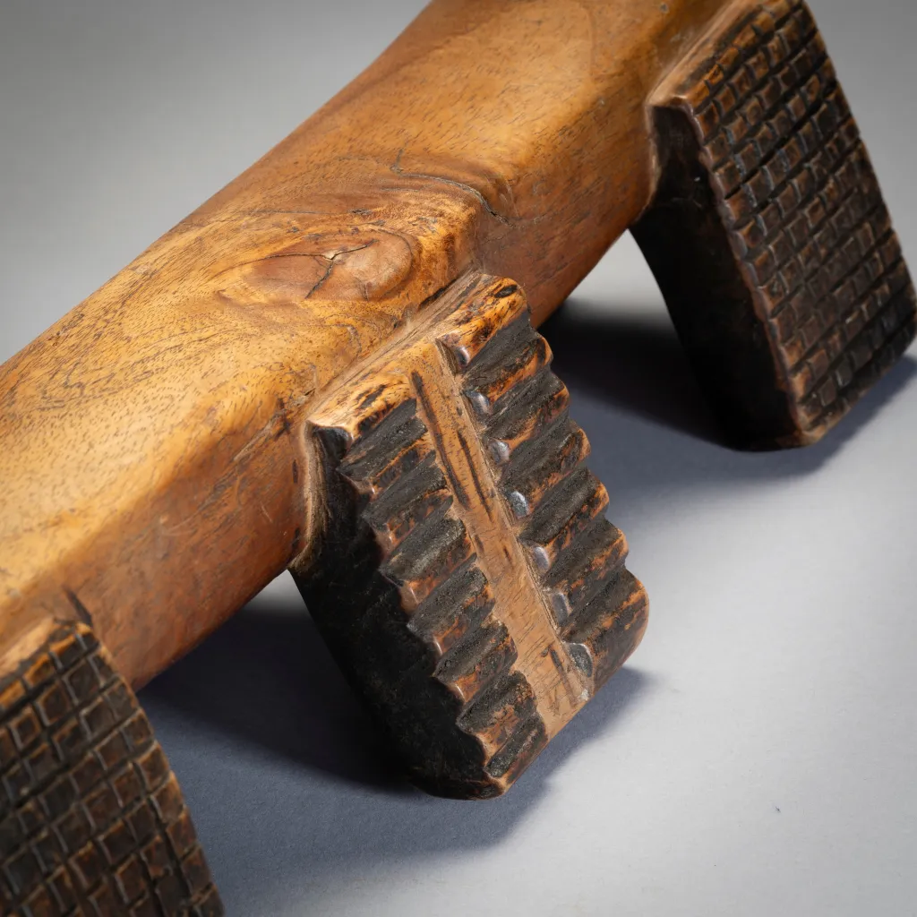 Une belle pièce qui dégage puissance et robustesse. Les 3 pieds doubles sont accrochés aux cotés de l’appui-tête. Le pied central est décoré différemment et apporte de l’originalité cet à appui-tête.  La plateforme d’une superbe couleur miel laisse transparaître les noeuds du bois dans lequel il a été sculpté, bois inconnu mais qui n’est pas sans rappeler l’olivine européen.
