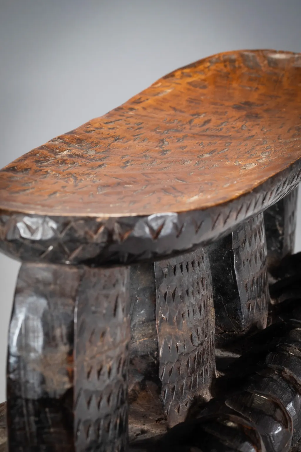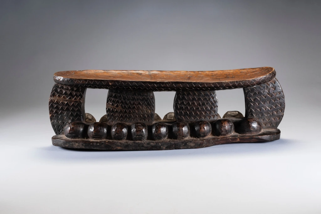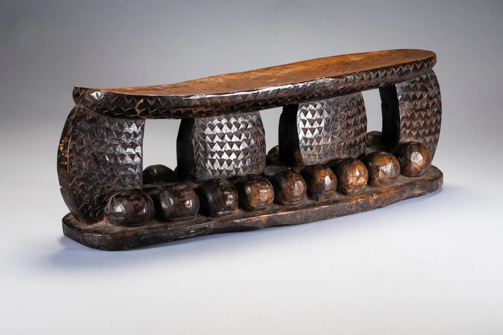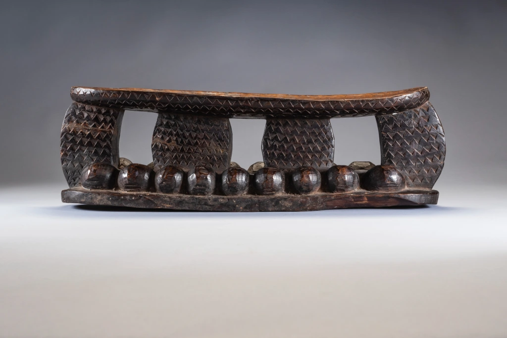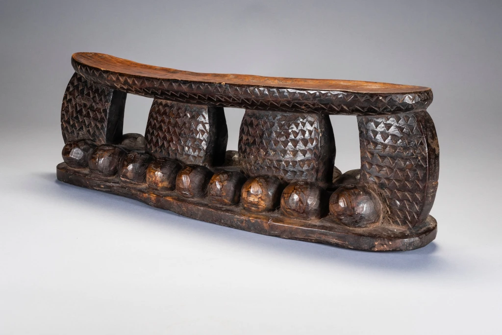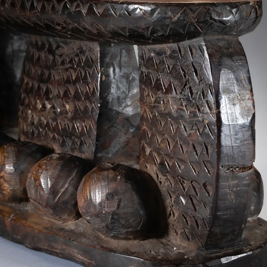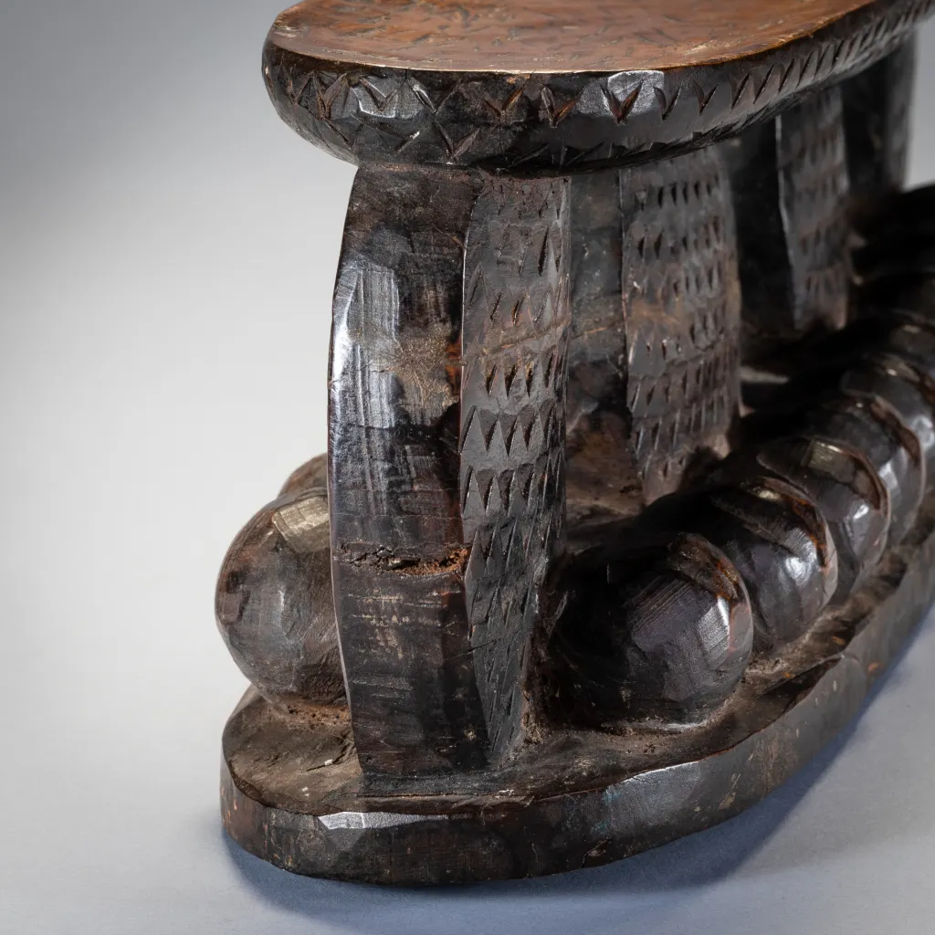 Une pièce imposante totalement recouverte de gravures en petits triangles avec sur le support une suite de boules en bois en forme de vagues créant une forte originalité à cette pièce. Fabriqué dans un bois particulièrement lourd cette forme d’appui tete est extrêmement rare et bien qu’elle soit située géographiquement il n’a pas été retrouvé d’autres pièces de la même veine dans les diverses collections. Bien que différent il pourrait être de la même influence que Z124 de la présente collection.