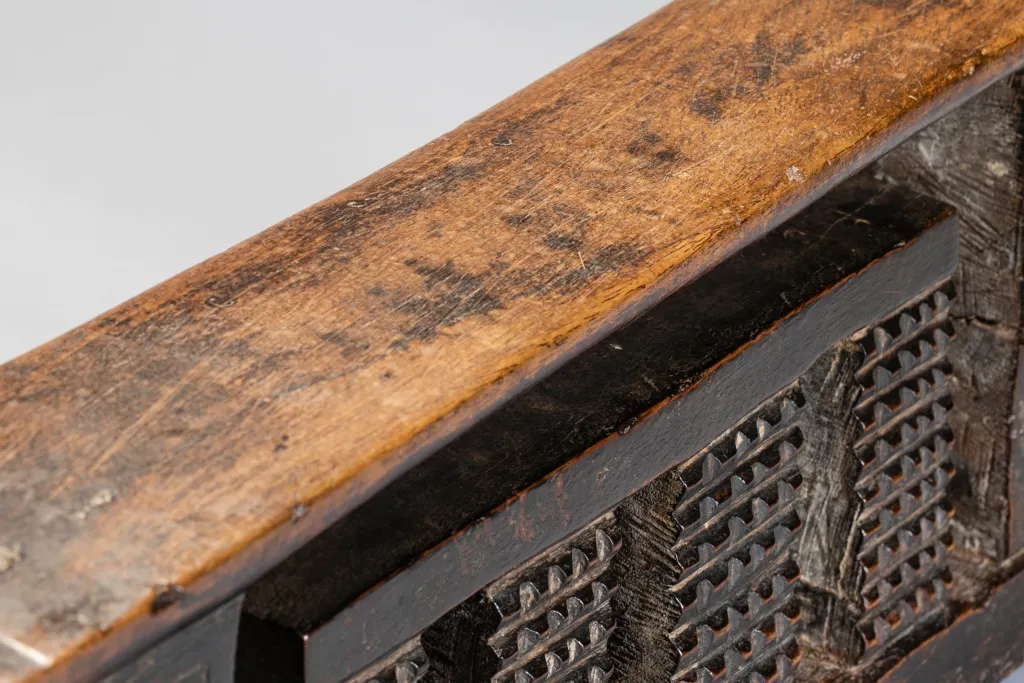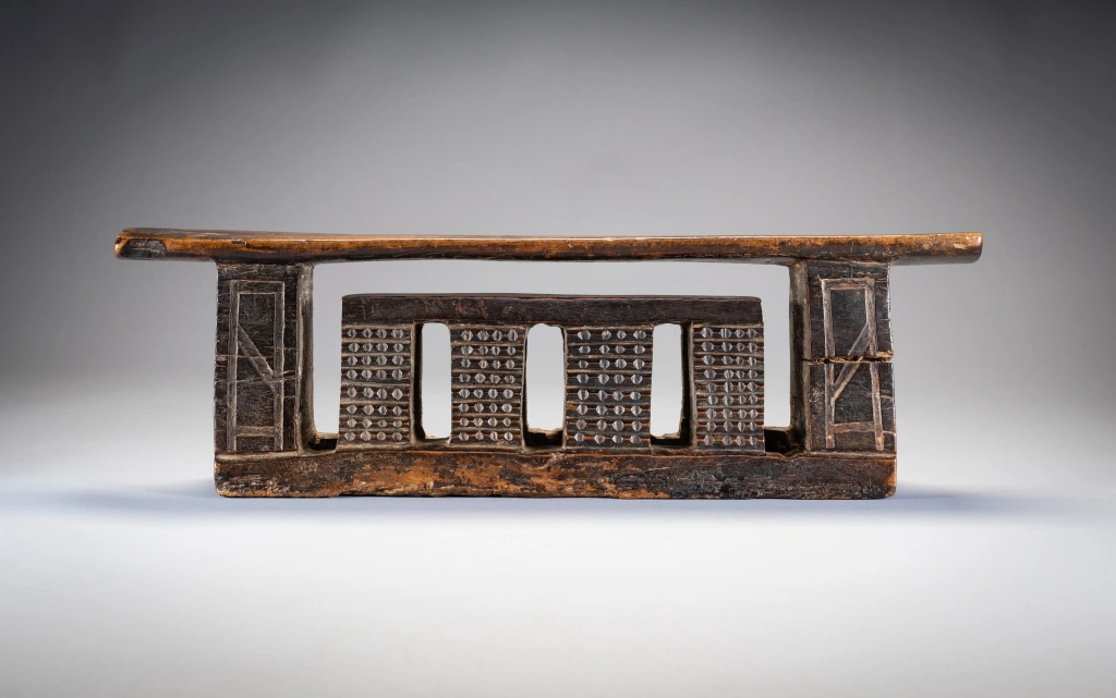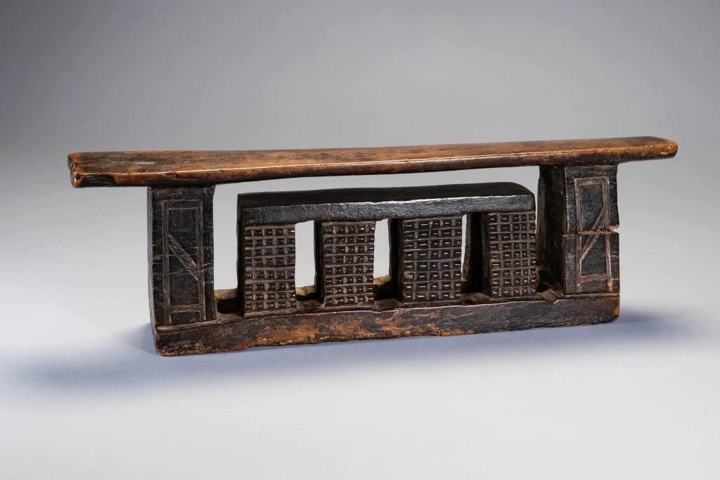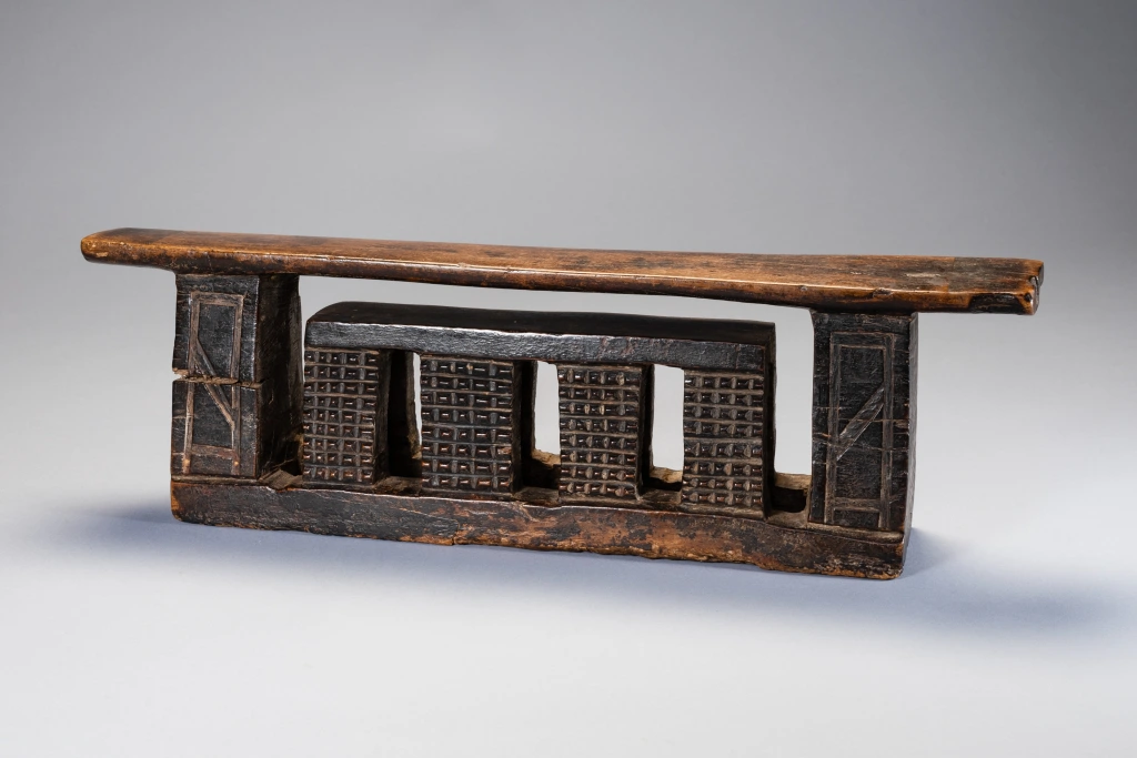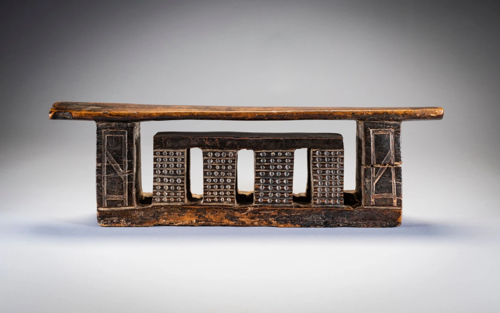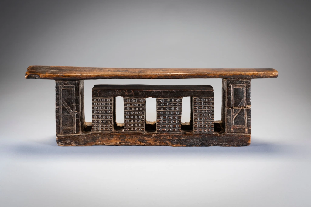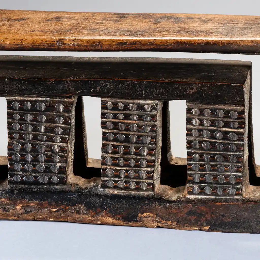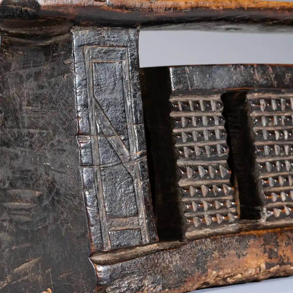 Un appui-tête zoulou de forme complexe et inhabituelle. Il est décoré d’amasumpa sur les huit pieds de sa plus petite section et de pyrogravures géométriques sur ses pieds extérieurs. Il est ancien et un peu usé par endroits, mais il n’y a pas de dommages majeurs qui pourraient nuire à sa splendeur.