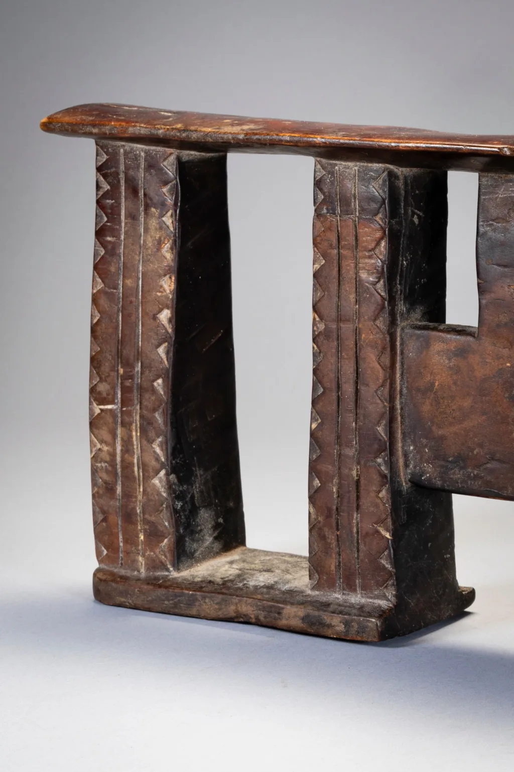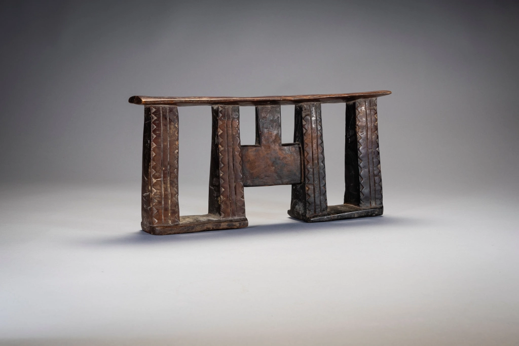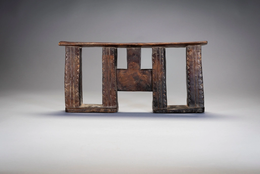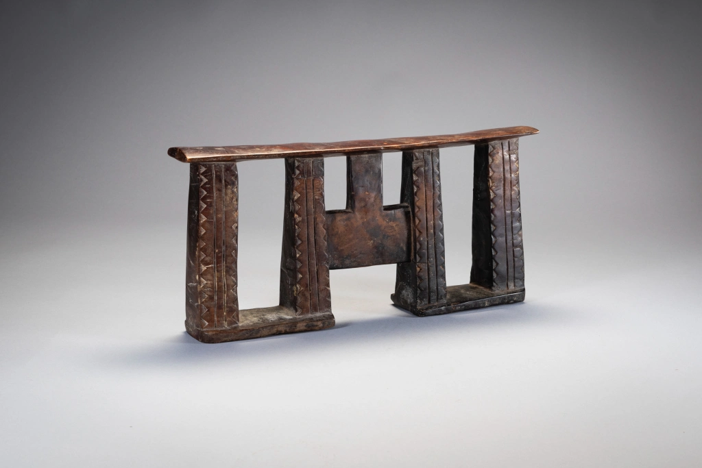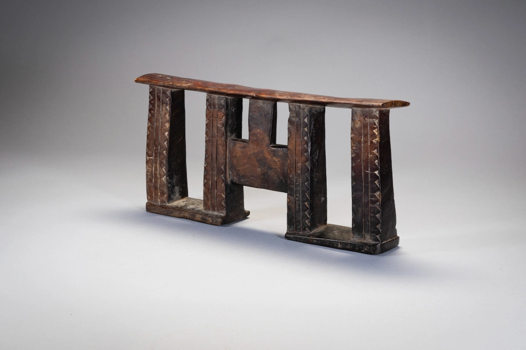 Une forme d’appui-tête répandue au XXe siècle rappelant un visage avec les yeux grands ouverts au centre de la pièce. Ses colonnes sont ornées de triangles.