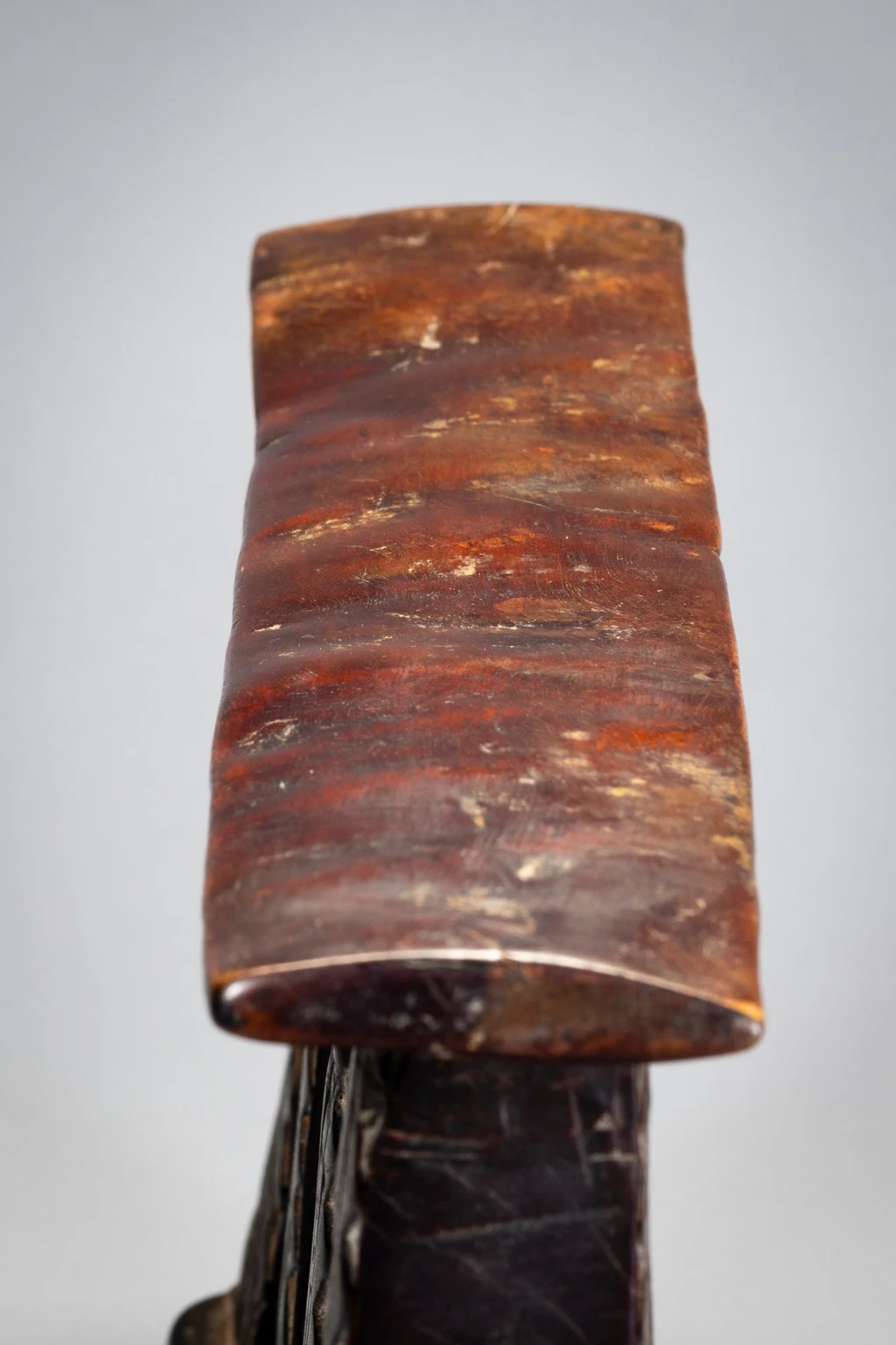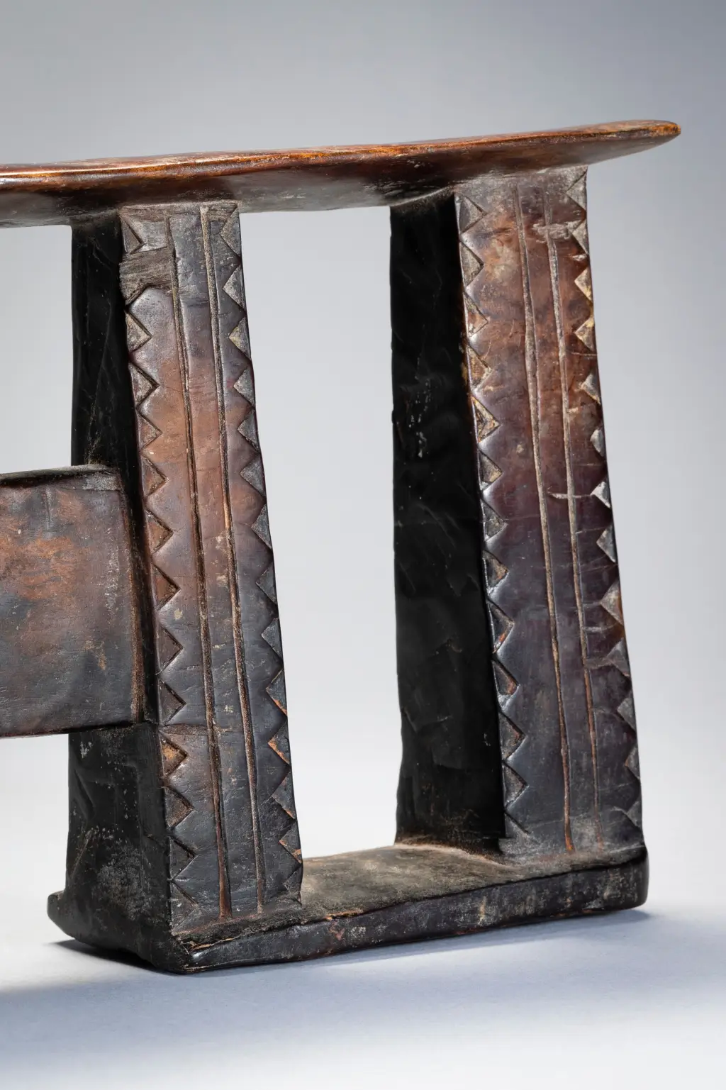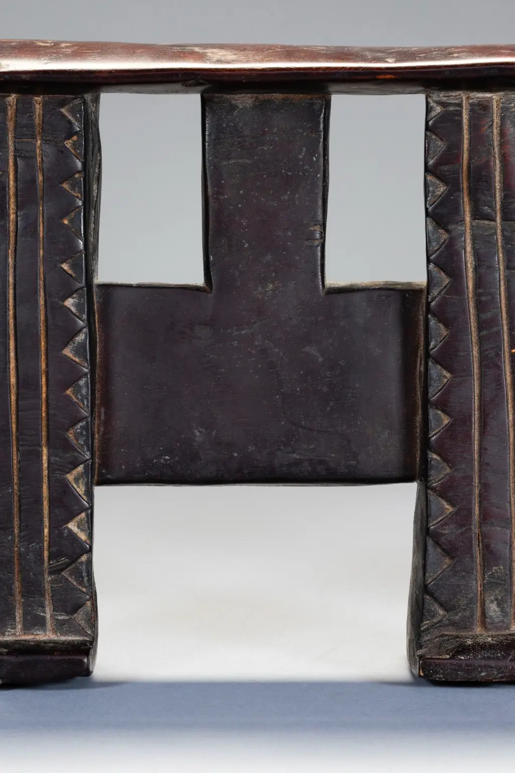 Une forme d’appui-tête répandue au XXe siècle rappelant un visage avec les yeux grands ouverts au centre de la pièce. Ses colonnes sont ornées de triangles.